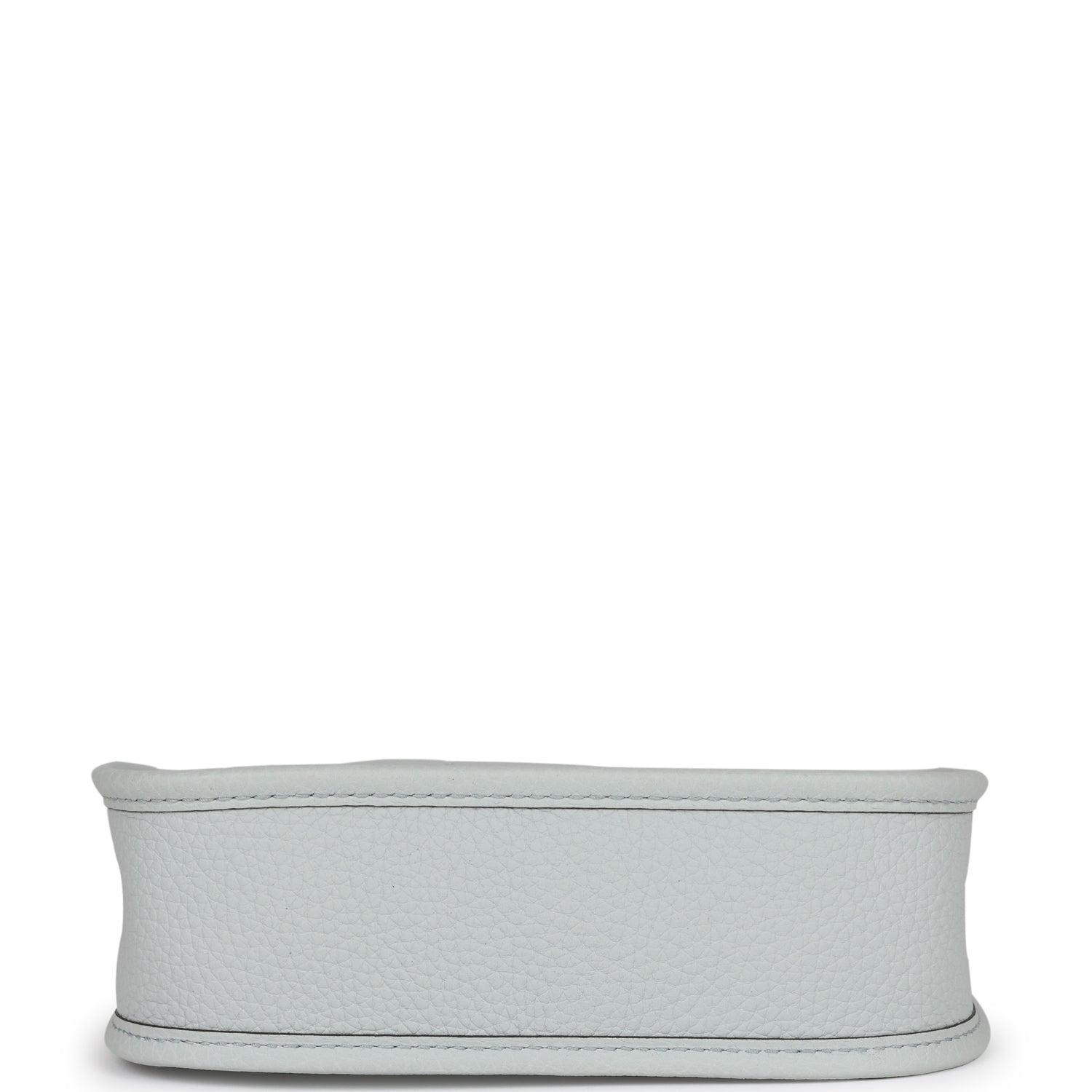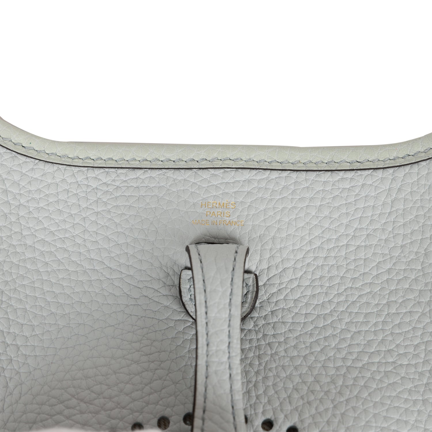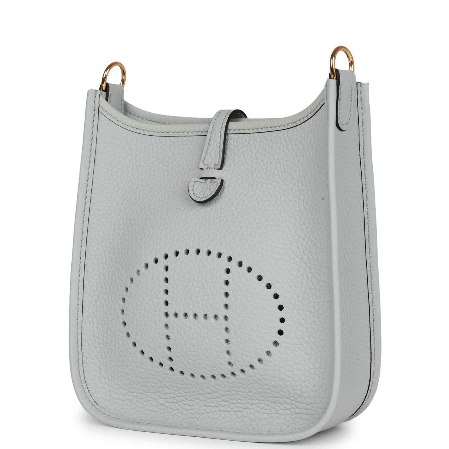 This Evelyne is in Bleu Pale clemence leather with gold hardware, has tonal stitching, pull tab top closure and a Nata removable canvas and leather shoulder/crossbody strap.