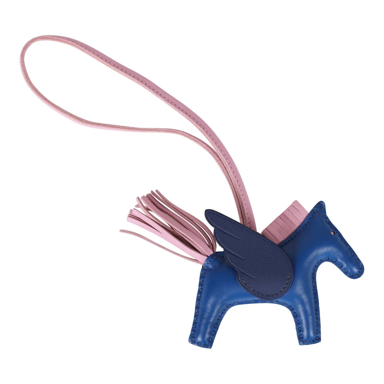 This Pegasus Rodeo bag charm is in Bleu Saphir Milo lambskin leather and accented with a Mauve Sylvester mane and tail, and Bleu Marine wings.