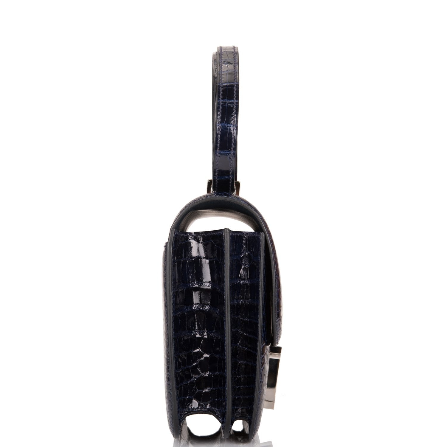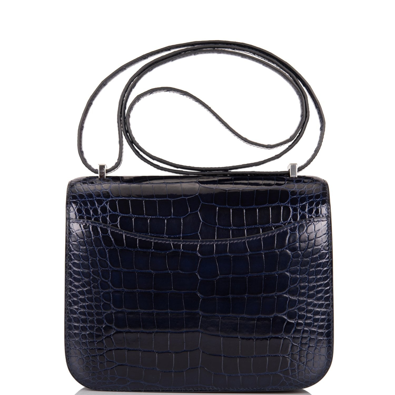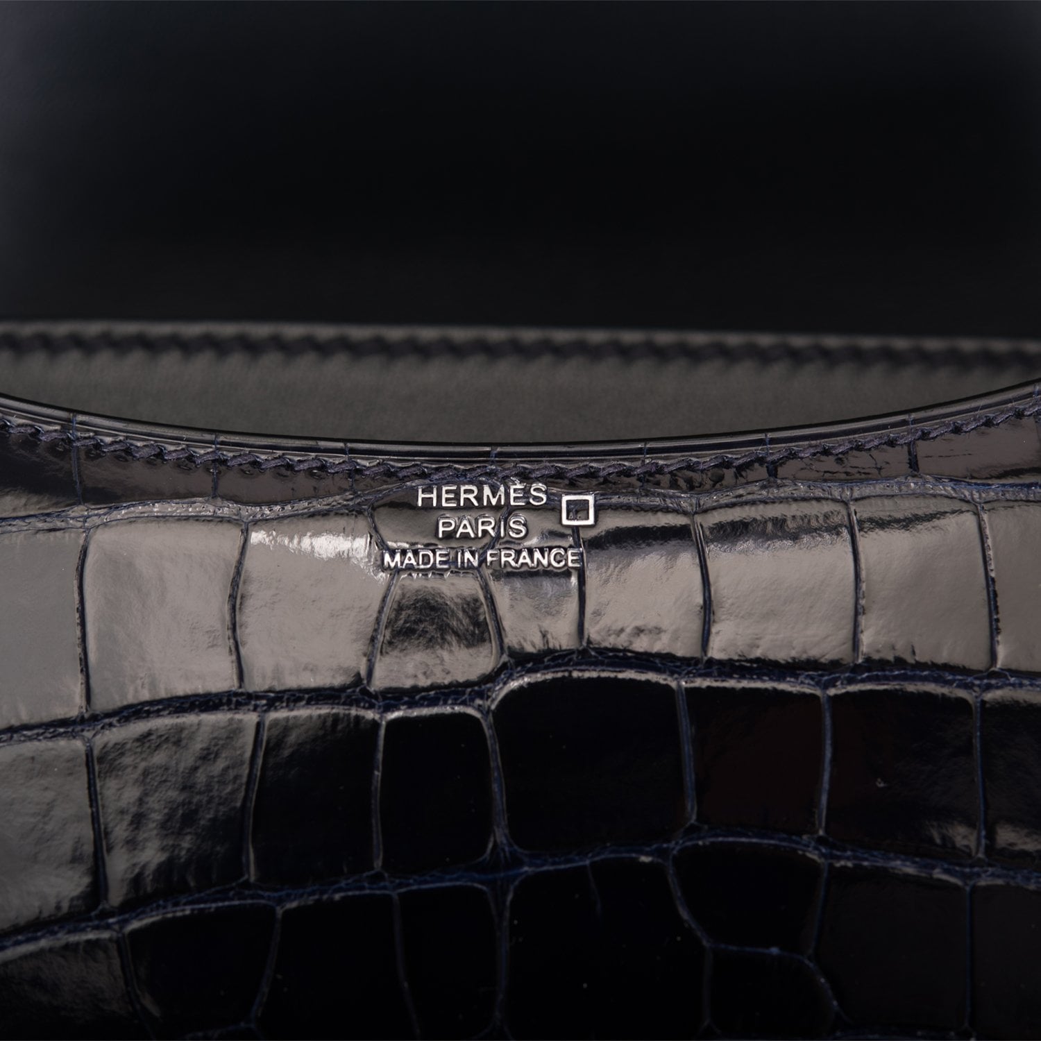This Constance is in Bleu Marine shiny Mississippiensis alligator and Ombre Lizard Marquete with palladium hardware and has tonal stitching, ombre lizard "H" snap lock closure and adjustable shoulder strap.