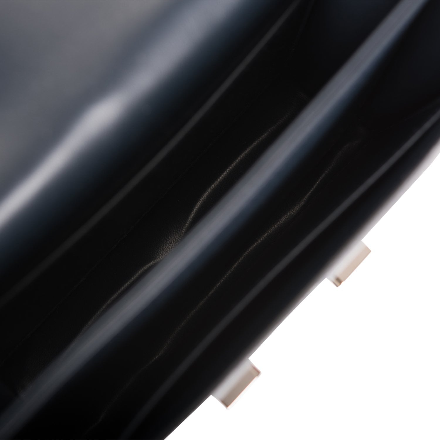 The interior is lined with Bleu Marine chevre and has an open pocket on the front wall, a center divide, and a slit pocket on the back wall.