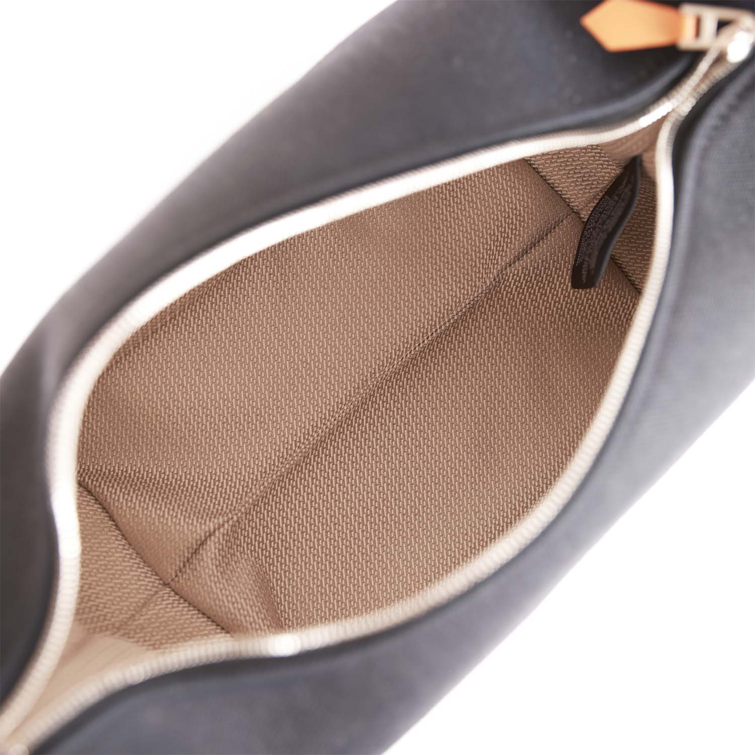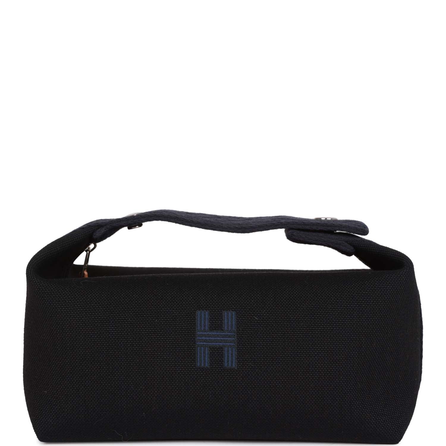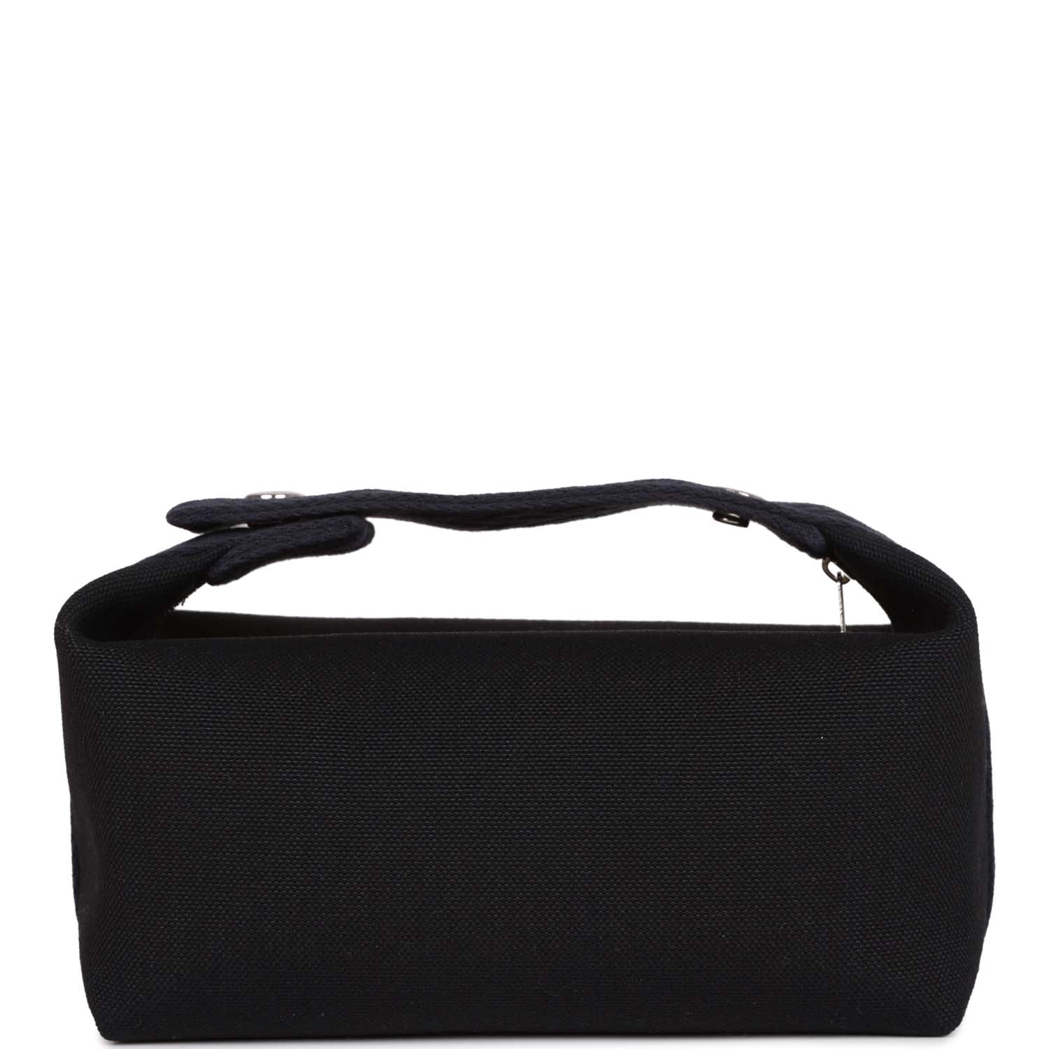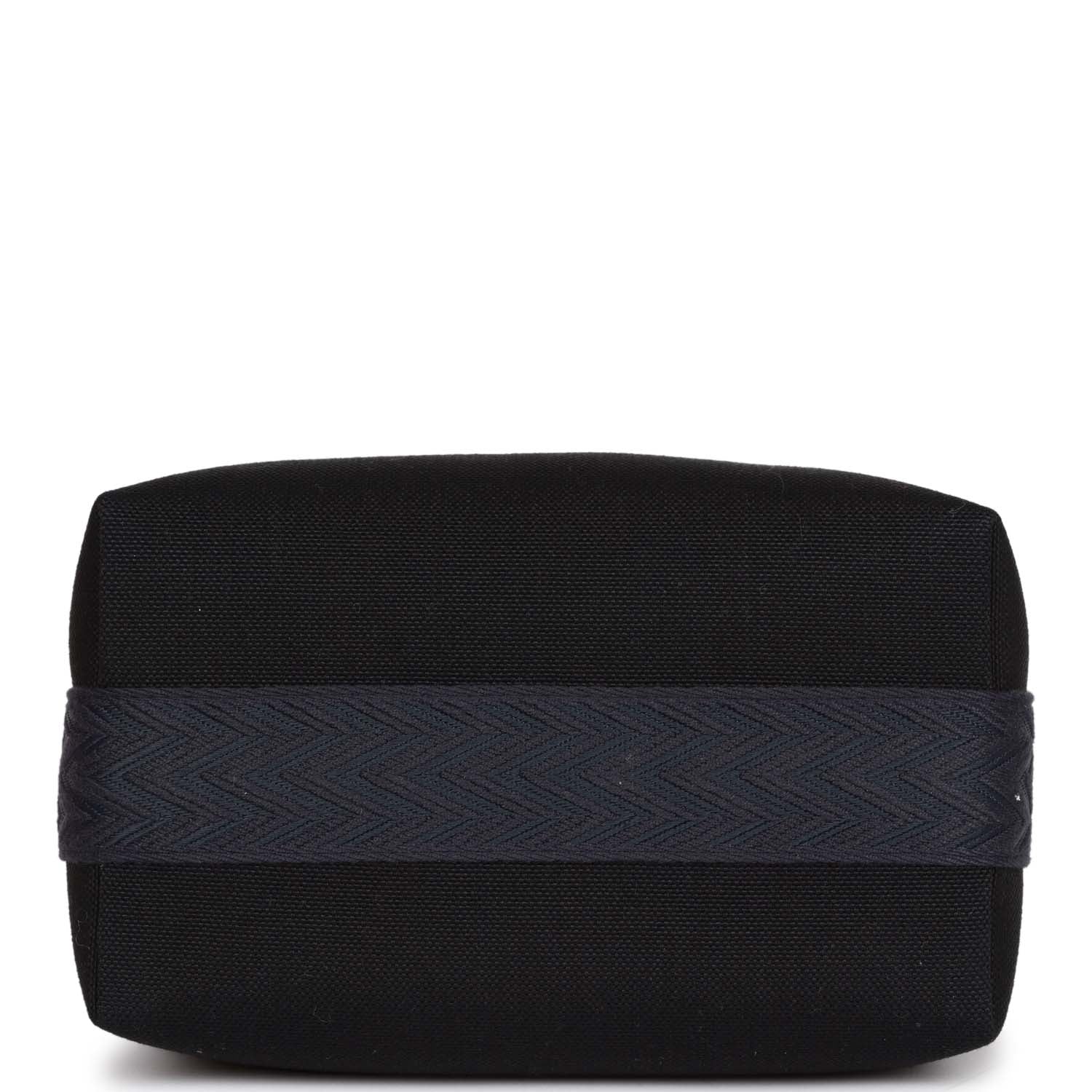This Bride-A-Brac is in Black Militaire canvas with a woven navy strap, palladium zipper with leather pull tab, and a black and navy H embroidered on the front.