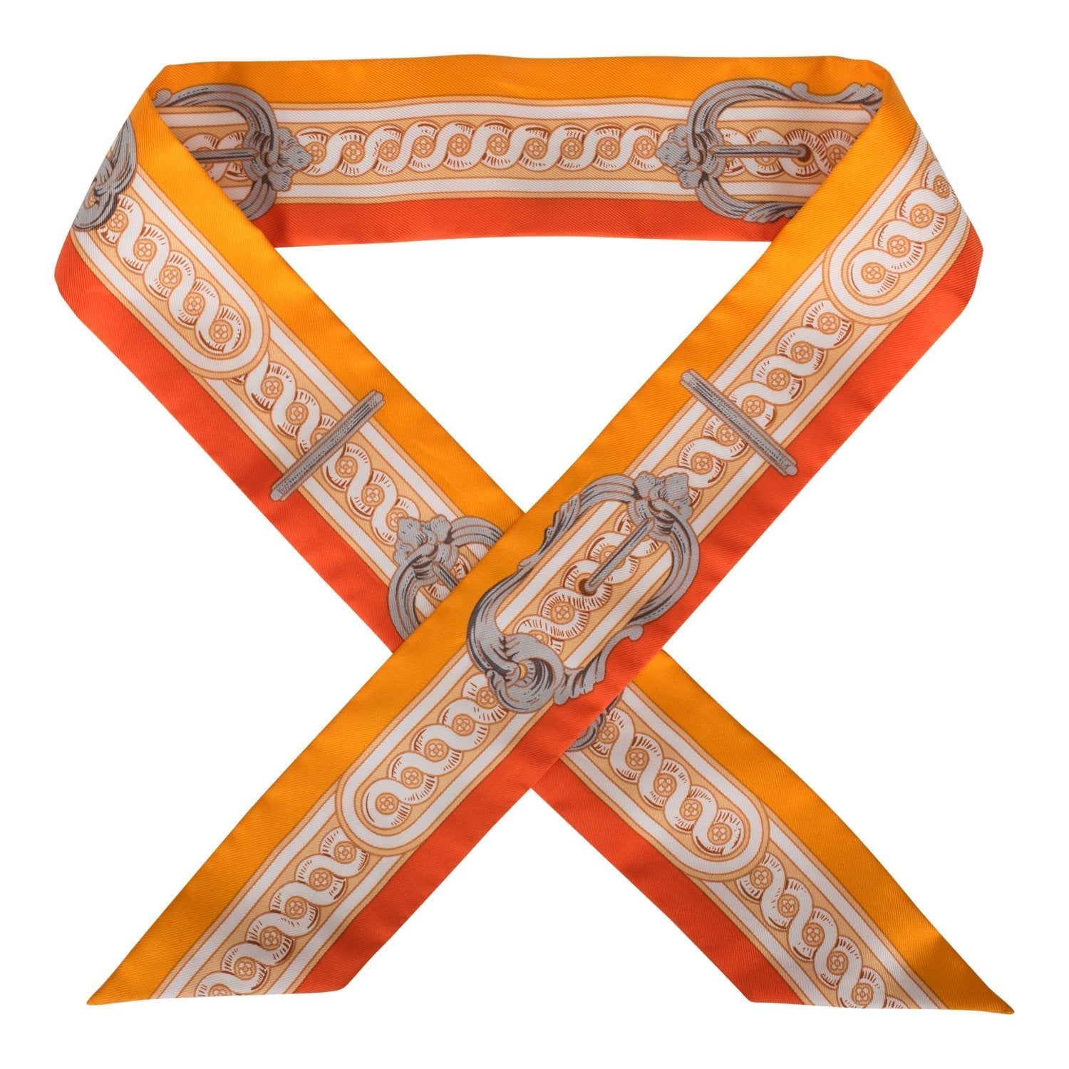 Hermes "Bride de Cour" twilly of silk twill designed by Françoise de La Perrière in a vermillion colorway.