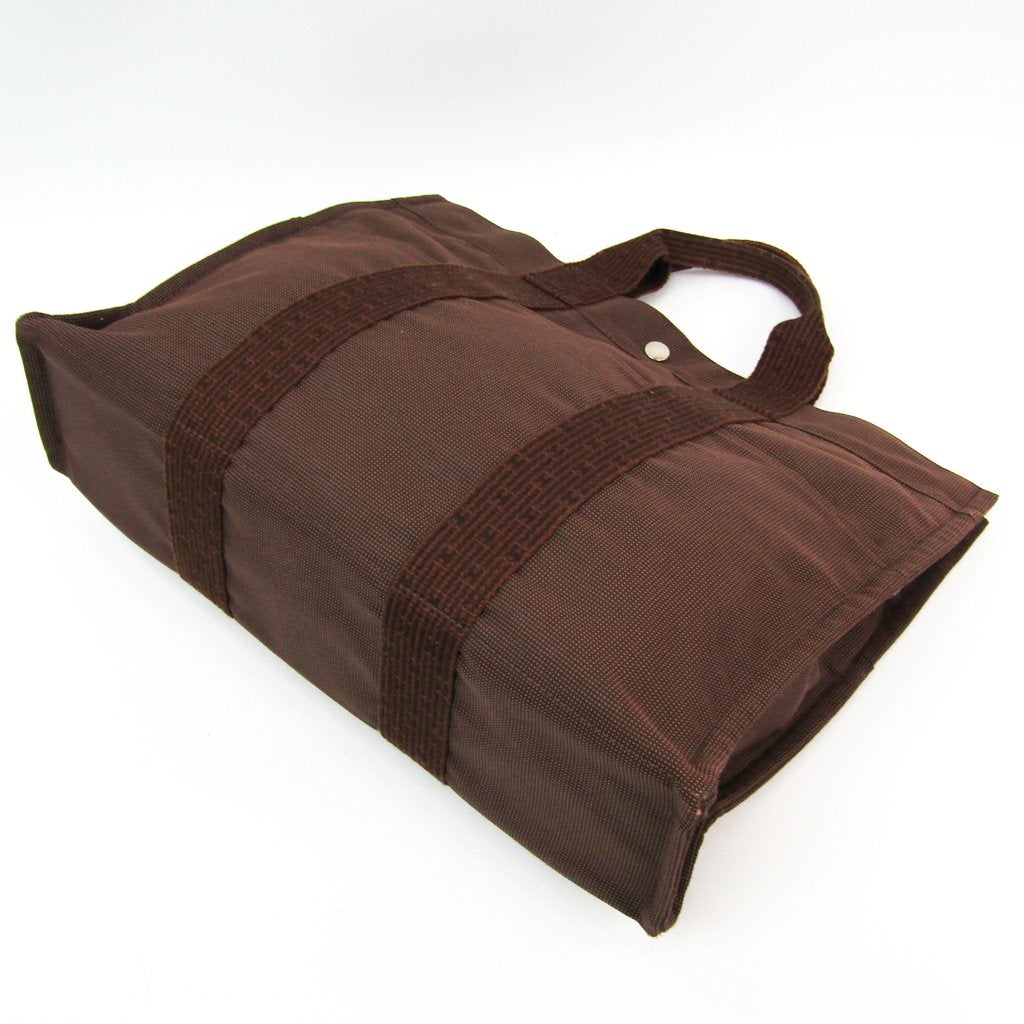 This is an , HERMES Herline MM Tote. It's the medium-sized Herline bag. It features a brown canvas with silver-tone hardware, canvas handles, an open pocket, and a double zip closure. It's a chic Hermes tote for every day.
