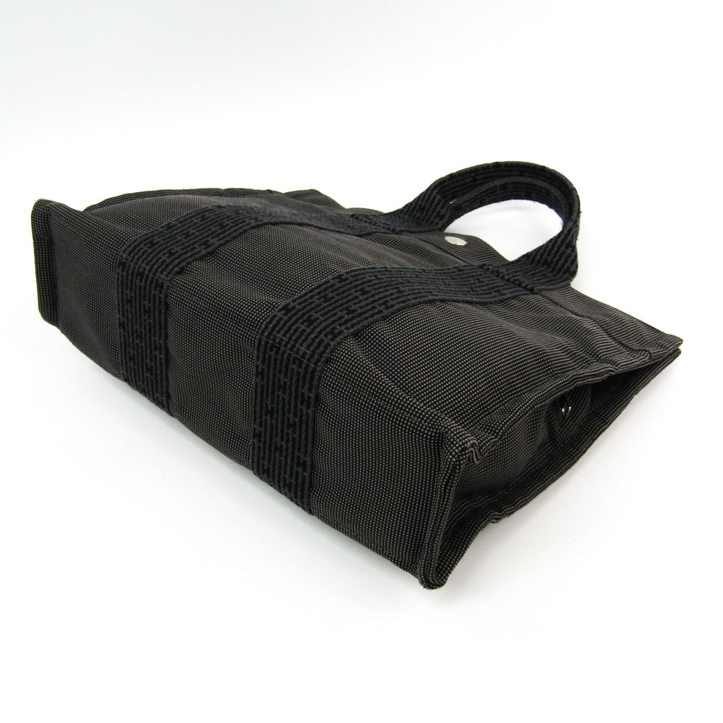This is an , HERMES Herline PM Tote. It features a gray cotton canvas with silver-tone hardware, canvas handles, an interior zip pocket, and a double zip closure. It's a chic Hermes tote for every day.