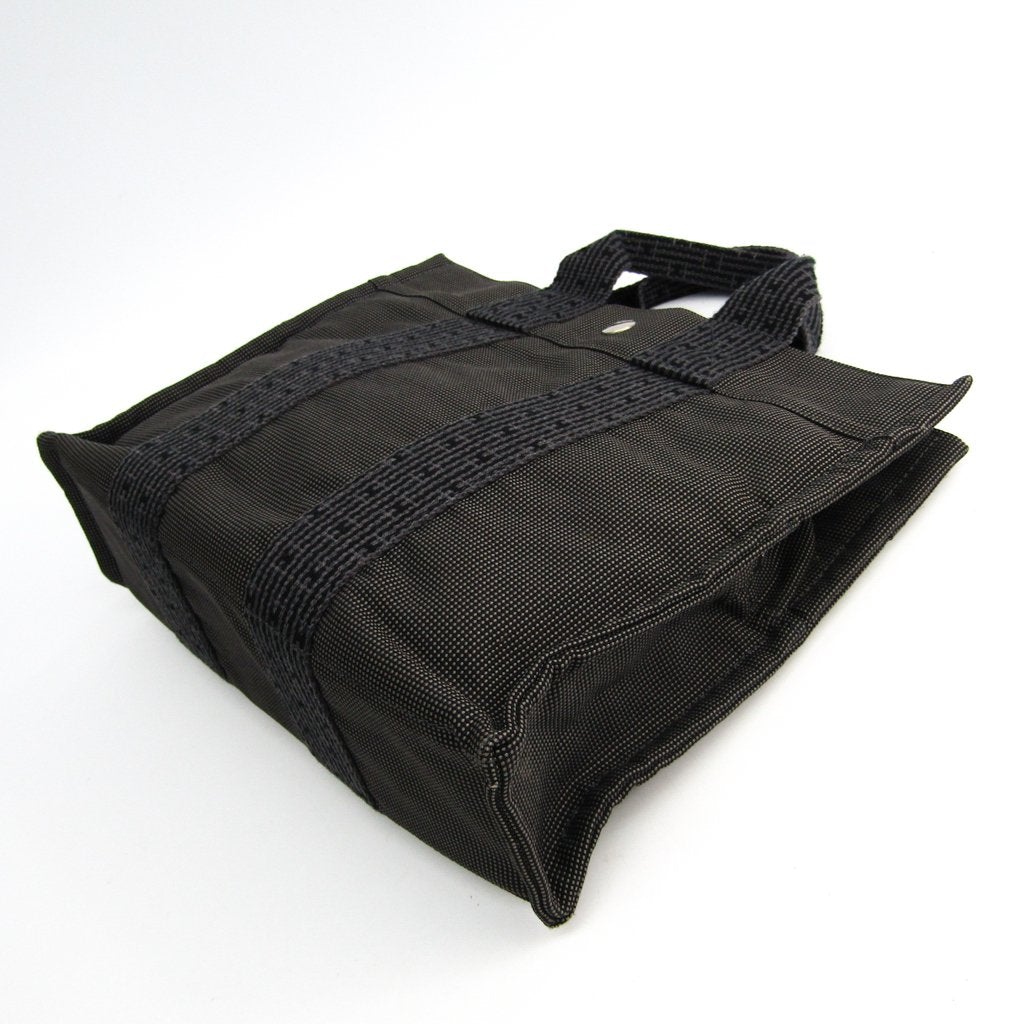 This is an , HERMES Herline PM Tote. It features a gray canvas with silver-tone hardware, canvas handles, an open pocket, and a double zip closure. It's a chic Hermes tote for every day.