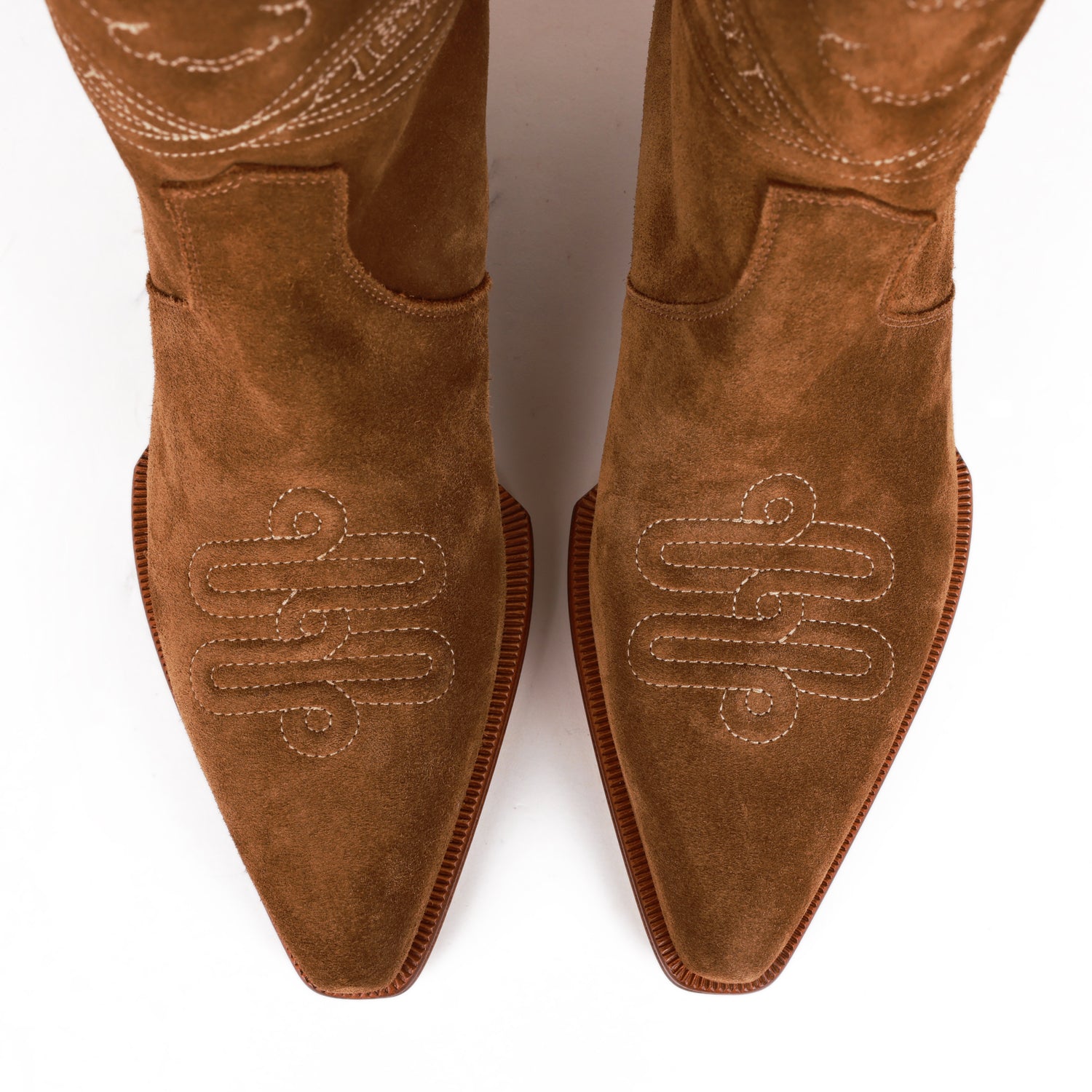 This pair of "Folk 35" Cowboy Boots are in brown suede with contrast "Brides de Gala" embroidery, tonal stitching and feature a brown leather sole and heel.