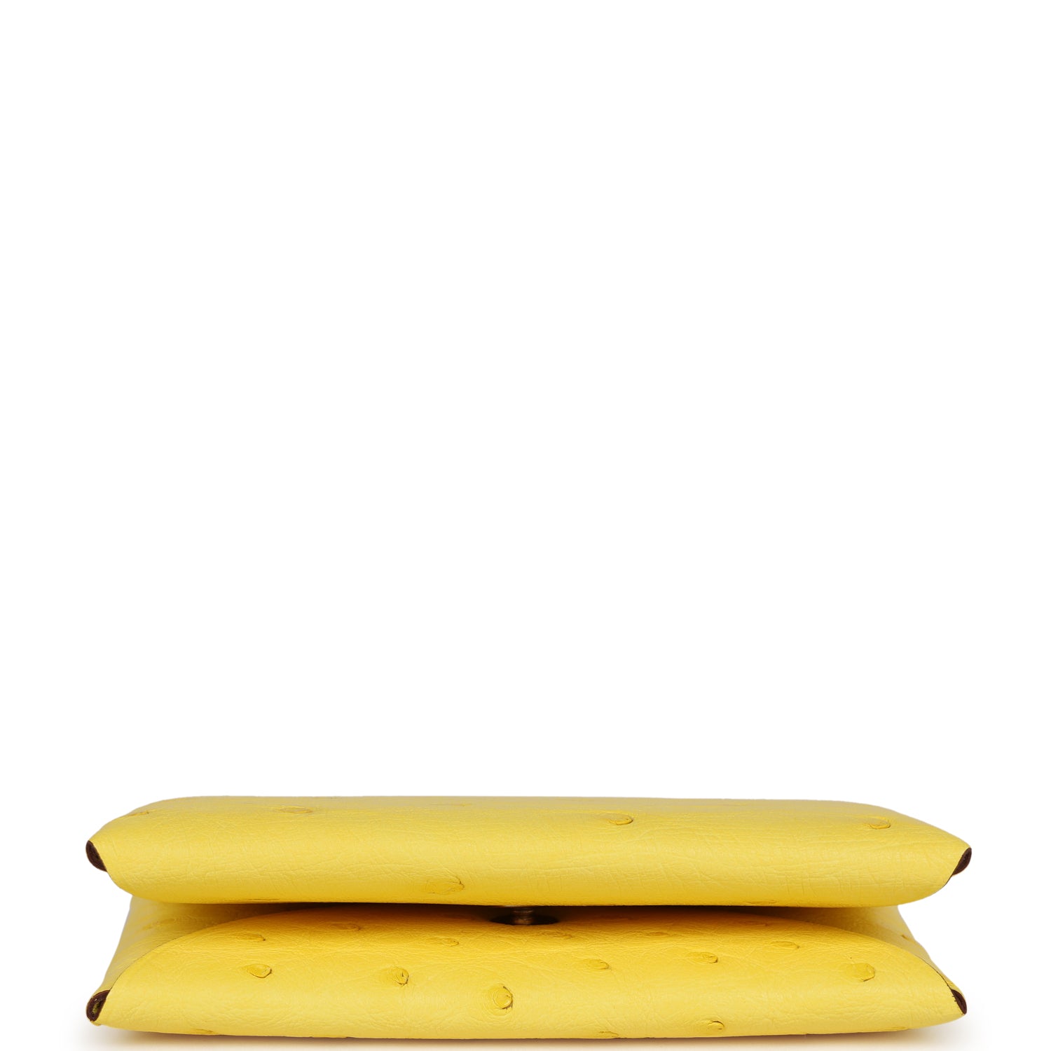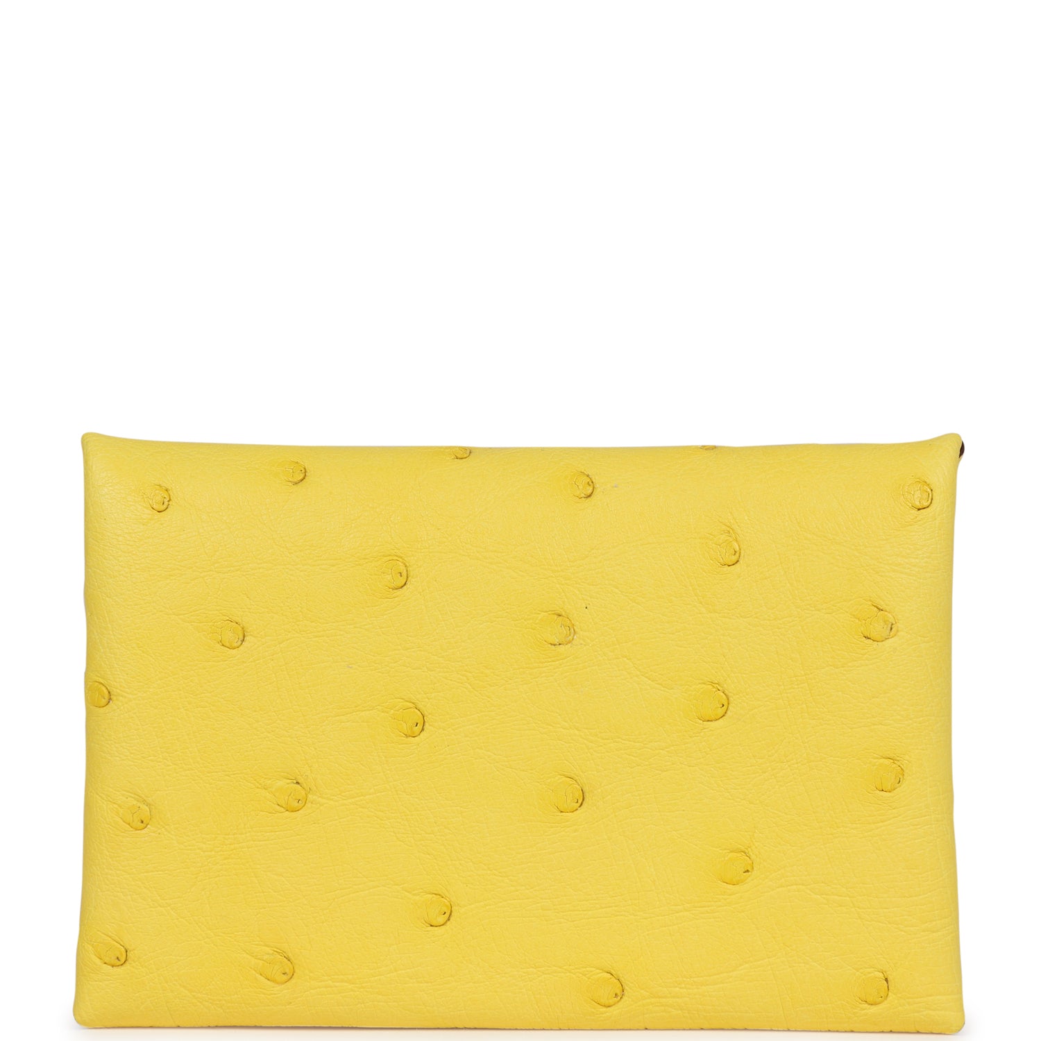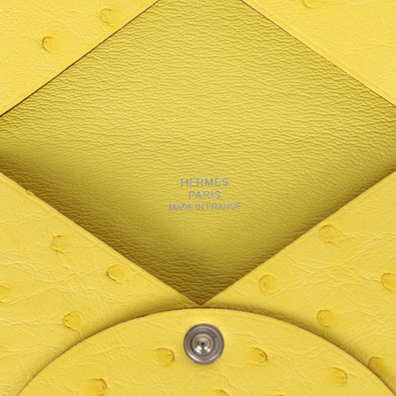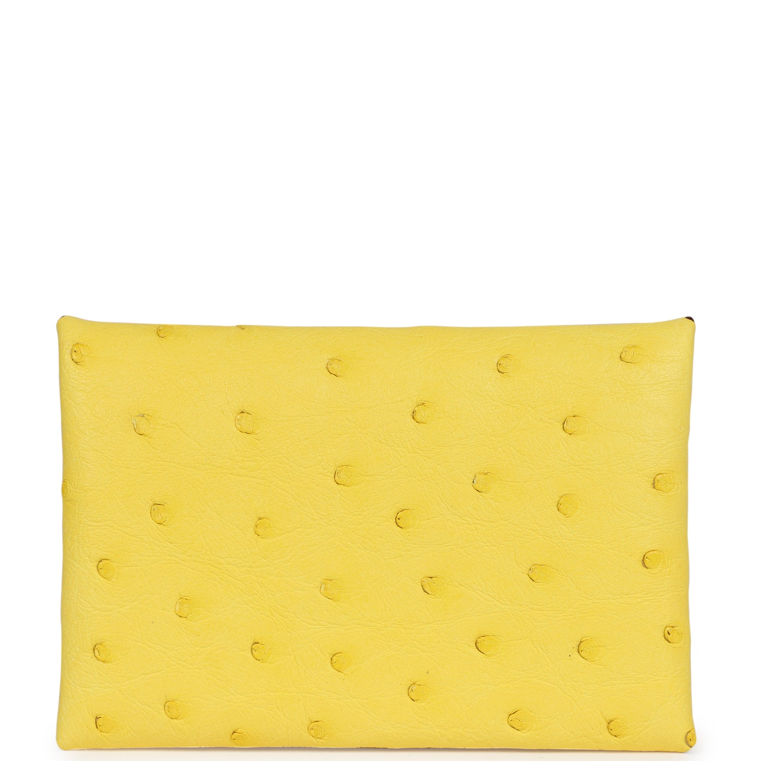 This Calvi cardholder wallet is in Jaune Citron ostrich with palladium hardware and a front snap closure.
