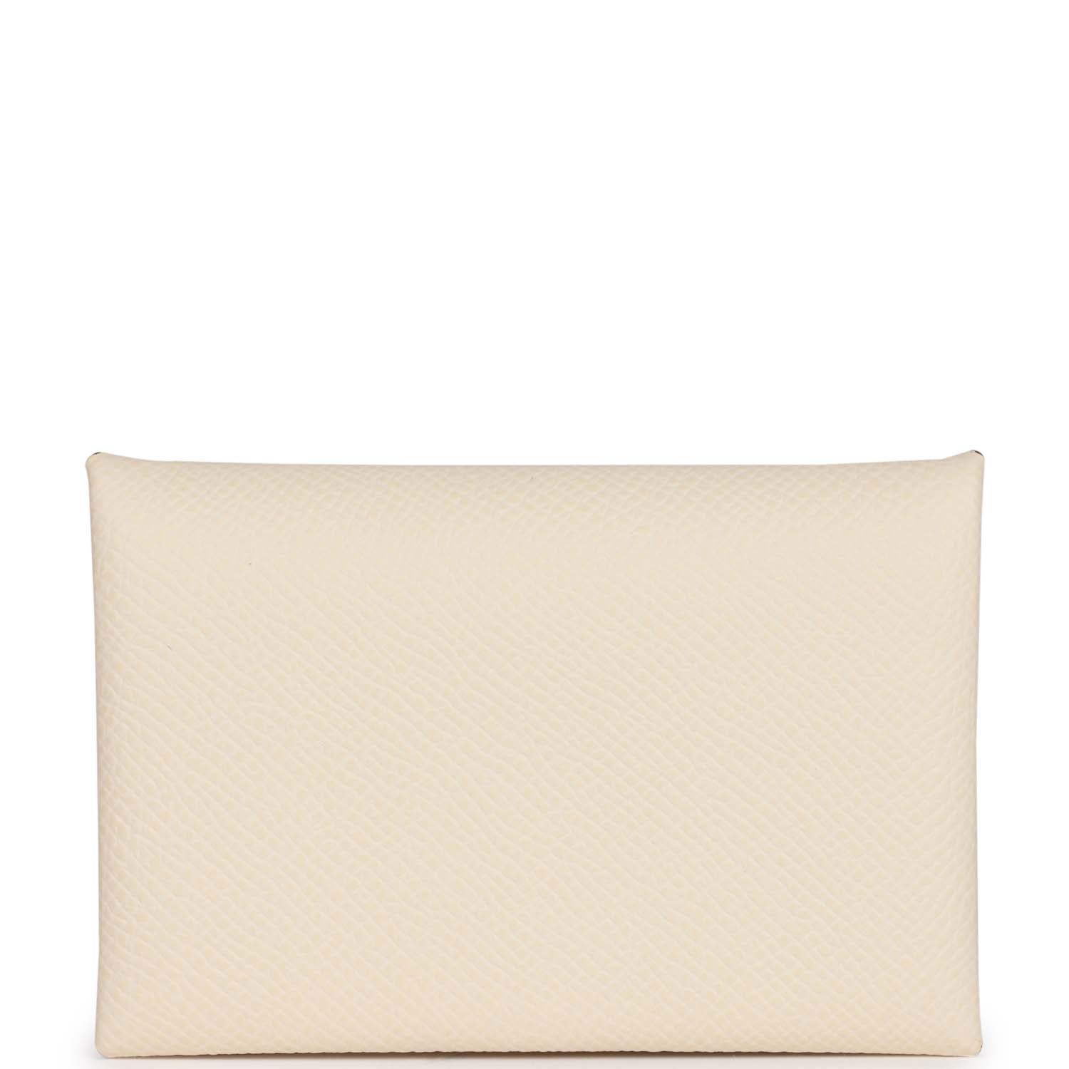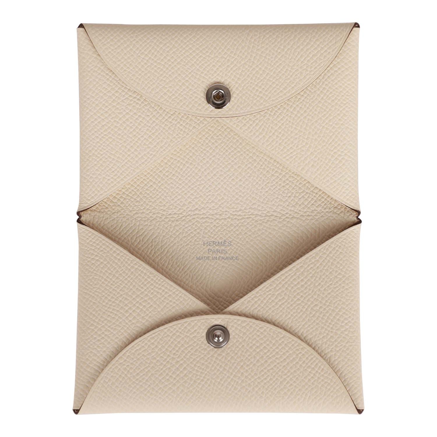 This Calvi cardholder wallet is in Nata epsom with palladium hardware, tonal stitching, and a front snap closure.