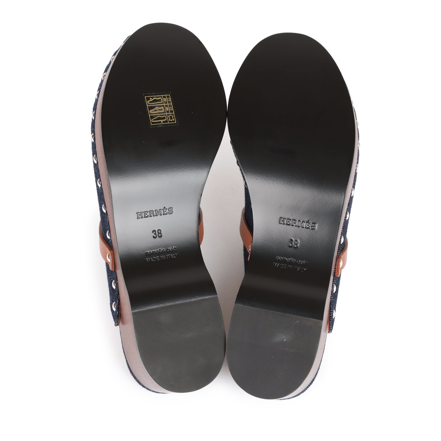 This pair of Carlotta Mules are in Bleu Brut Denim and Gold Calfskin and features palladium plated kelly closure buckles.