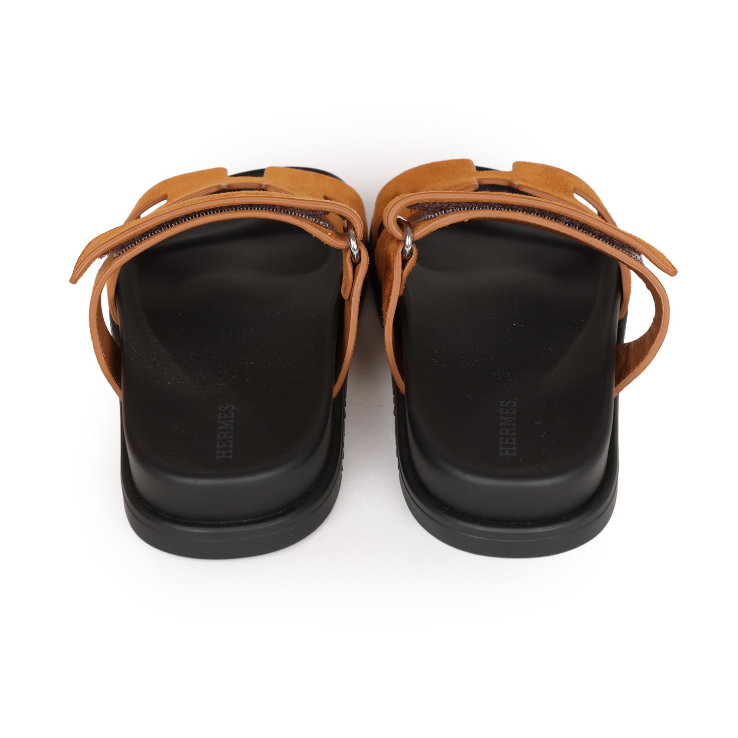 This pair of Chypre sandals are in brown suede with a black rubber sole and feature the iconic H and a velcro crossover strap.