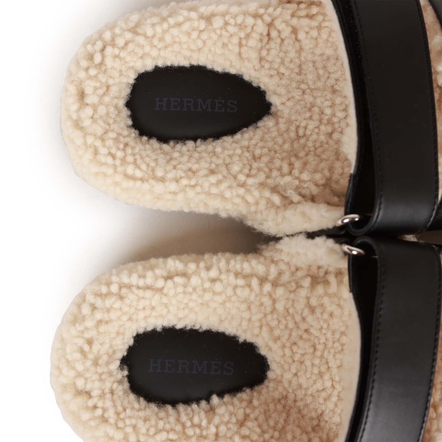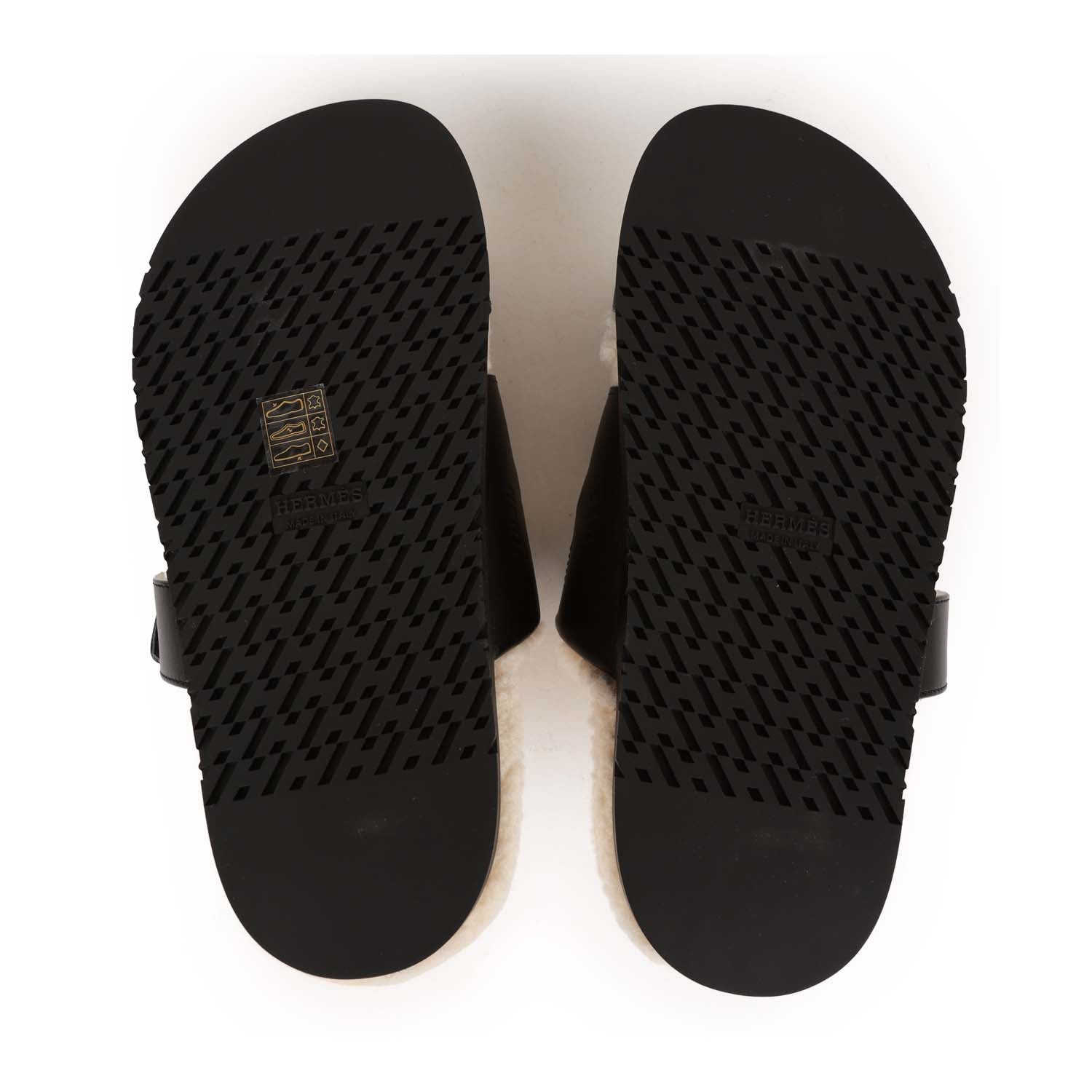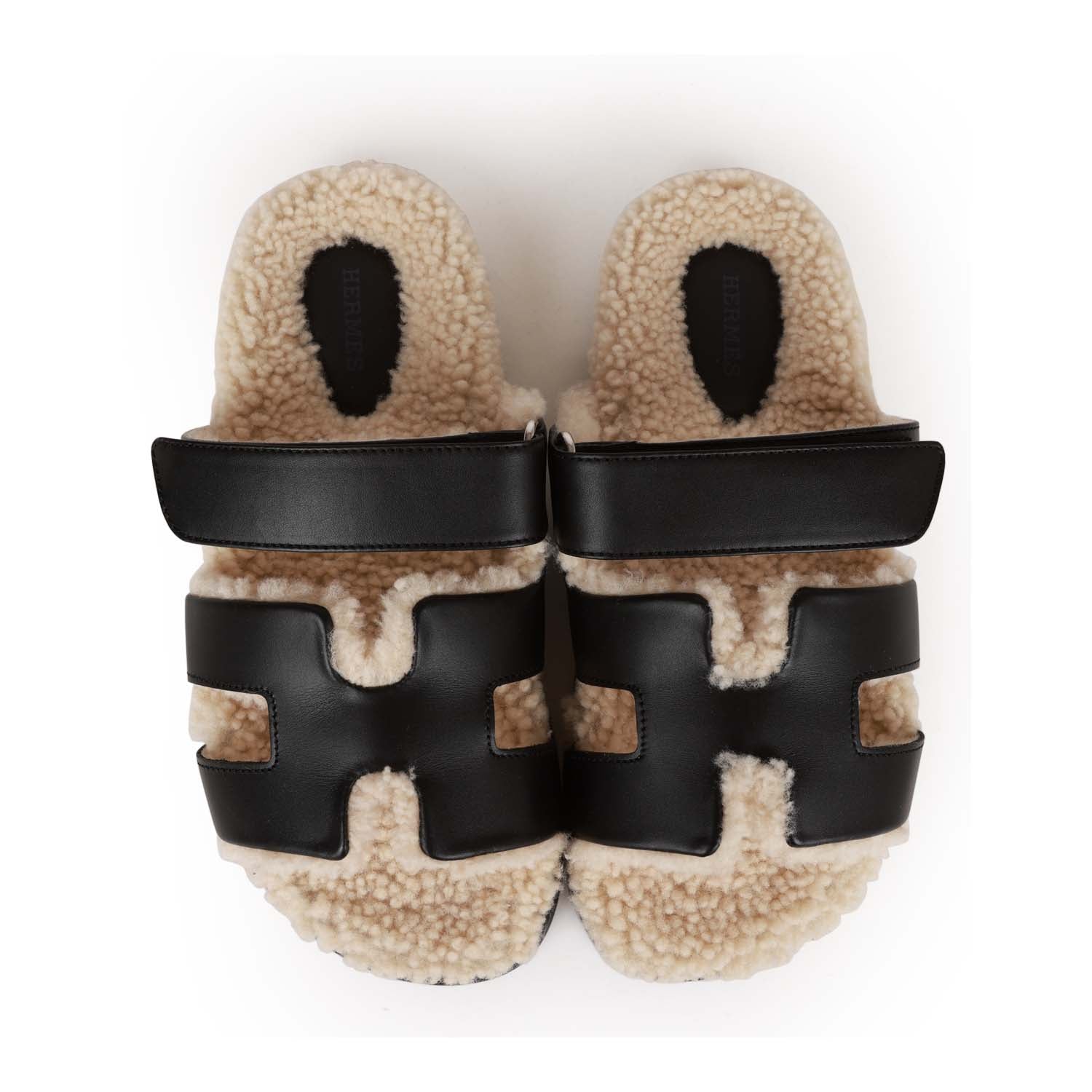 This pair of Hermes Chypre sandals are in Black and Ecru shearling and feature the iconic H and a velcro crossover strap with a rubber sole.