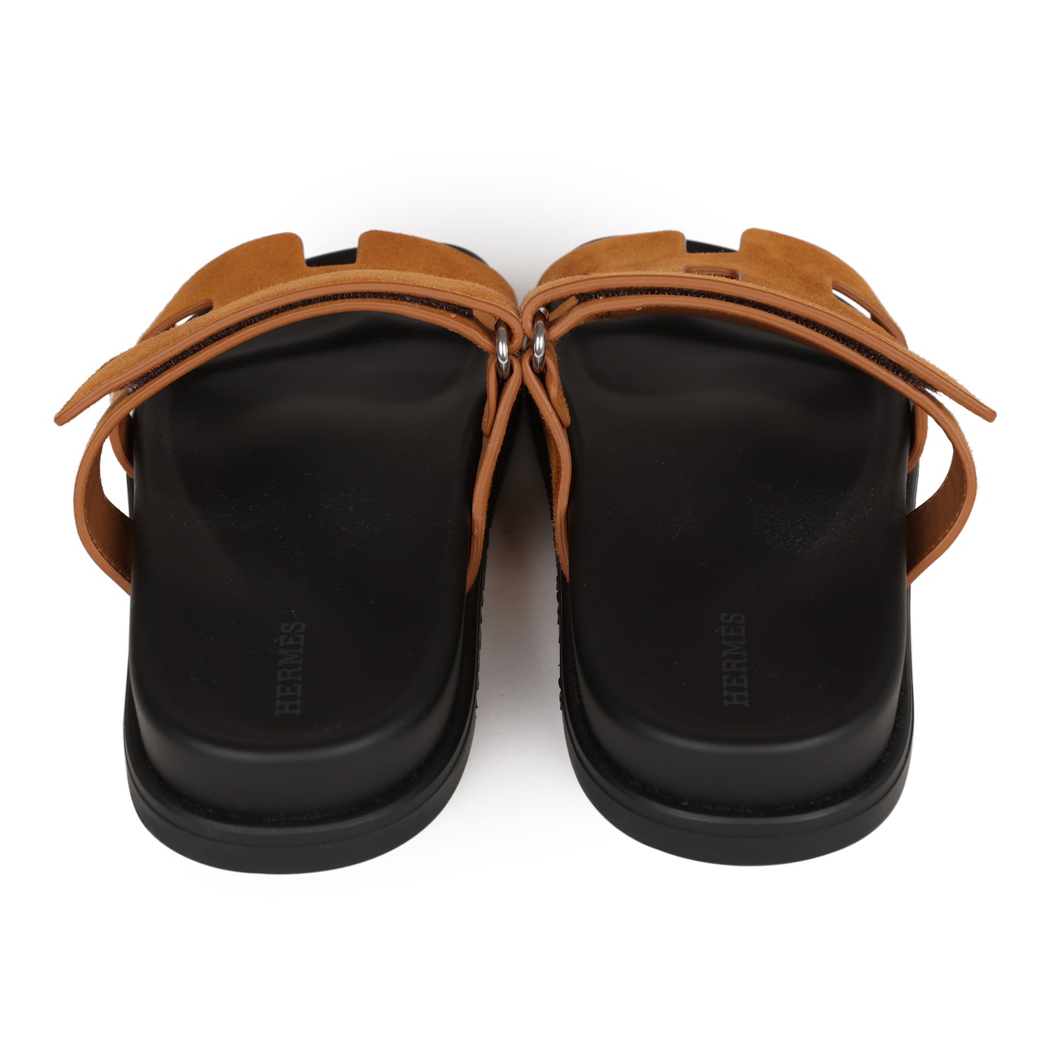 This pair of Hermes Chypre Goatskin sandals are in Kraft Suede with black rubber sole, adjustable strap, and silver hardware in size 38 EU.