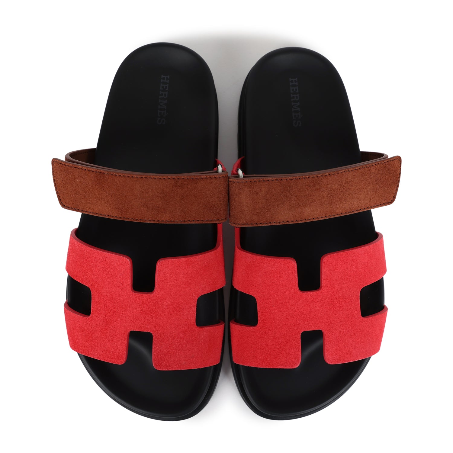 This pair of Hermes Chypre Techno sandals are in Rouge Cinetique and Gold sNewe leather with black rubber soles, adjustable straps and palladium hardware in a size 37 EU.