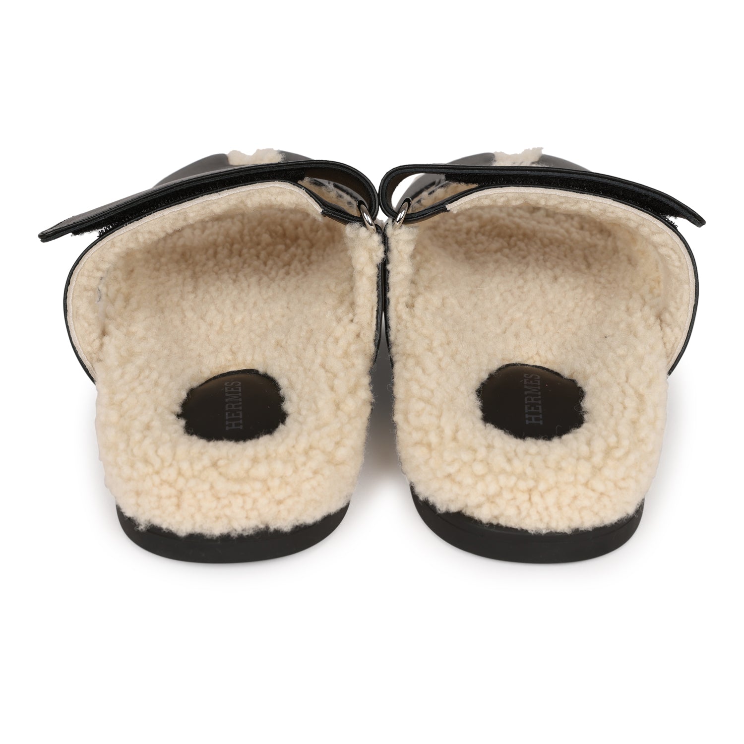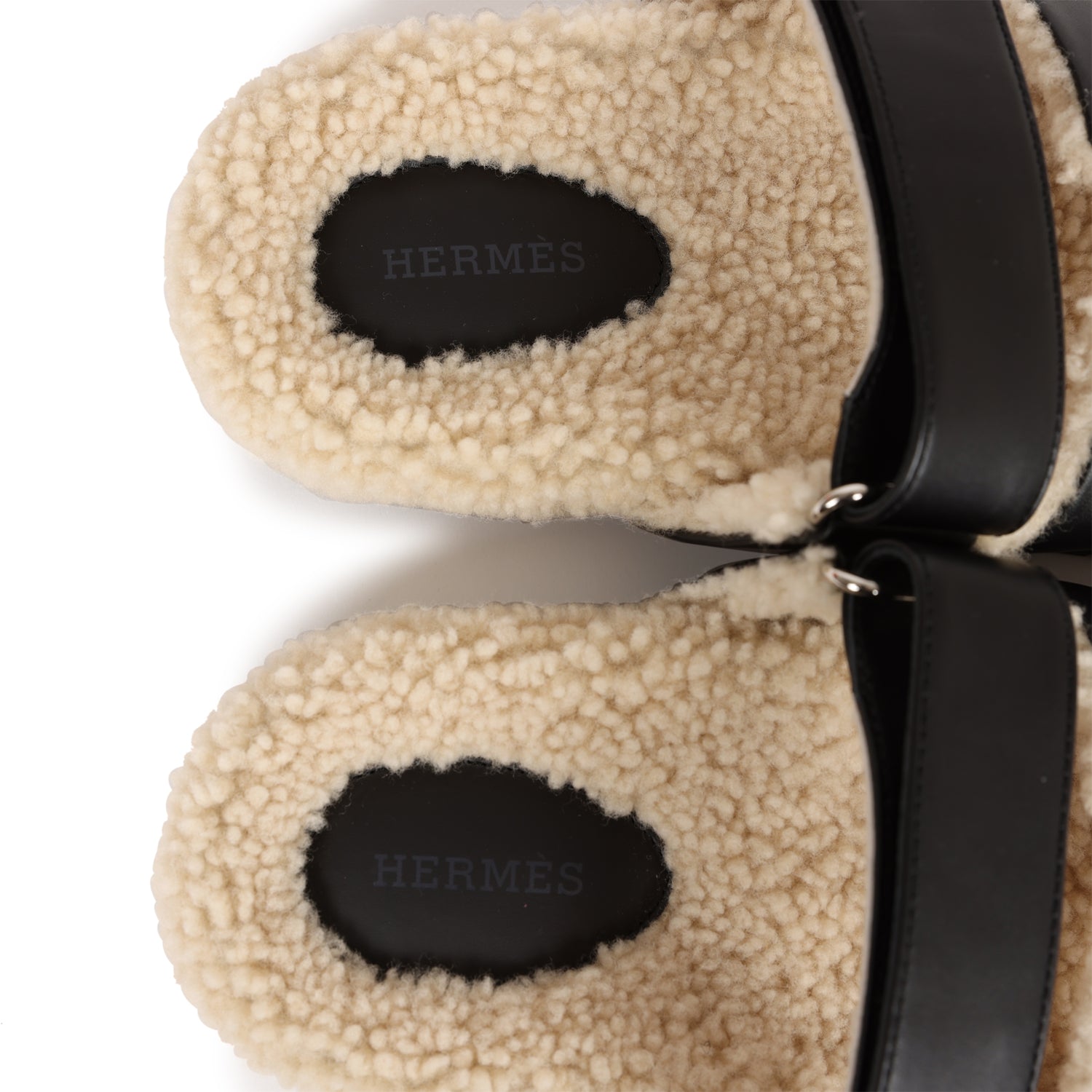 This pair of Chypre Techno Sandals are in Black and Ecru Shearling with Palladium hardware and black rubber sole.