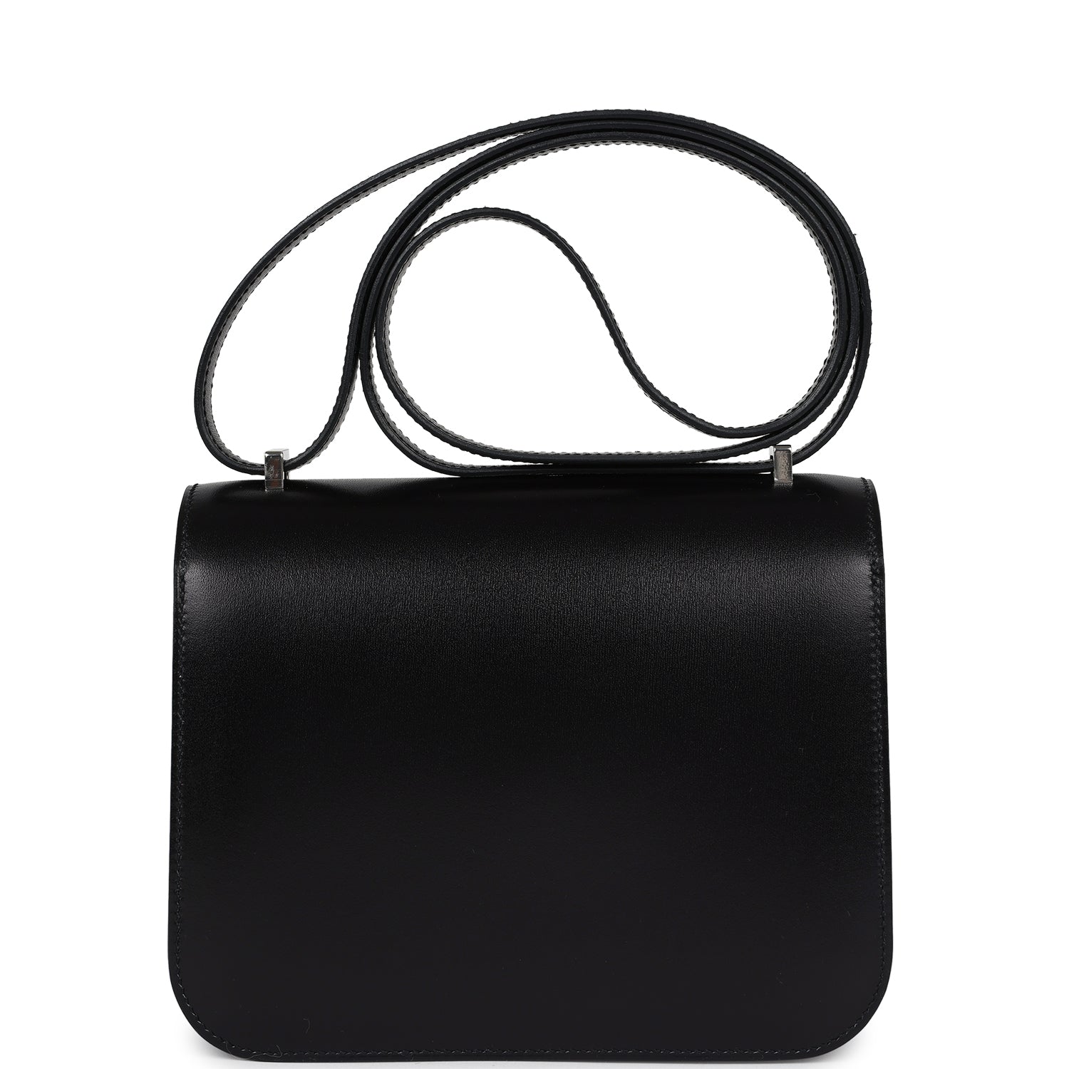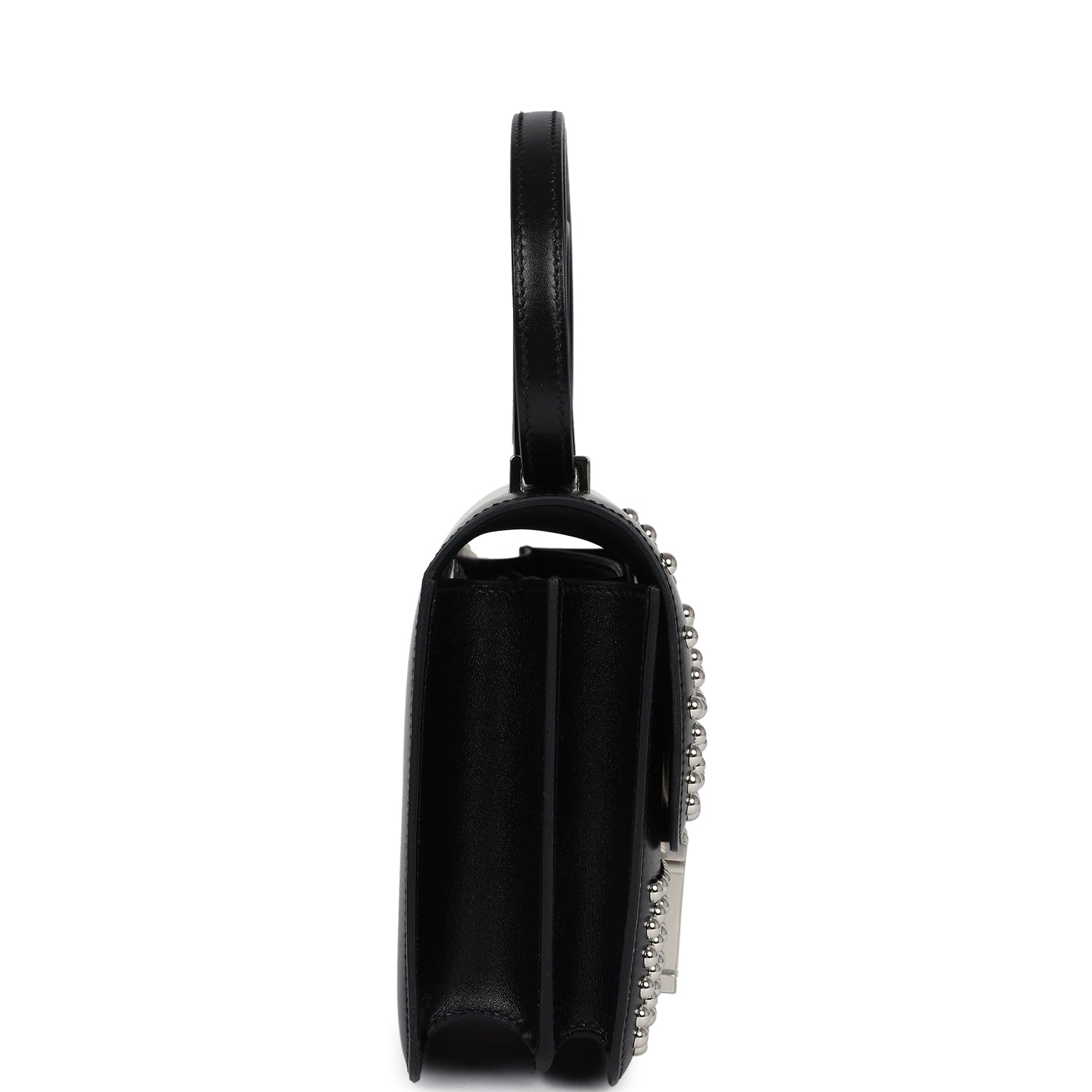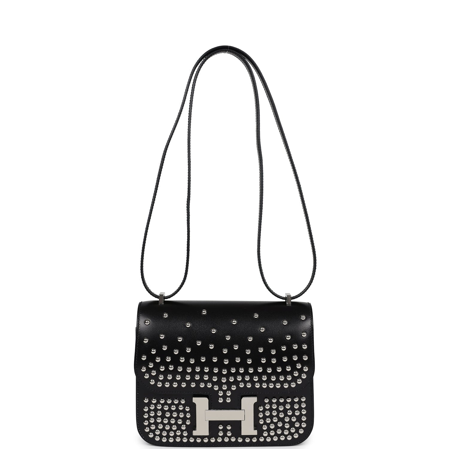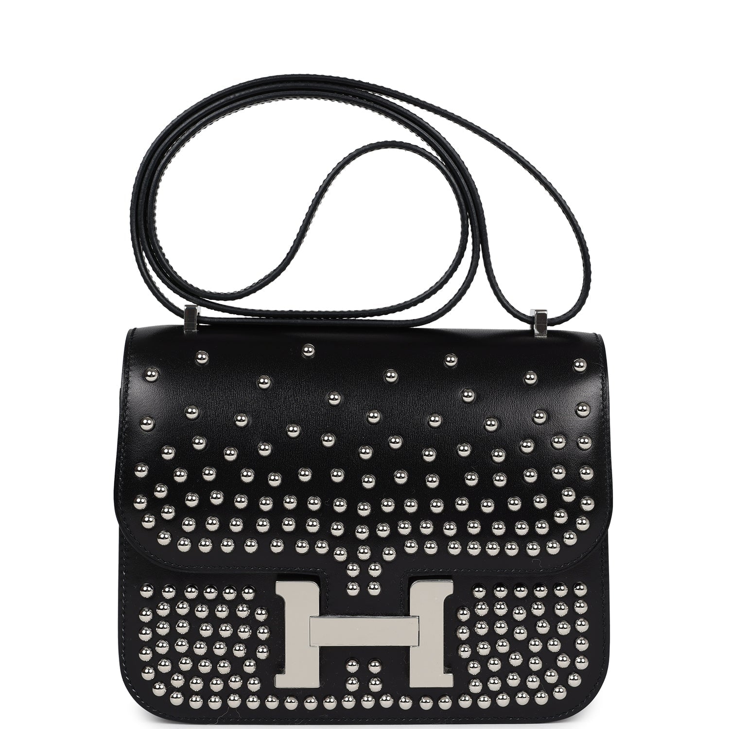 This Limited Edition Constance Clouté bag is in Black box calf leather with palladium hardware and palladium rounds studs on the front with tonal stitching, a metal "H" snap lock closure and adjustable shoulder strap.