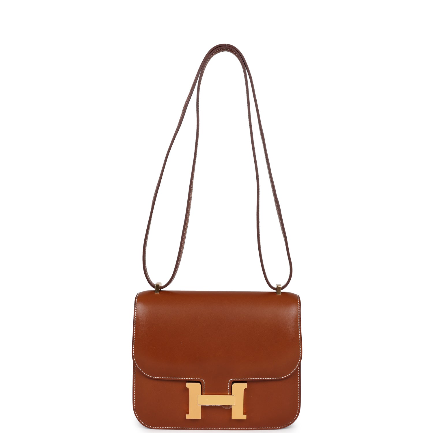 This Constance 1-18 is in Fauve Barenia leather with gold hardware and has contrast stitching, a metal "H" snap lock closure and adjustable shoulder strap.