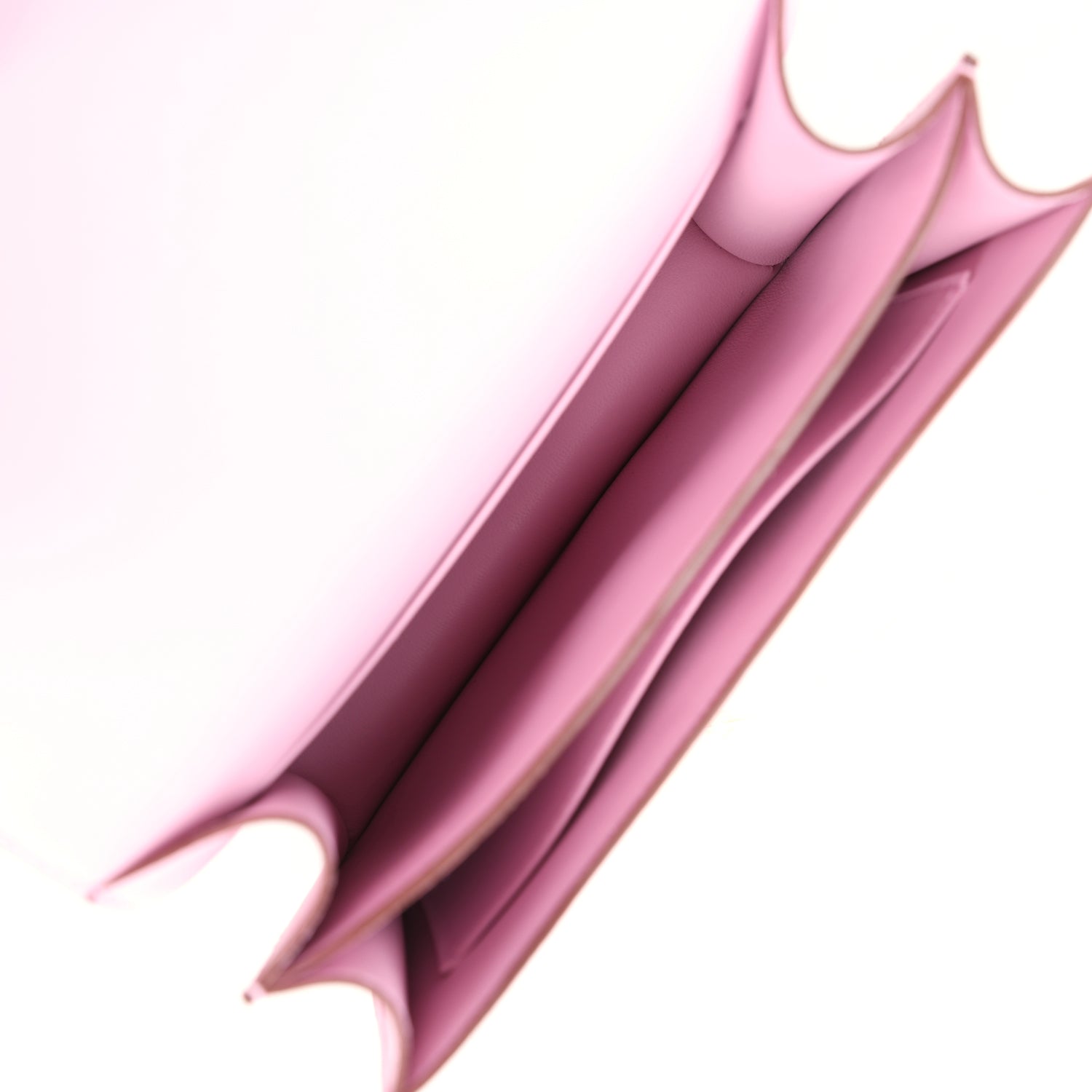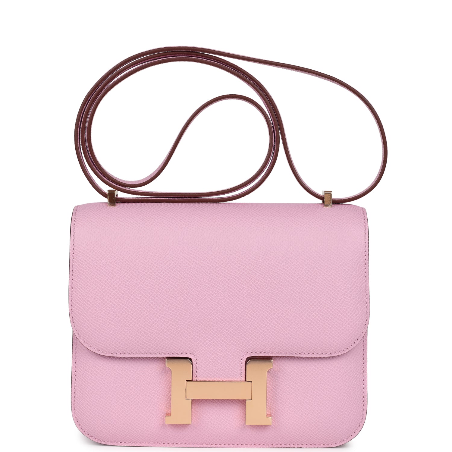 This Constance is in Mauve Sylvestre epsom leather with rose gold hardware and has tonal stitching, a metal "H" snap lock closure and adjustable shoulder strap.