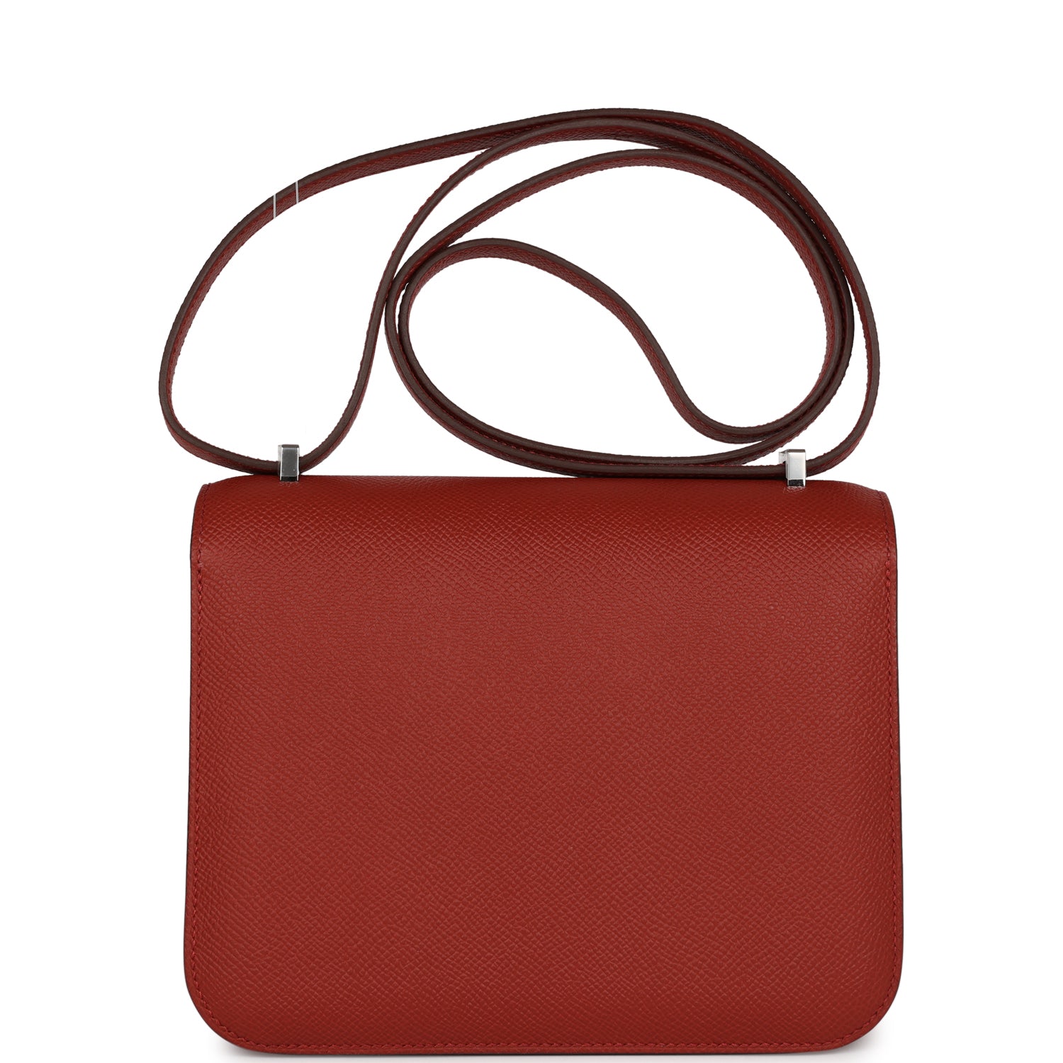 This Constance is in Rouge Venetian epsom leather with palladium hardware and has tonal stitching, a metal "H" snap lock closure and adjustable shoulder strap.