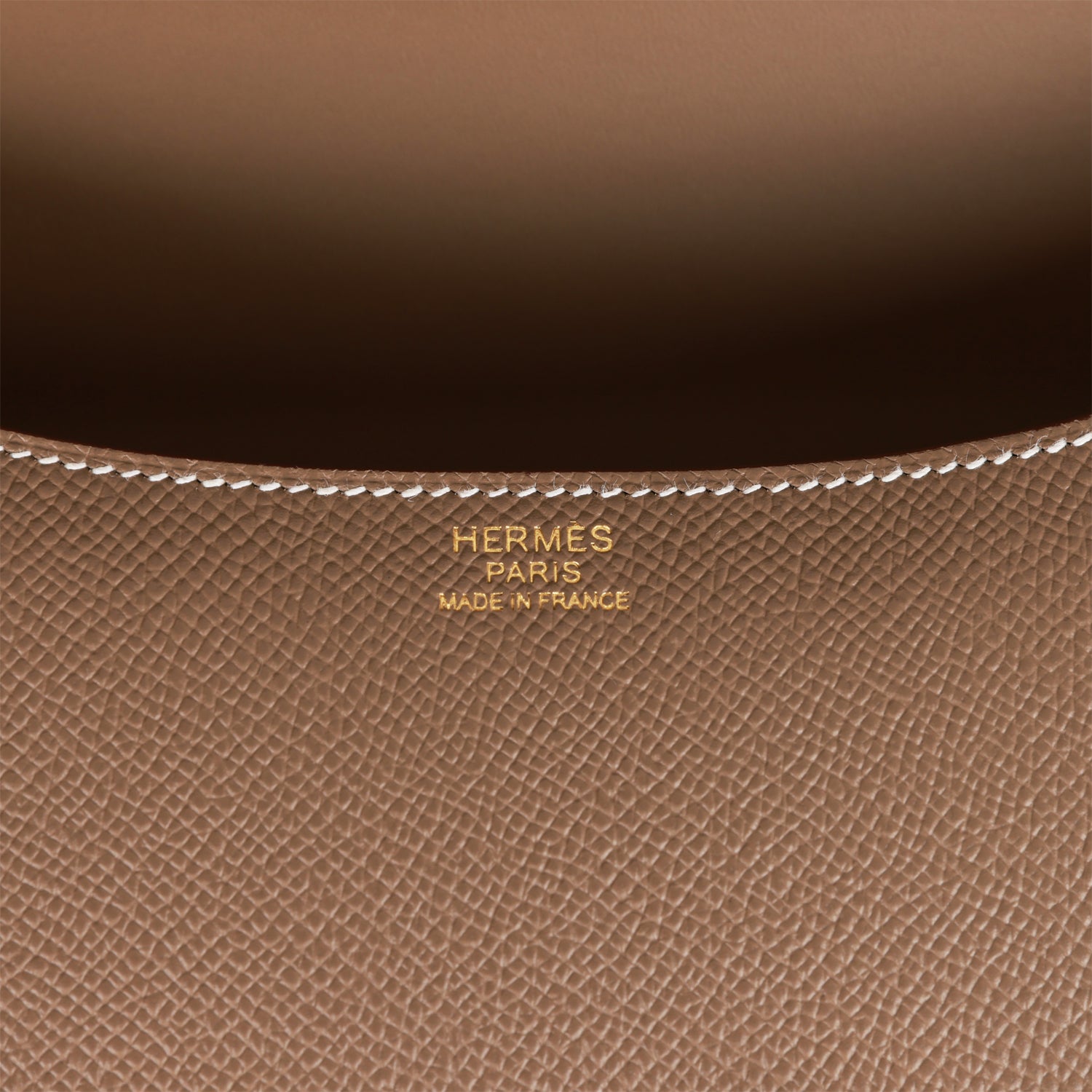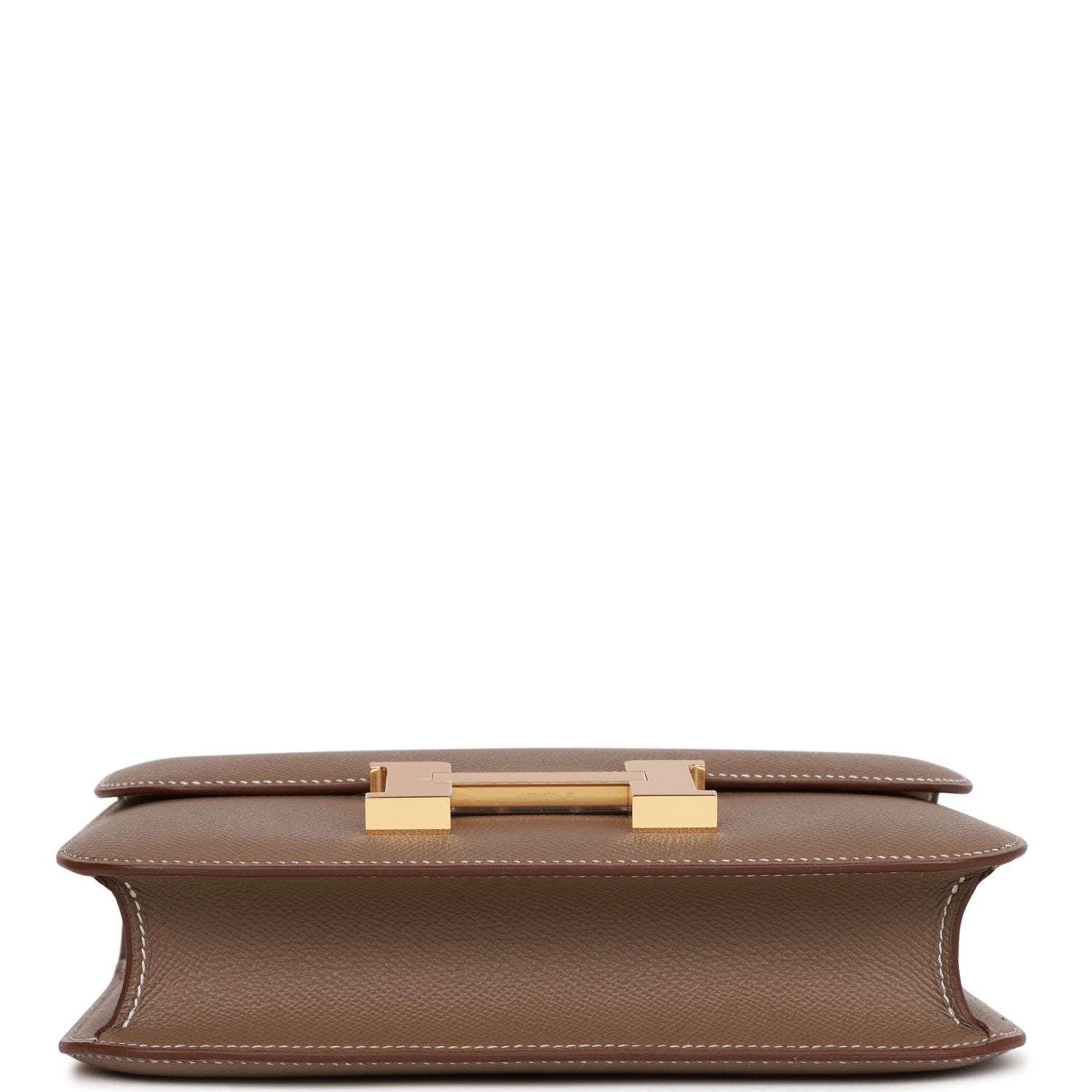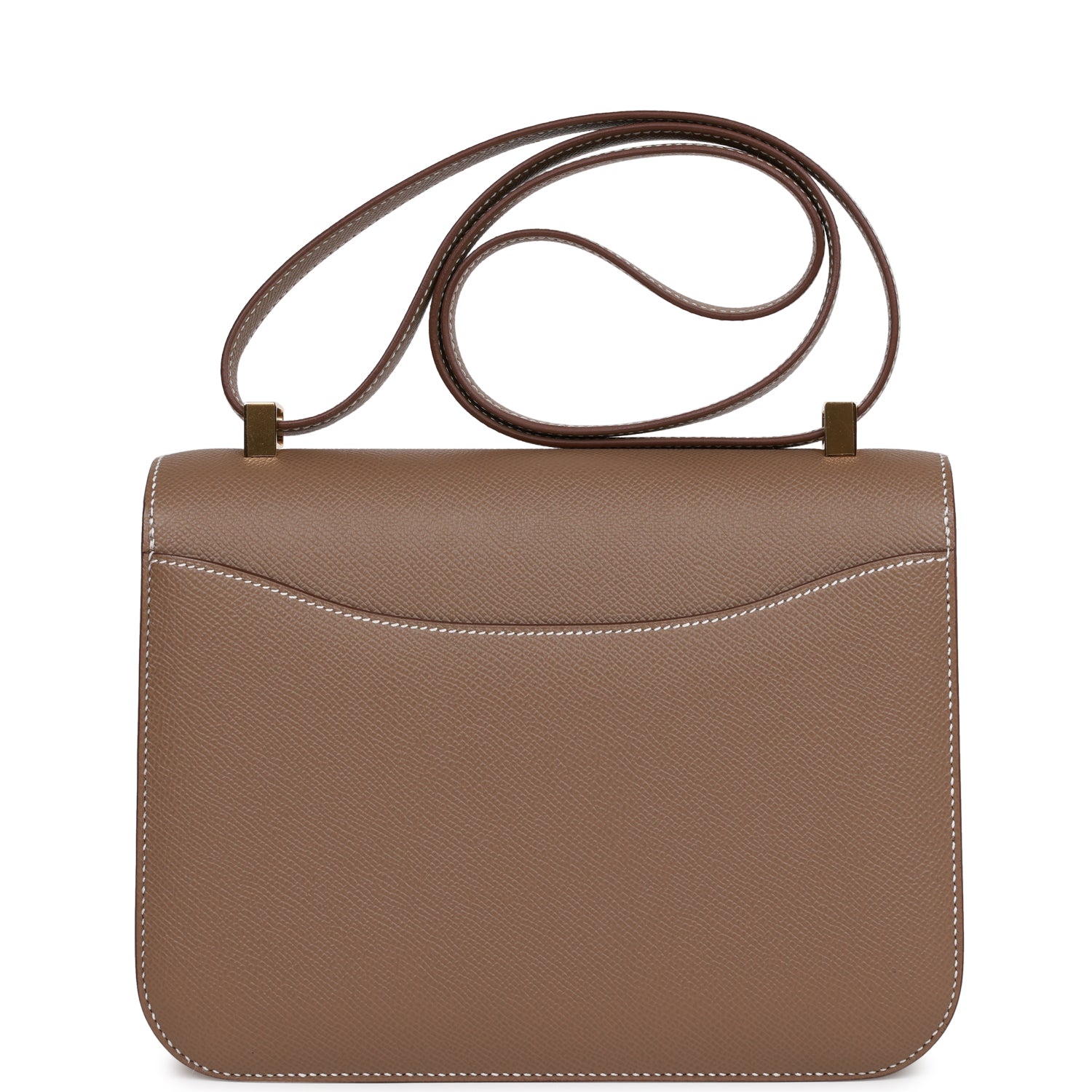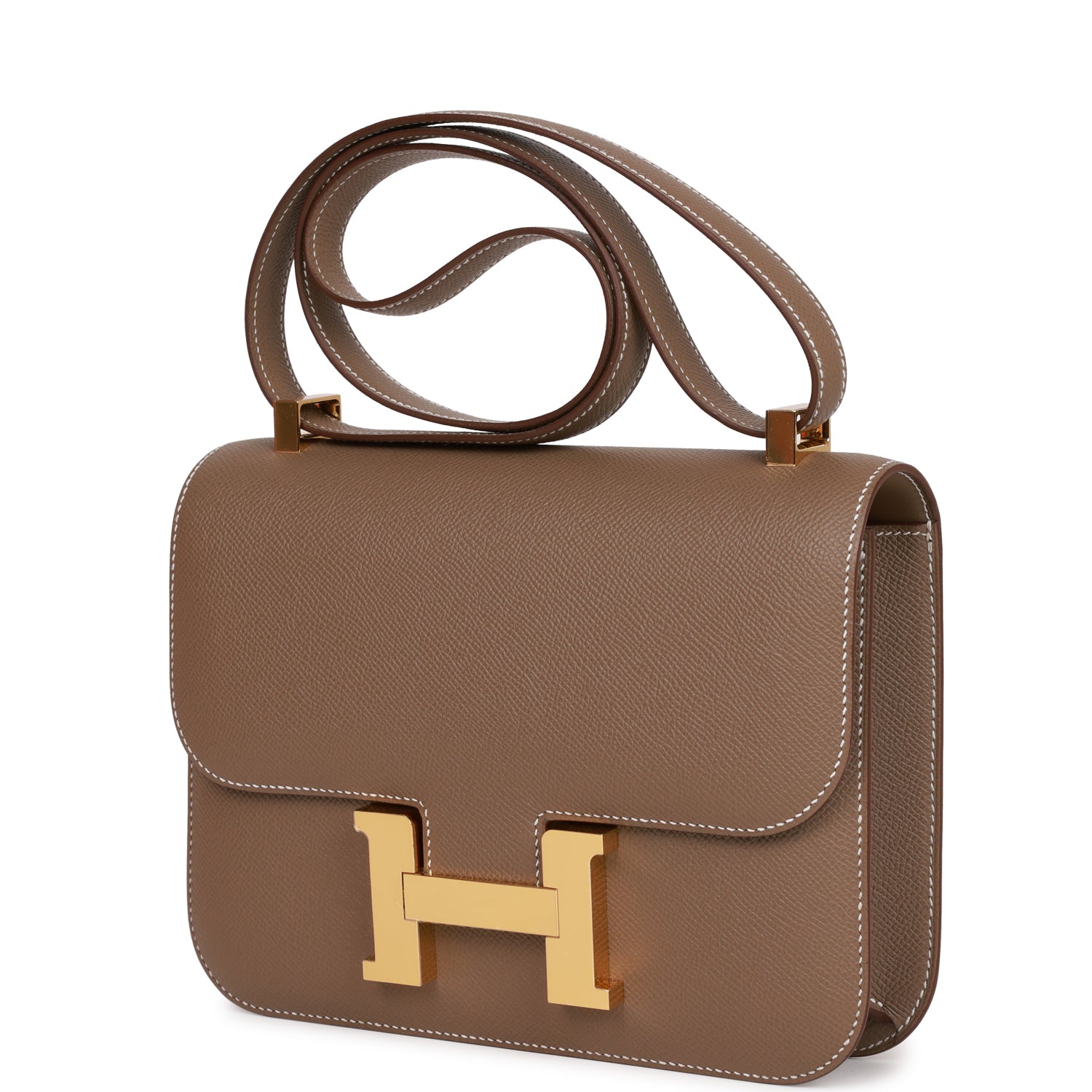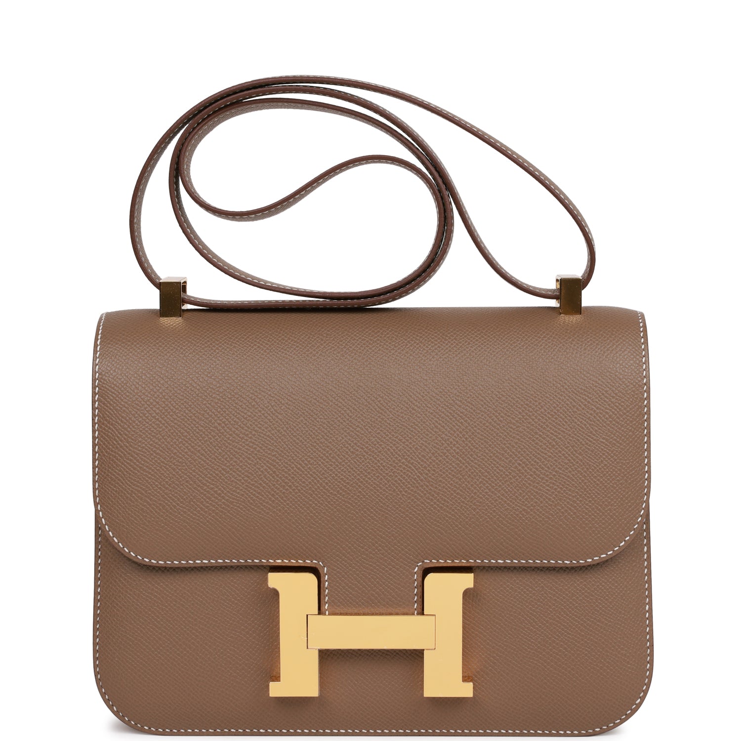 This Constance is in Etoupe epsom leather with gold hardware and has contrast stitching, a metal "H" snap lock closure, and adjustable shoulder strap.