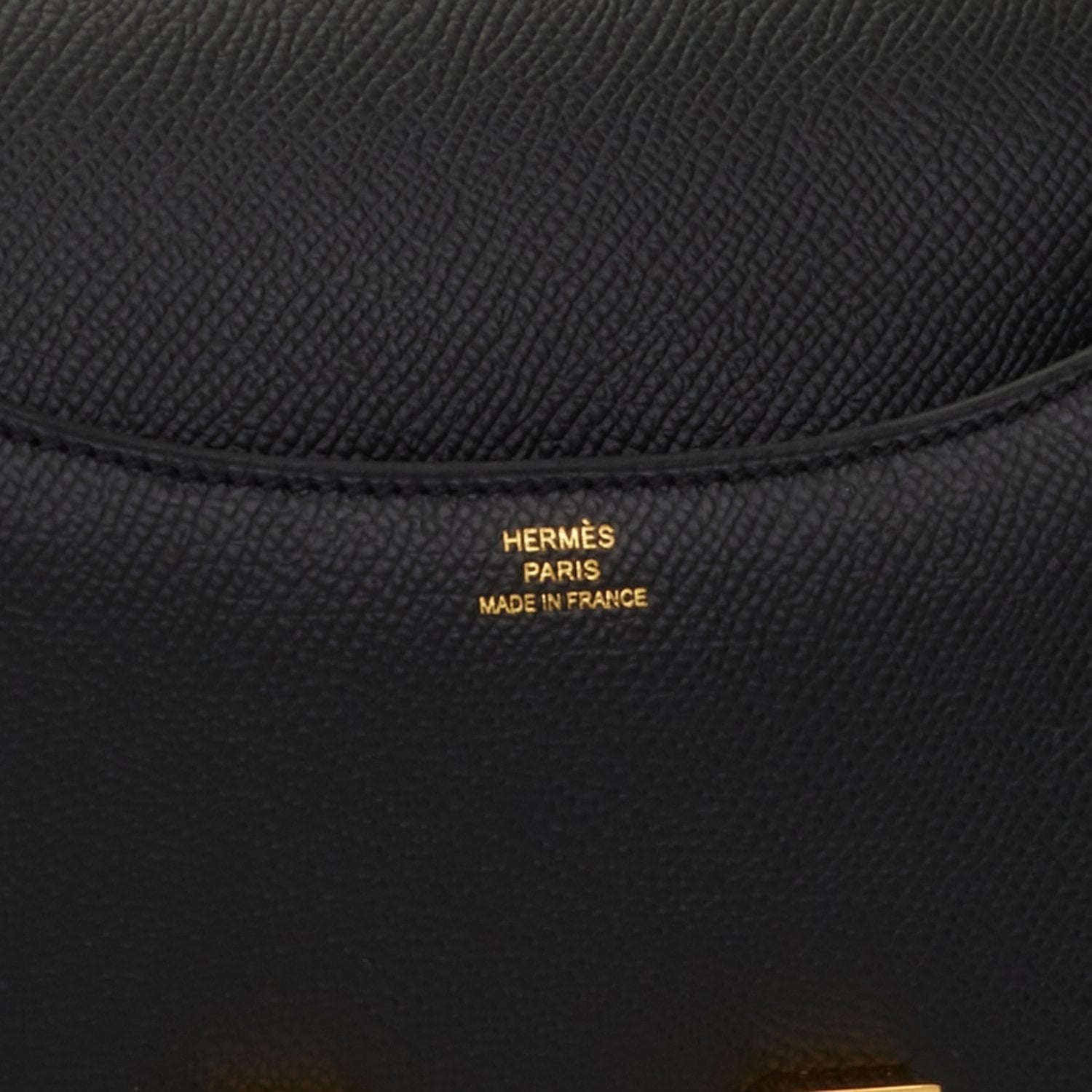 This Constance is in Black epsom leather with gold hardware and has tonal stitching, a metal "H" snap lock closure and adjustable shoulder strap.