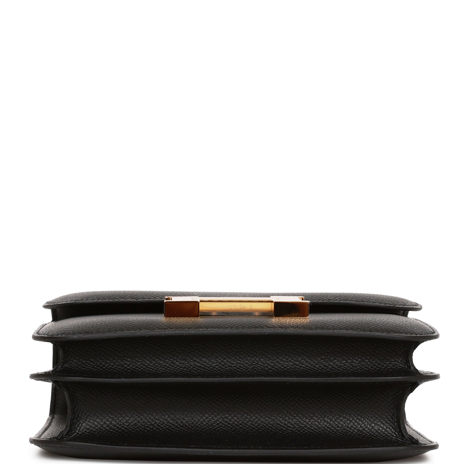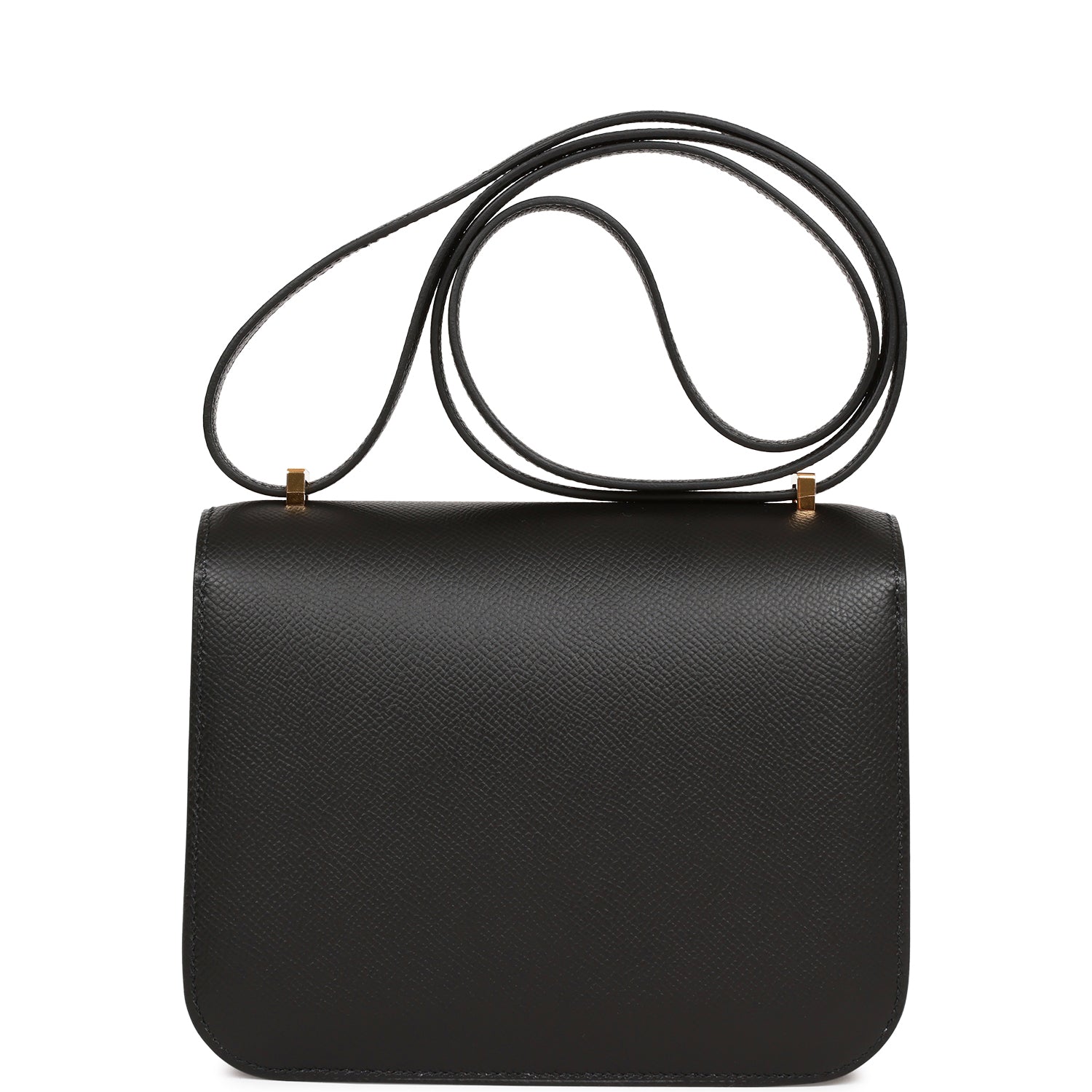 This Constance is in Black epsom leather with gold hardware and has tonal stitching, a metal "H" snap lock closure and adjustable shoulder strap.