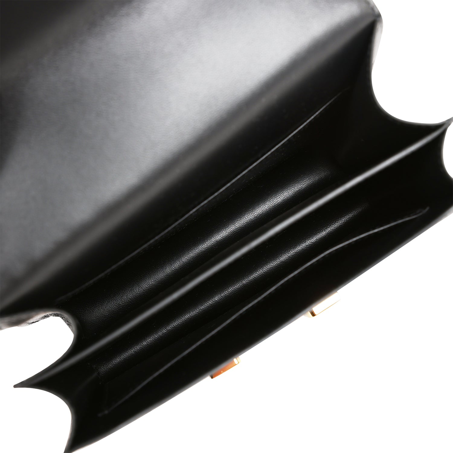The interior is lined with black lambskin and has an open pocket on the front wall, a center divide, and a slit pocket on the back wall.