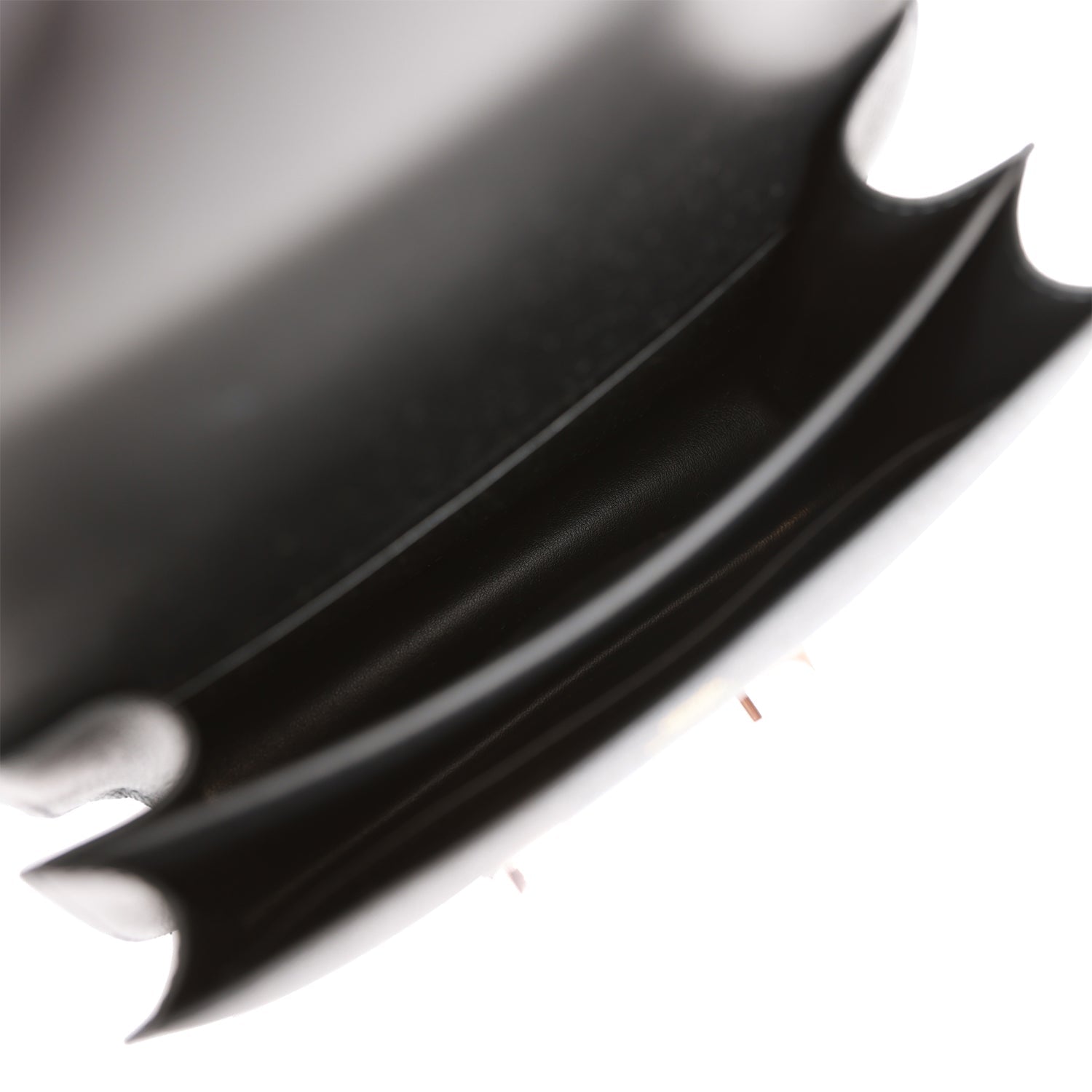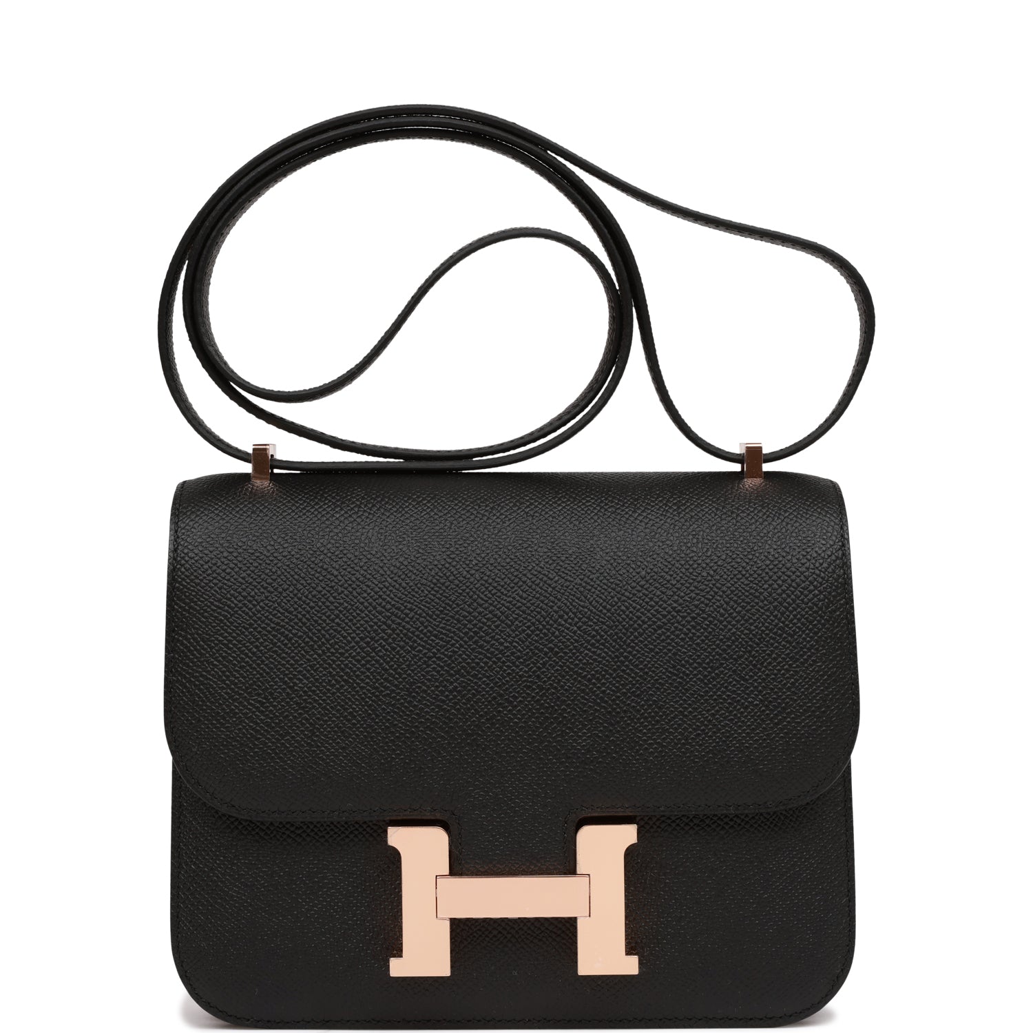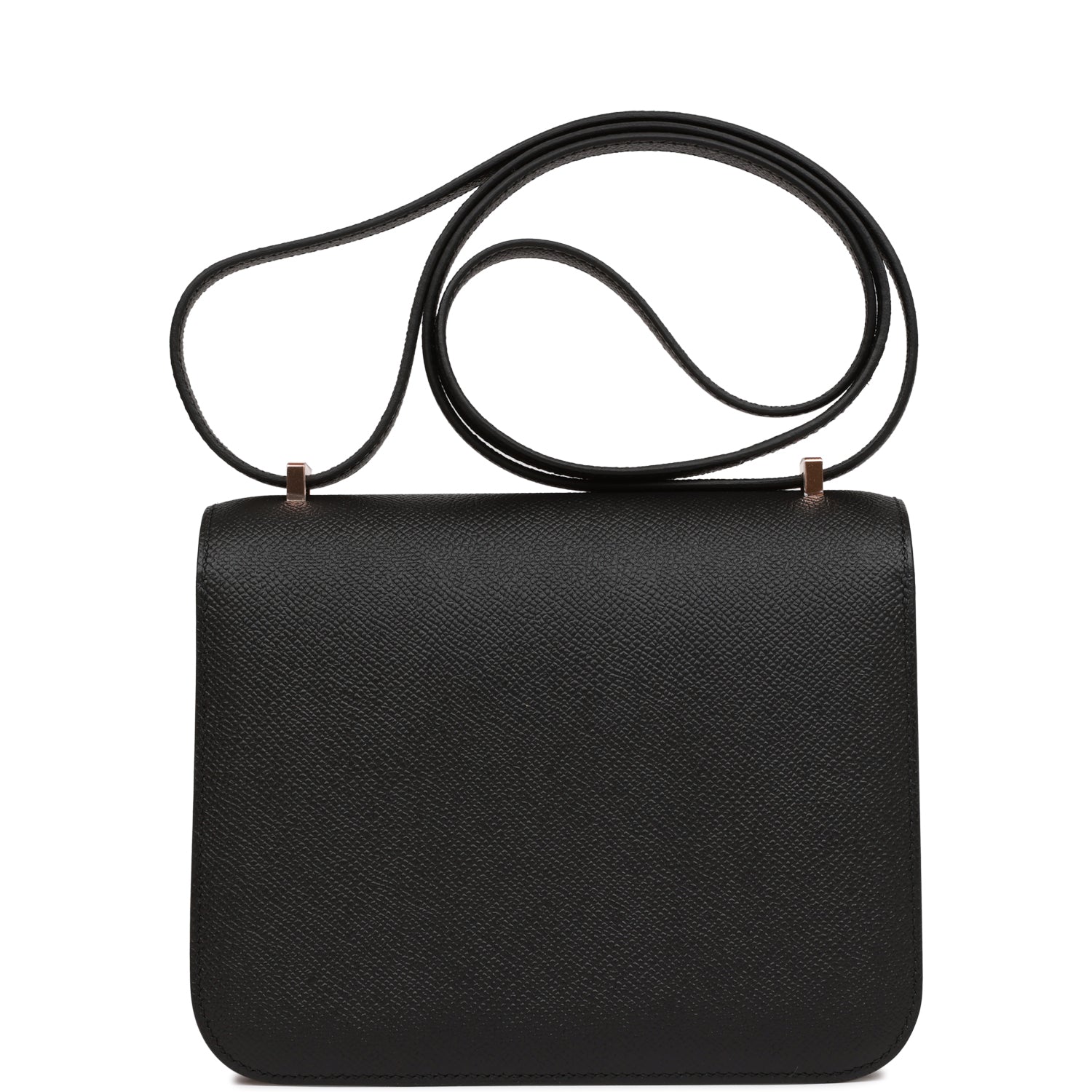 This Constance is in Black epsom leather with rose gold hardware and has tonal stitching, a metal "H" snap lock closure and adjustable shoulder strap.