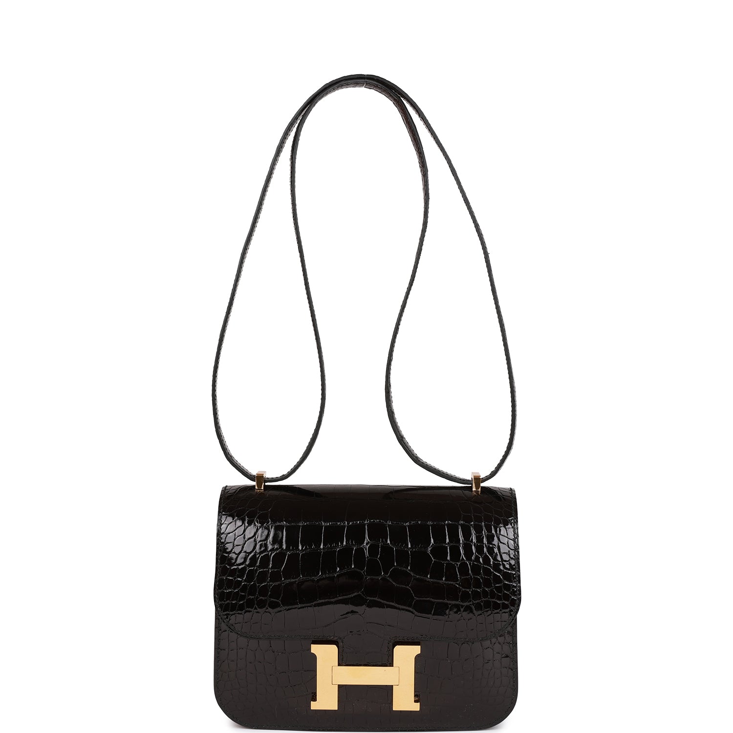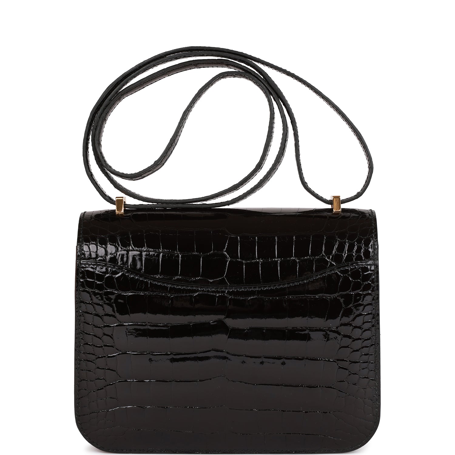 This Constance is of Black shiny alligator with gold hardware and features tonal stitching, a "H" snap lock closure, and an adjustable shoulder strap.