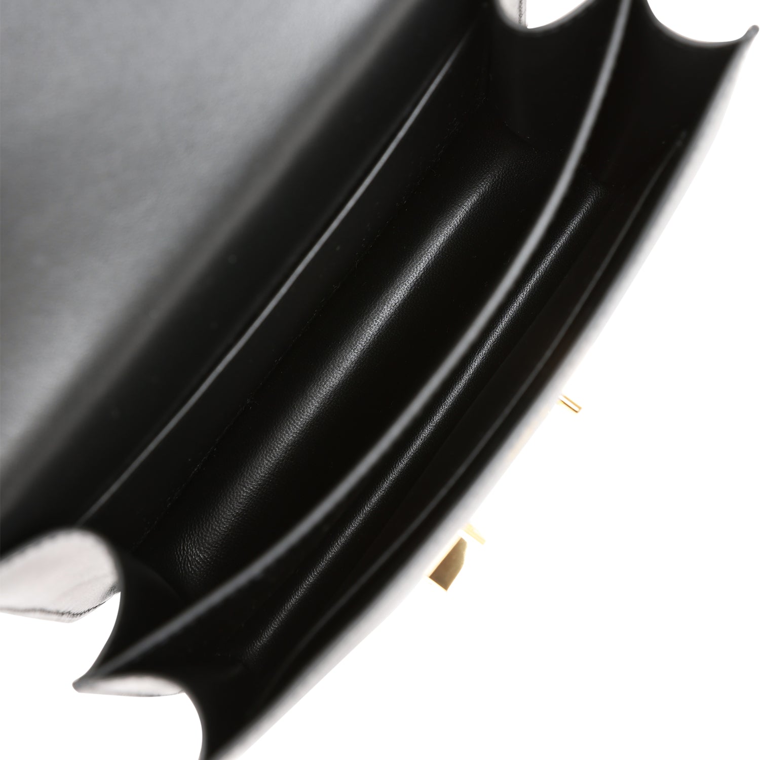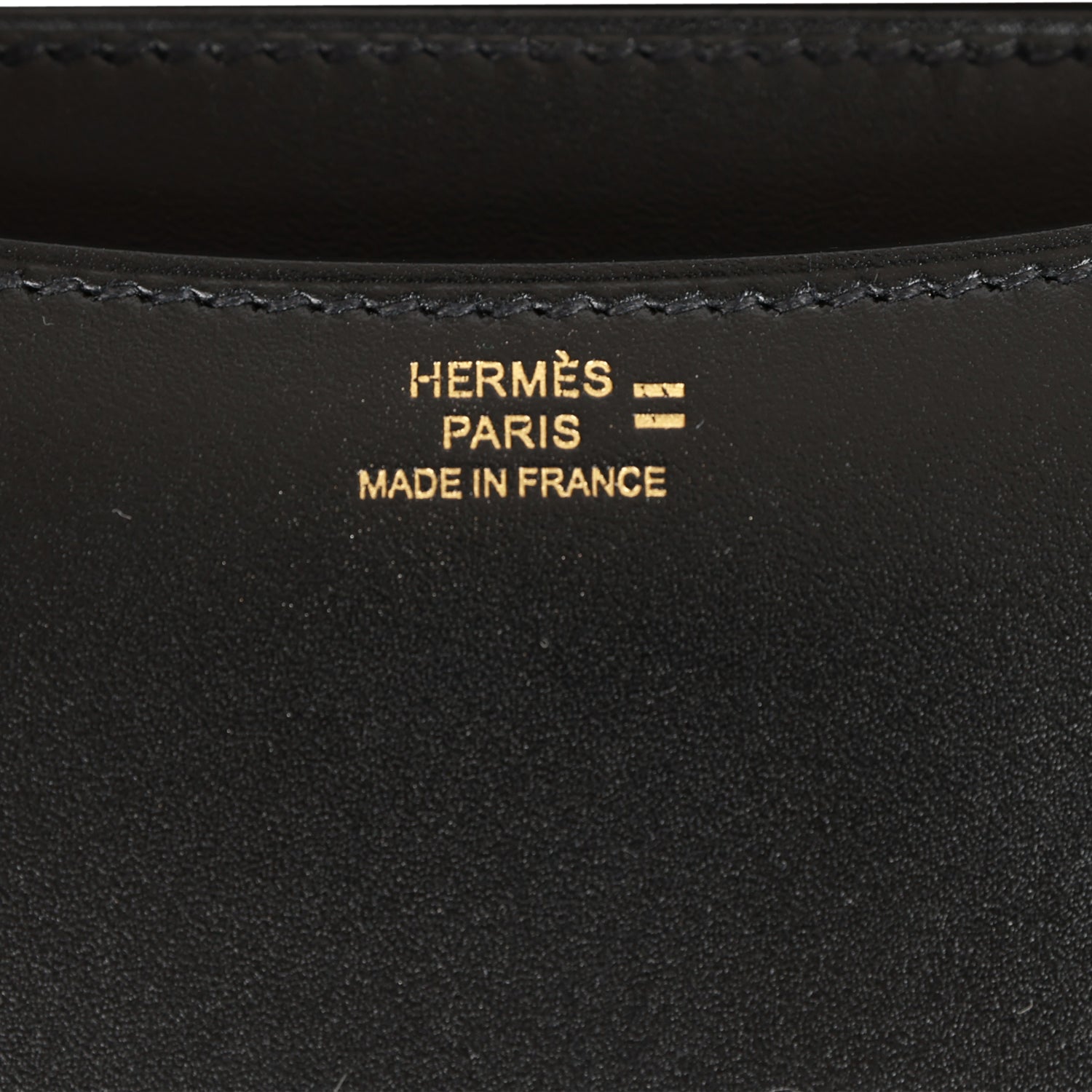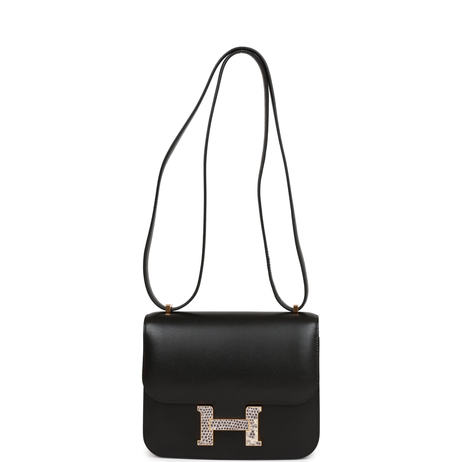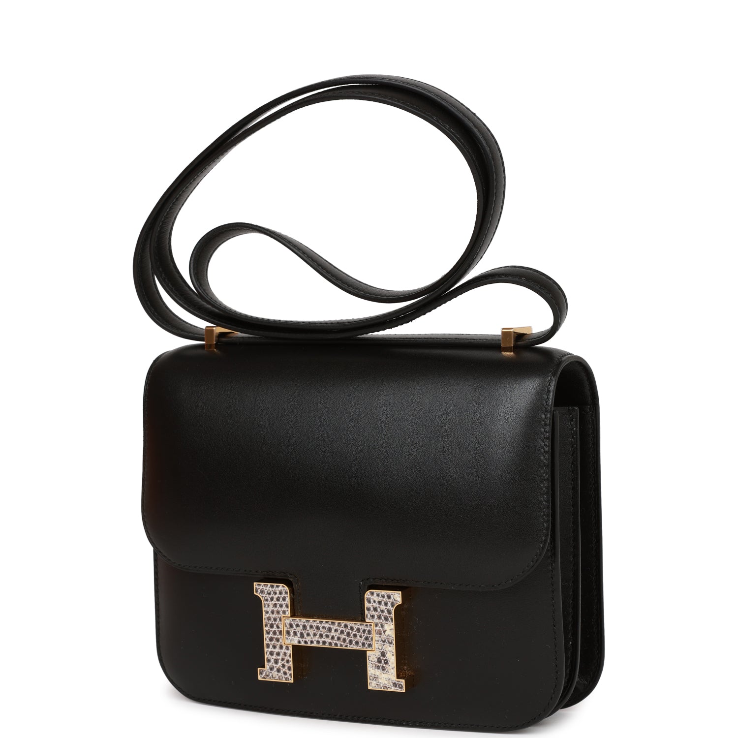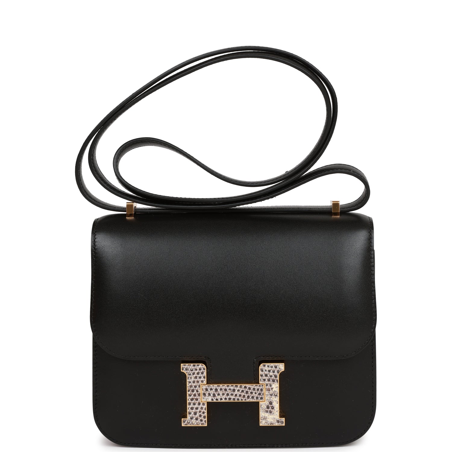 This Constance is in Black tadelakt leather with gold hardware and has tonal stitching, a Varanus Lizard "H" snap lock closure and adjustable shoulder strap.