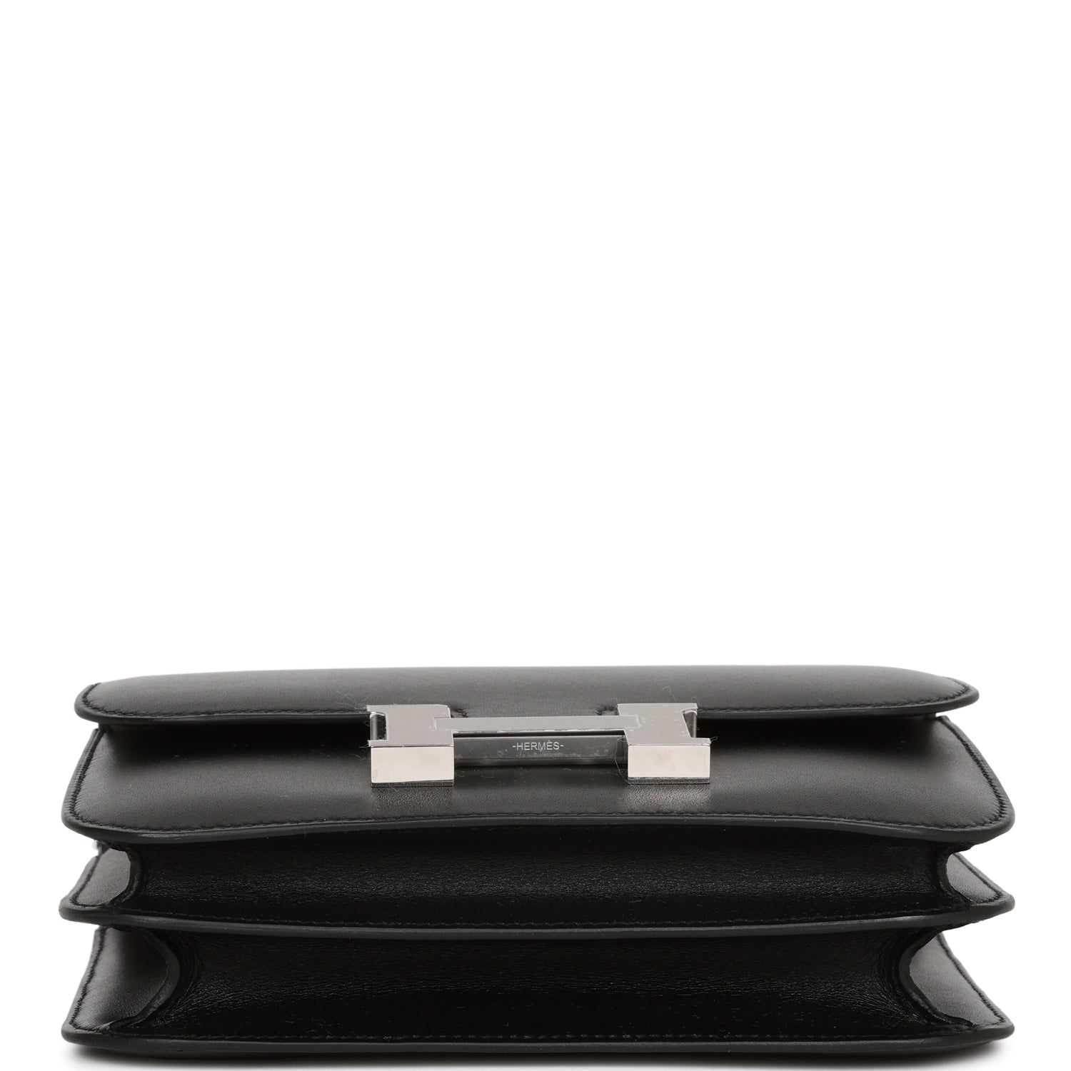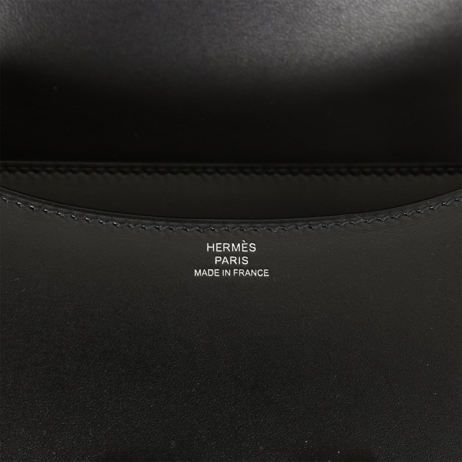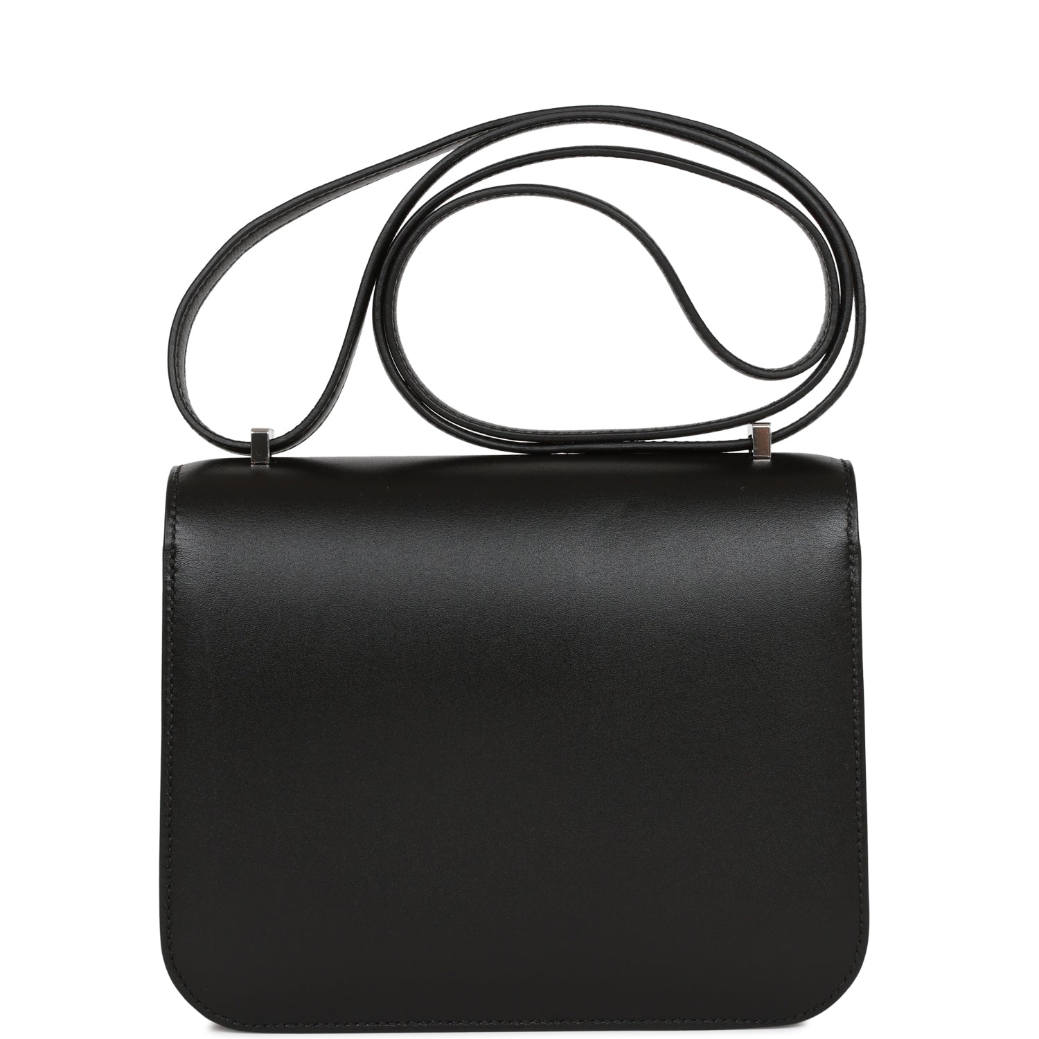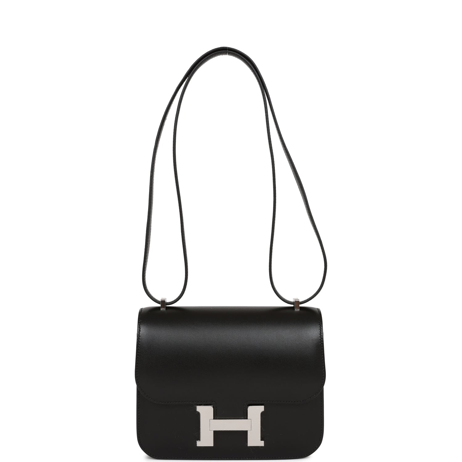 This Constance is in Black tadelakt leather with palladium hardware and has tonal stitching, a metal "H" snap lock closure and adjustable shoulder strap.