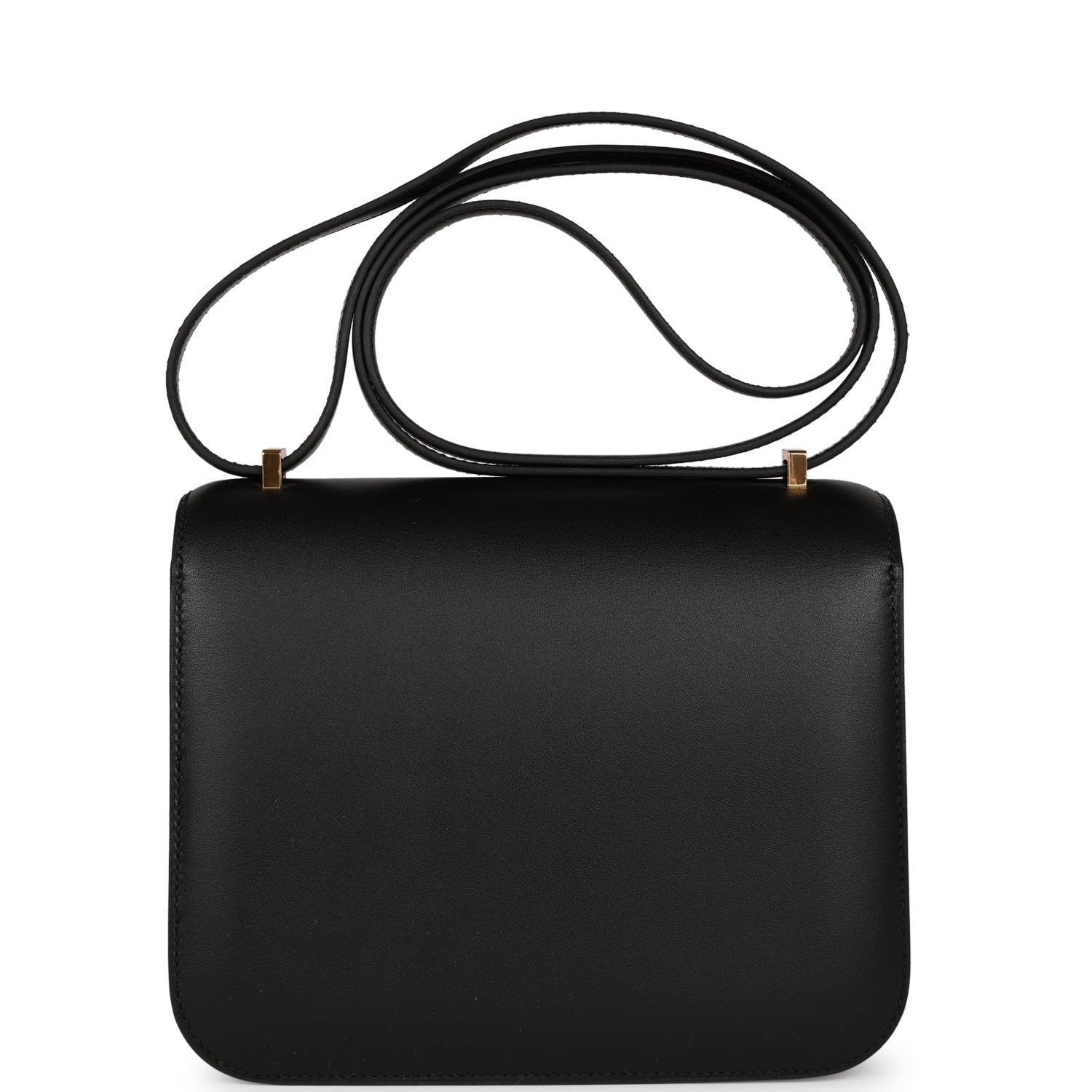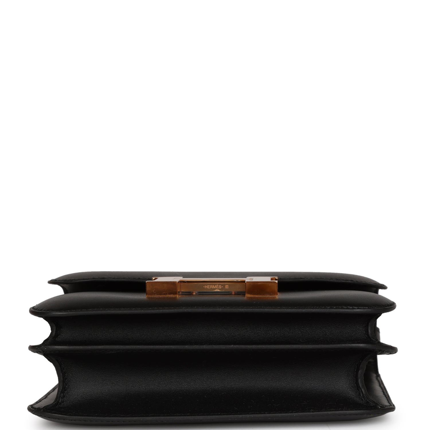 This Constance is in Black Veau Monsieur leather with rose gold hardware and has tonal stitching, a metal "H" snap lock closure and adjustable shoulder strap.