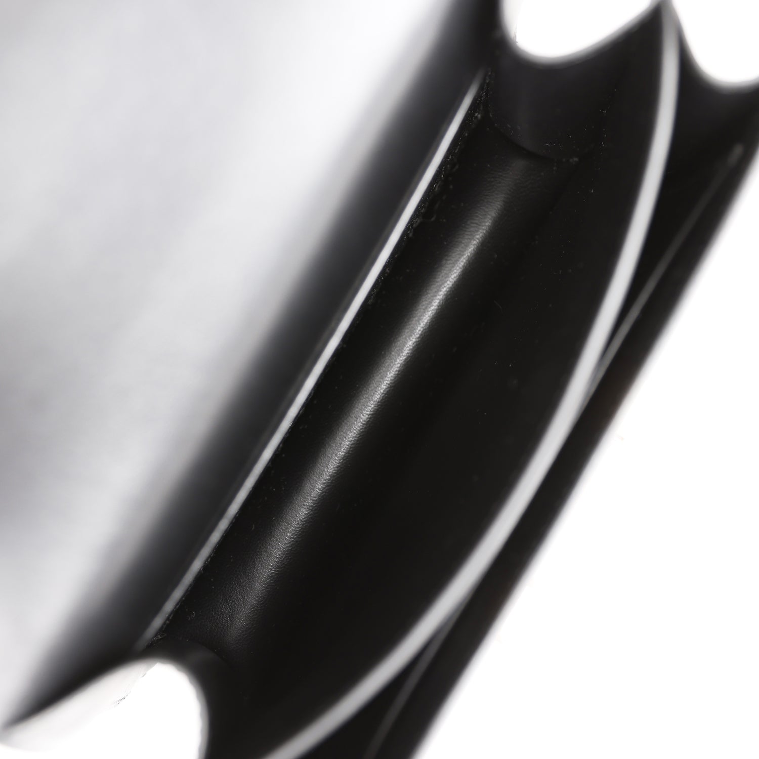 The interior is lined with Black lambskin and has an open pocket on the front wall, a center divide, and a slit pocket on the back wall.