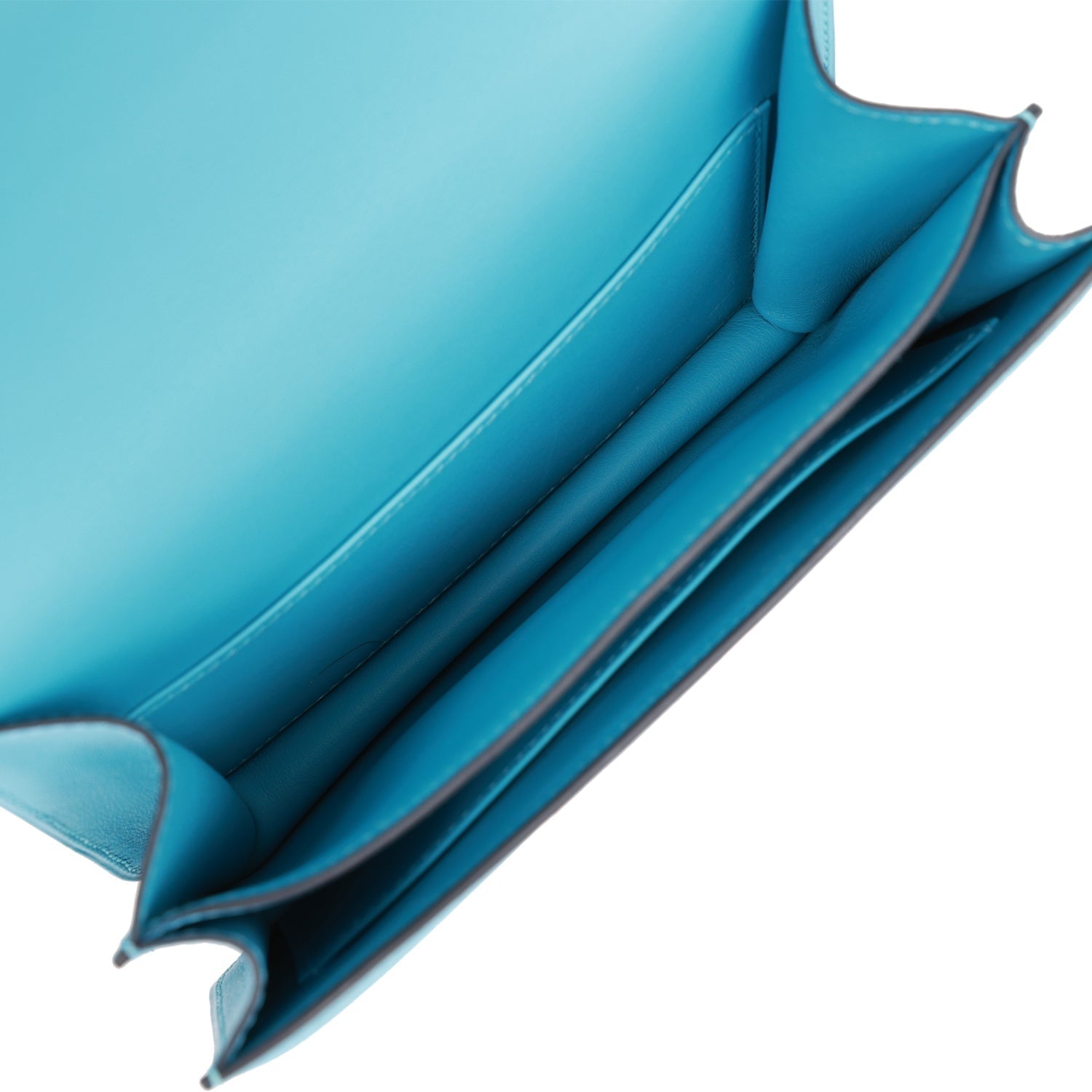 The interior is lined with Bleu du Nord lambskin and has an open pocket on the front wall, a center divide, and a slit pocket on the back wall.