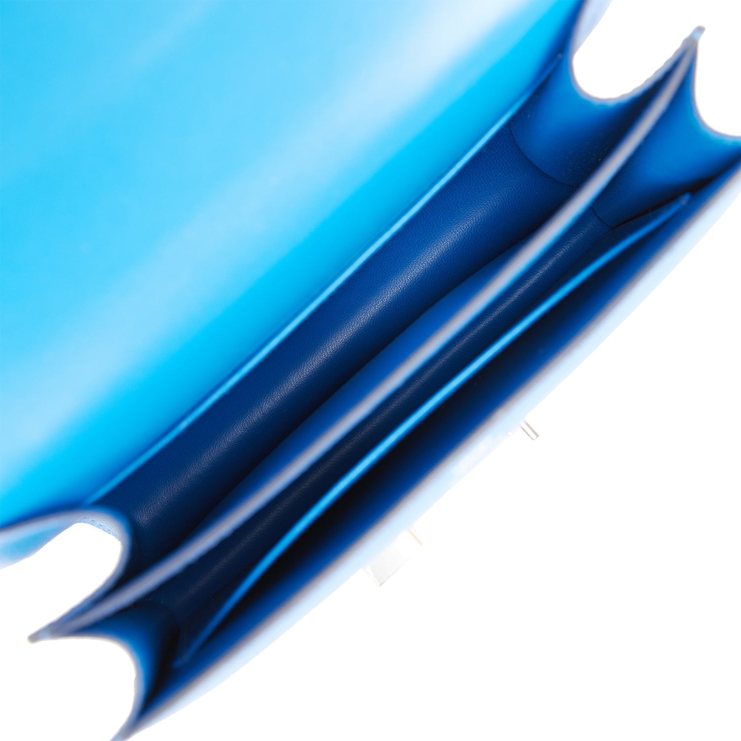 The interior is lined with Bleu France lambskin and has an open pocket on the front wall, a center divide, and a slit pocket on the back wall.