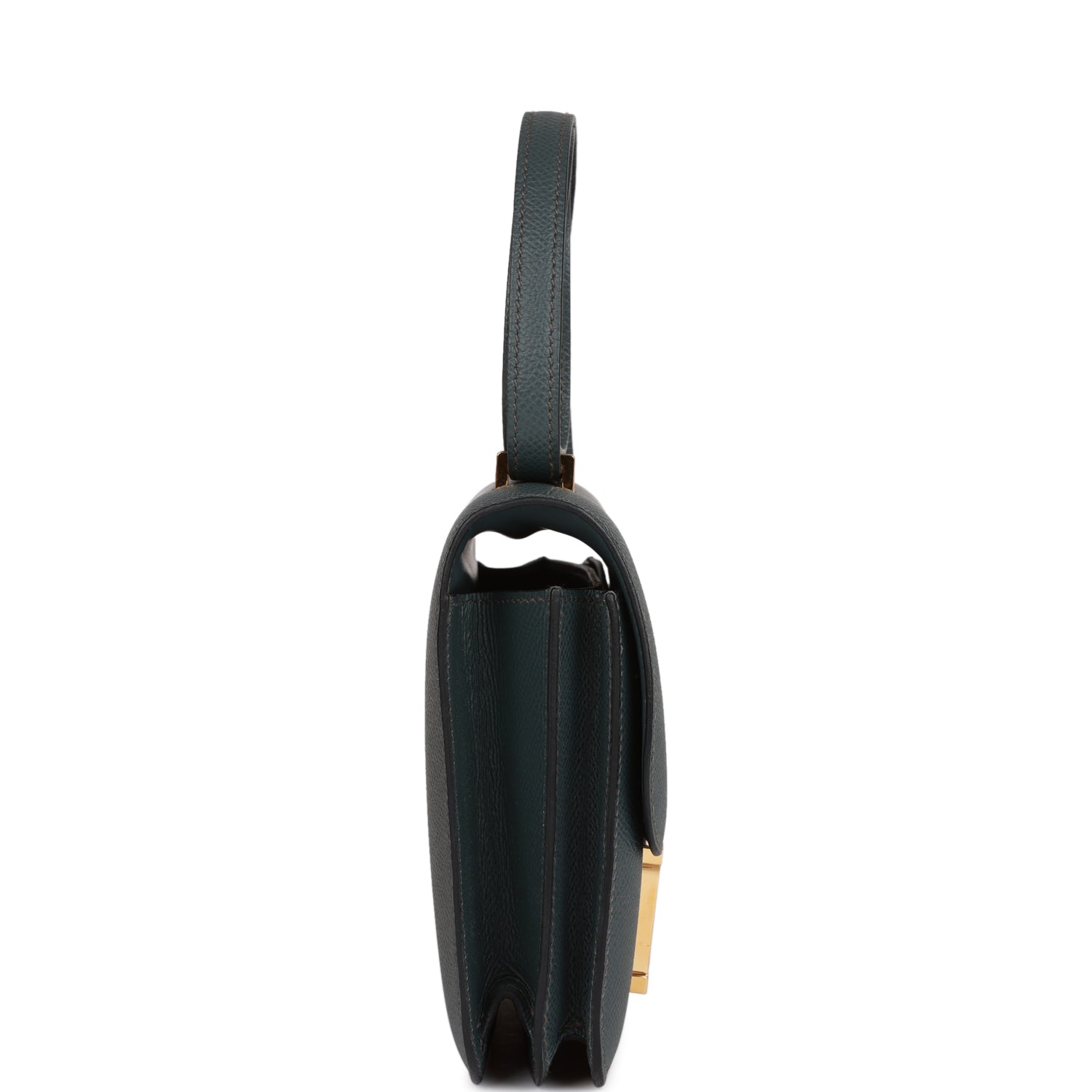 This Constance is in Bleu Orage epsom leather with gold hardware and has tonal stitching, a metal "H" snap lock closure and adjustable shoulder strap.