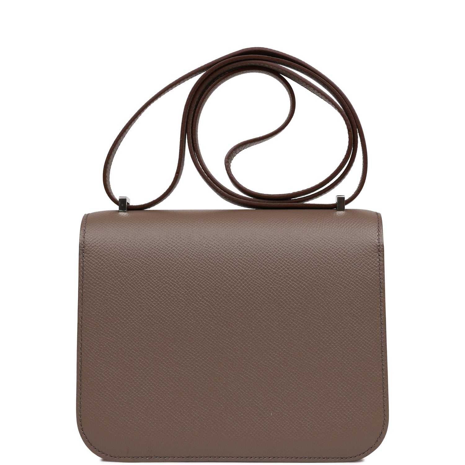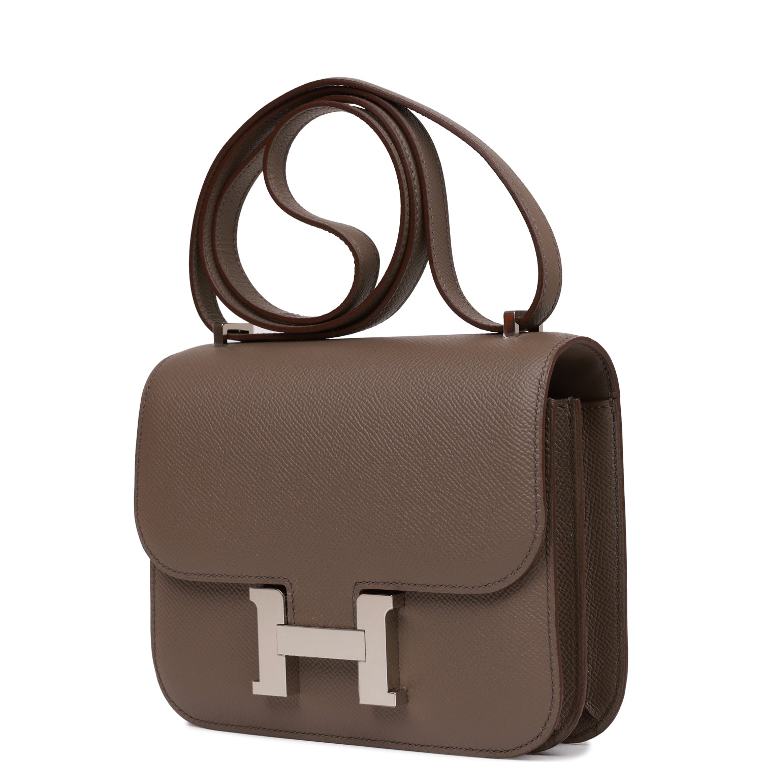 This Constance is in Etain epsom leather with palladium hardware and has tonal stitching, a metal "H" snap lock closure and adjustable shoulder strap.