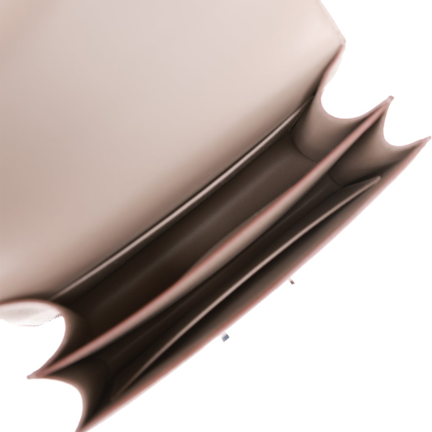 The interior is lined with Etain lambskin and has an open pocket on the front wall, a center divide, and a slit pocket on the back wall.