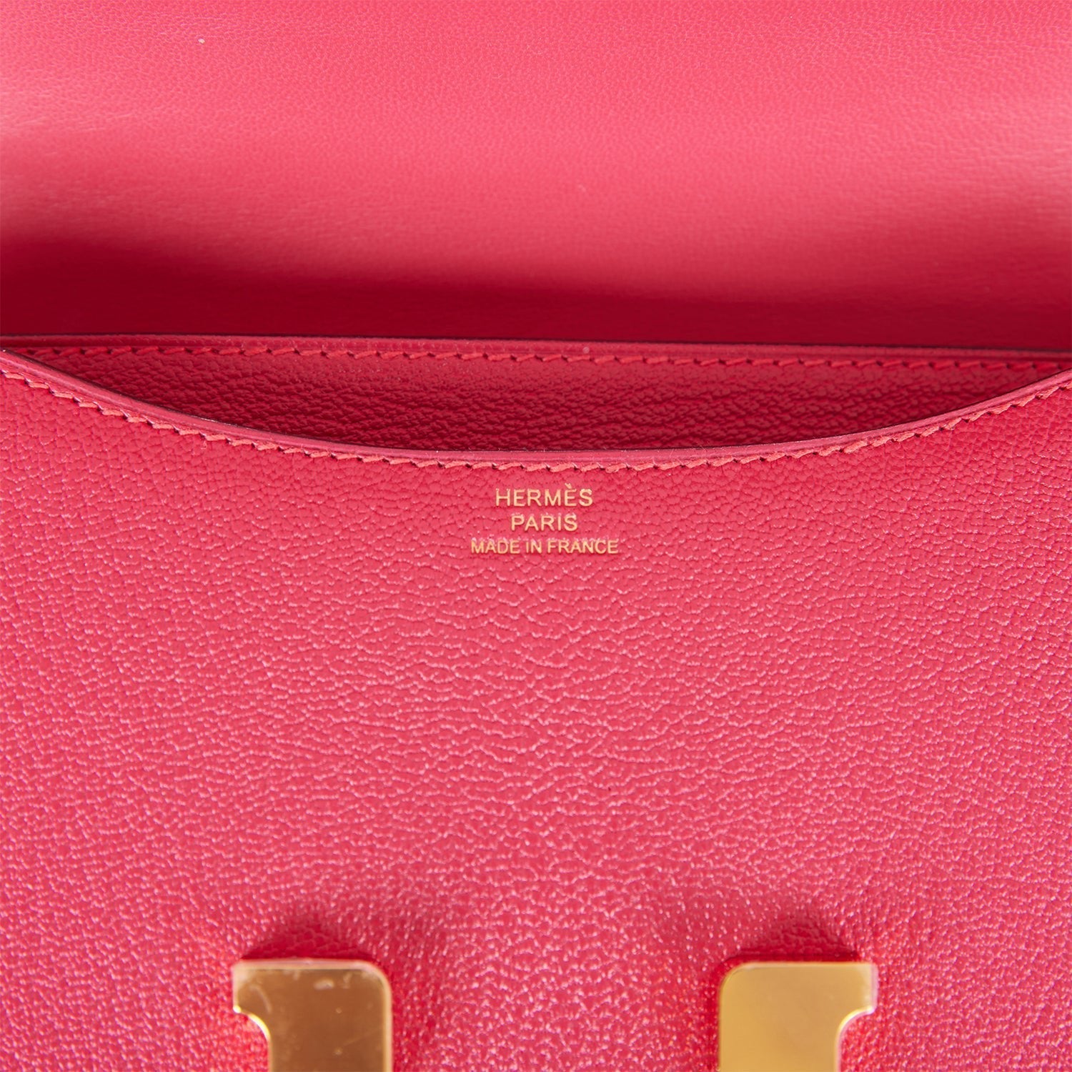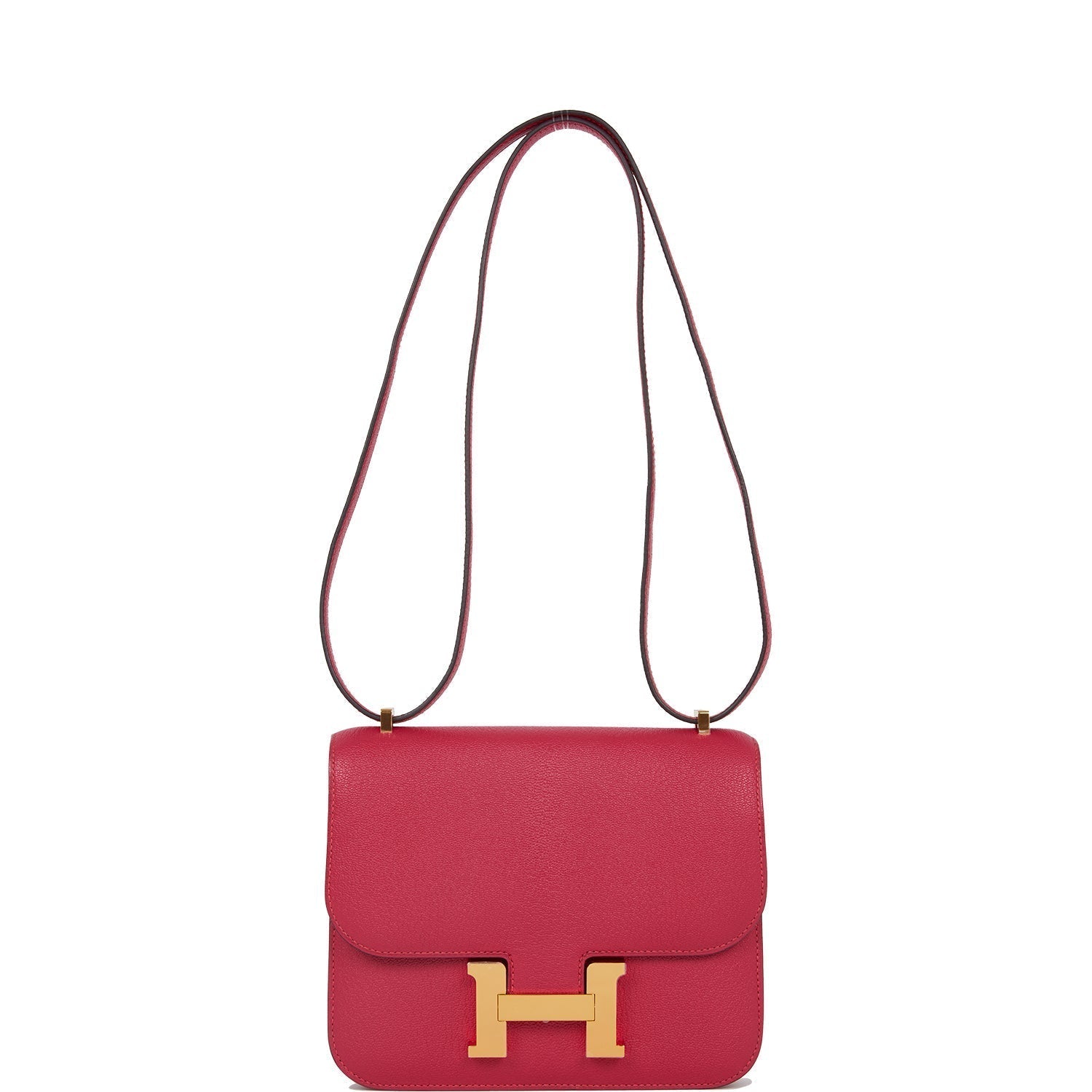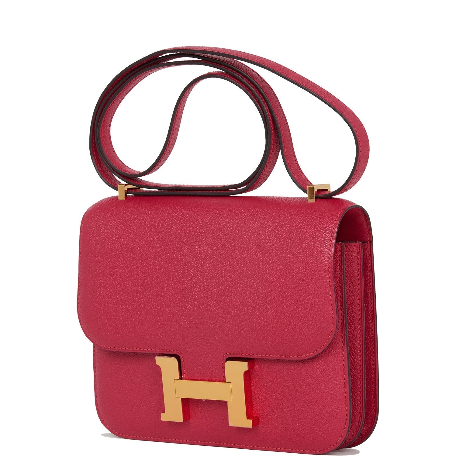 This Constance is in Framboise chevre leather with gold hardware and has tonal stitching, a metal "H" snap lock closure and adjustable shoulder strap.
