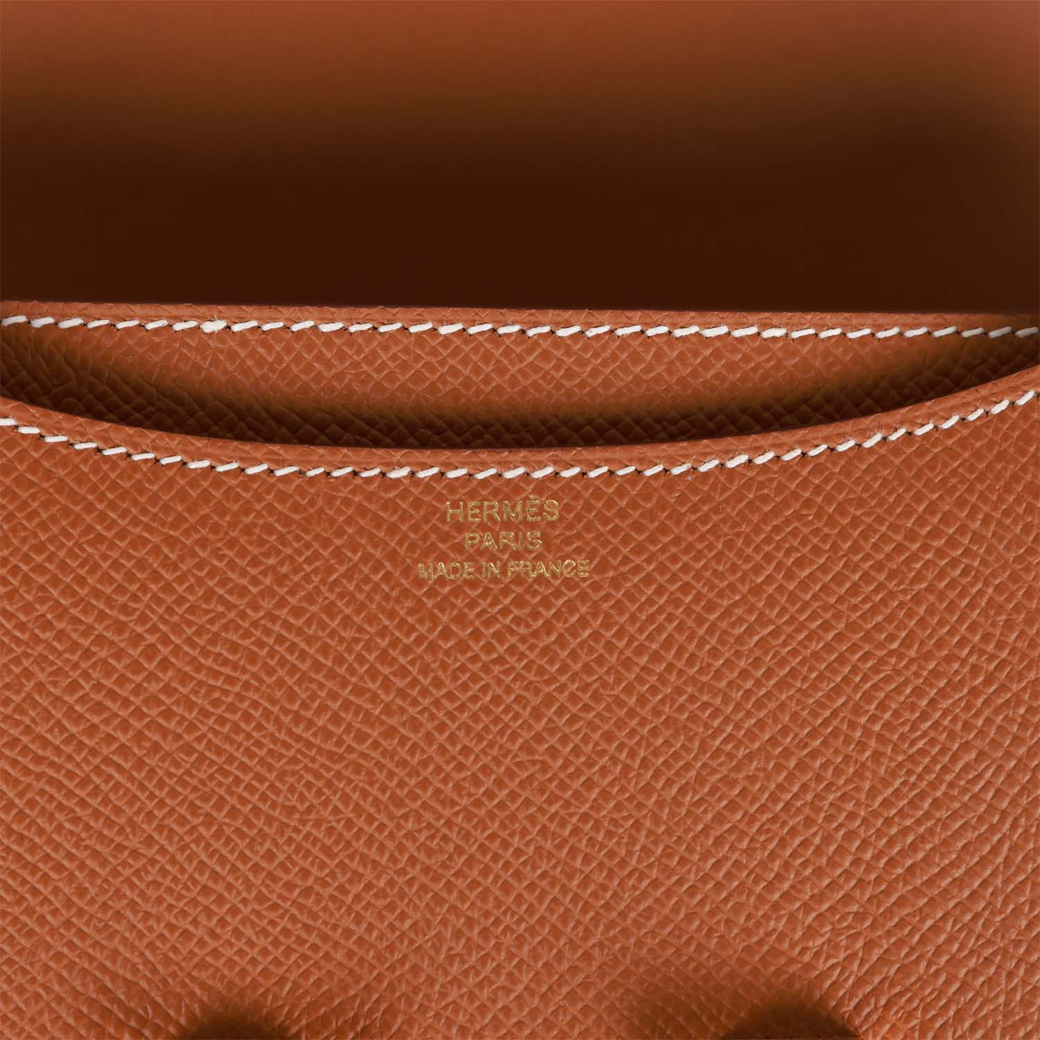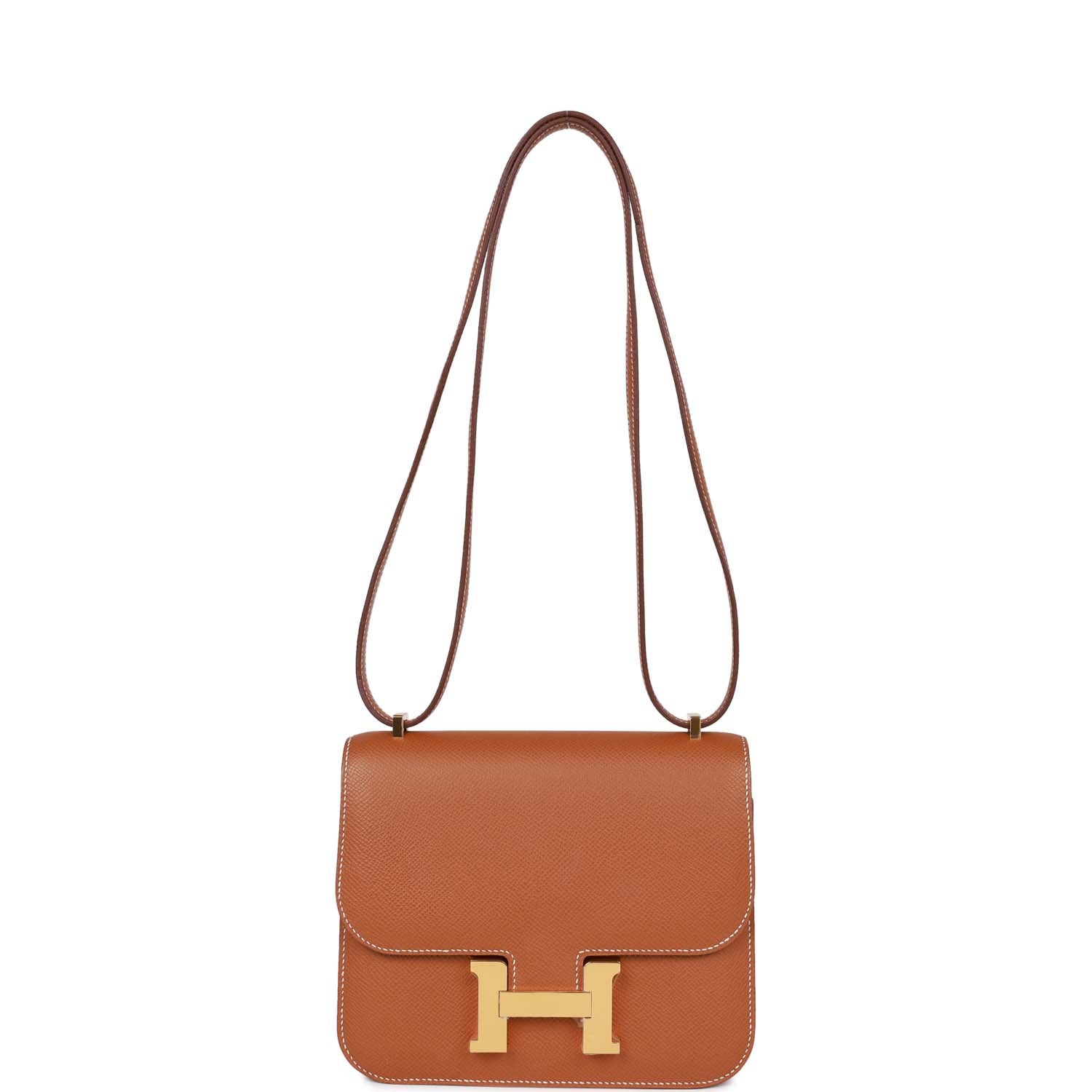 This Constance is in Gold epsom leather with gold hardware and has contrast stitching, a metal "H" snap lock closure and adjustable shoulder strap.