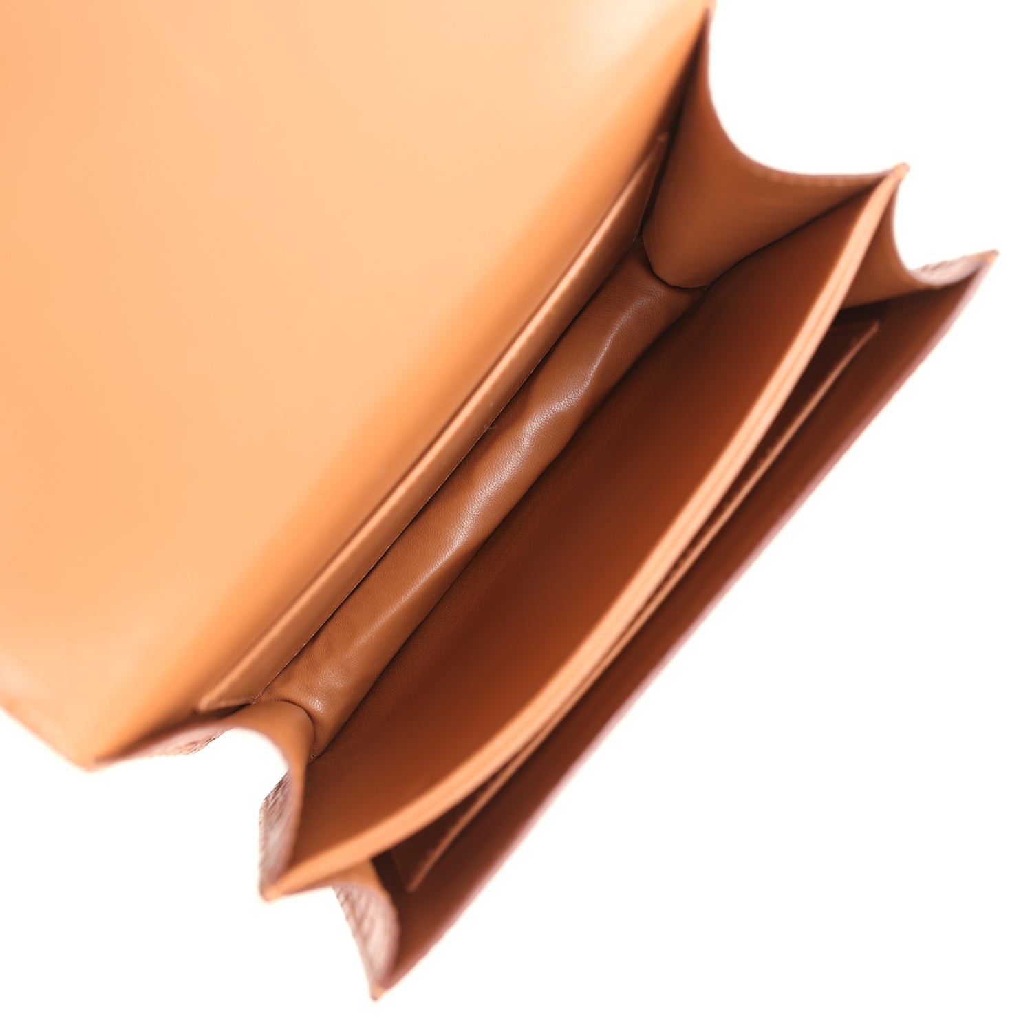 This Constance is of Chai matte Alligator Mississippiensis with gold hardware and features tonal stitching, a "H" snap lock closure, and an adjustable shoulder strap.