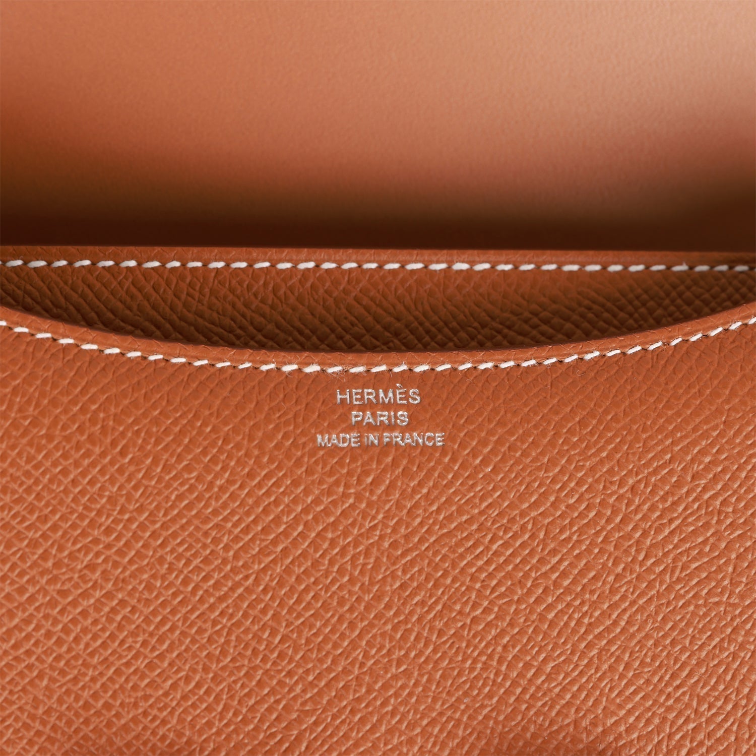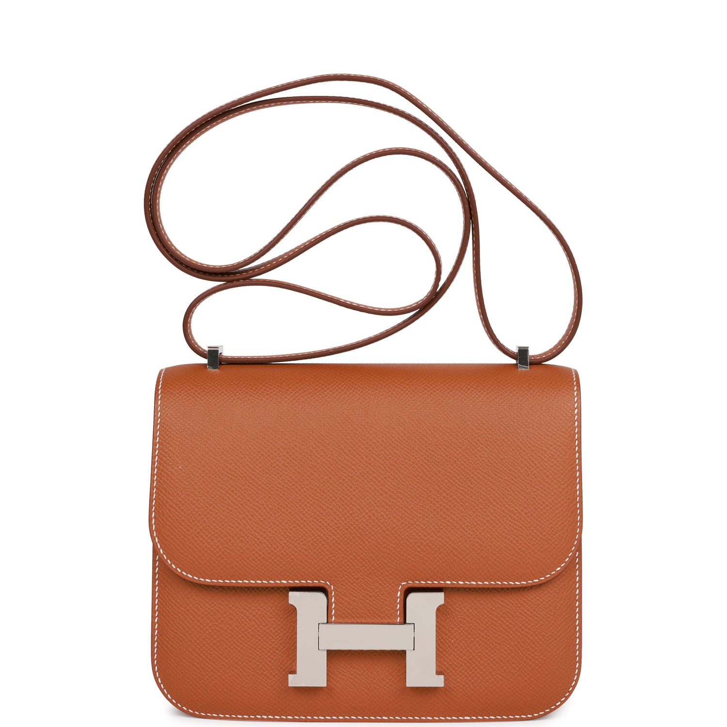 This Constance is in Gold epsom leather with palladium hardware and has contrast stitching, a metal "H" snap lock closure and adjustable shoulder strap.