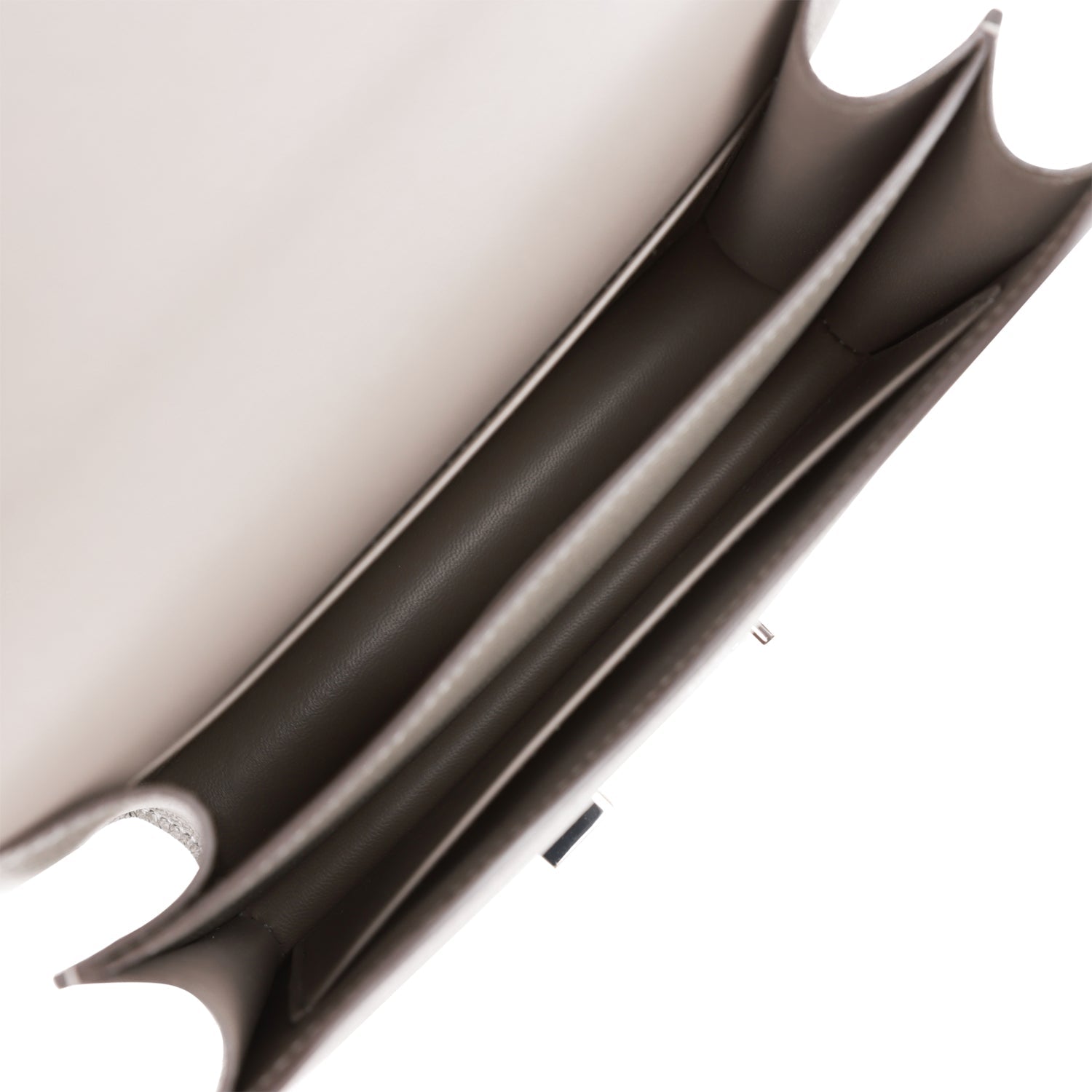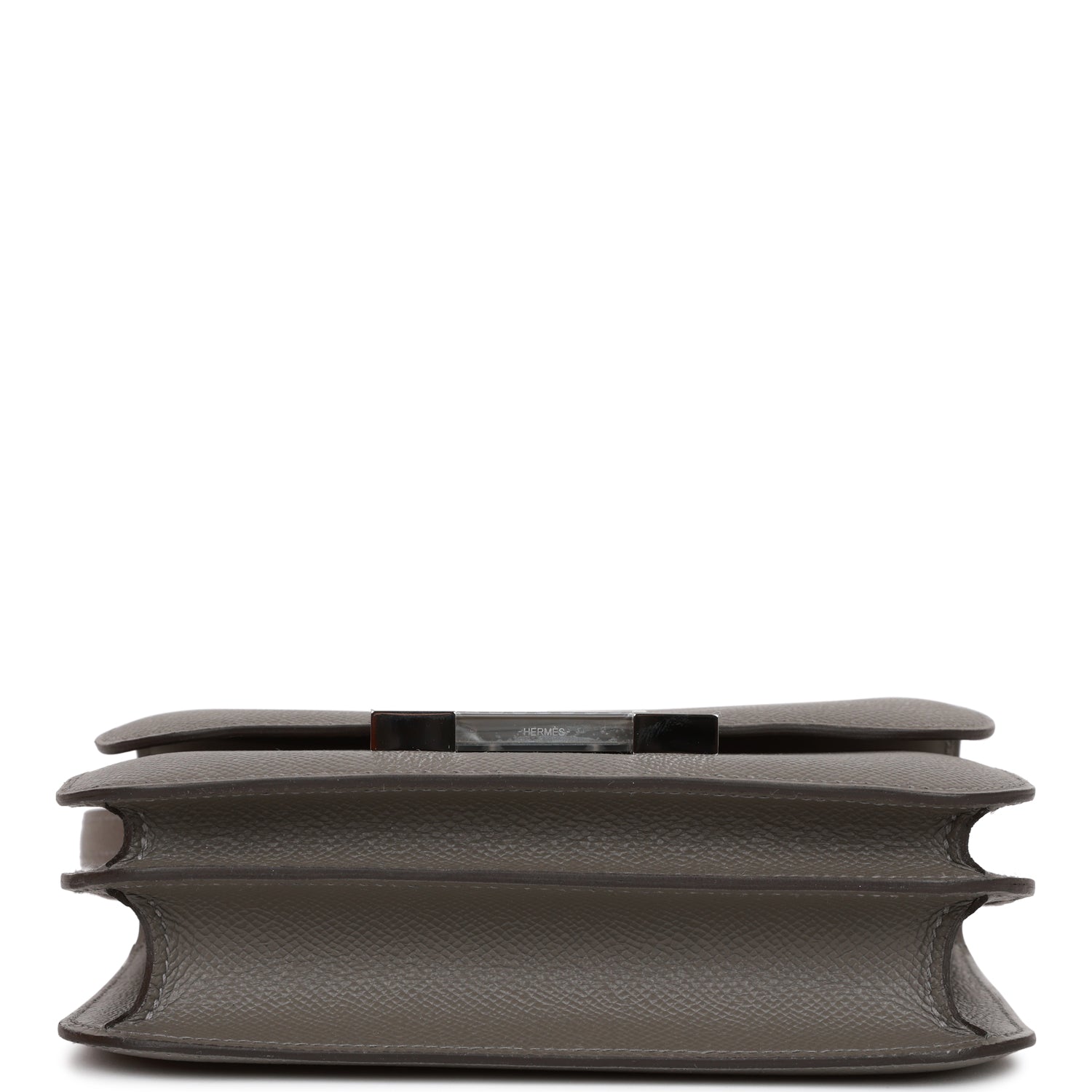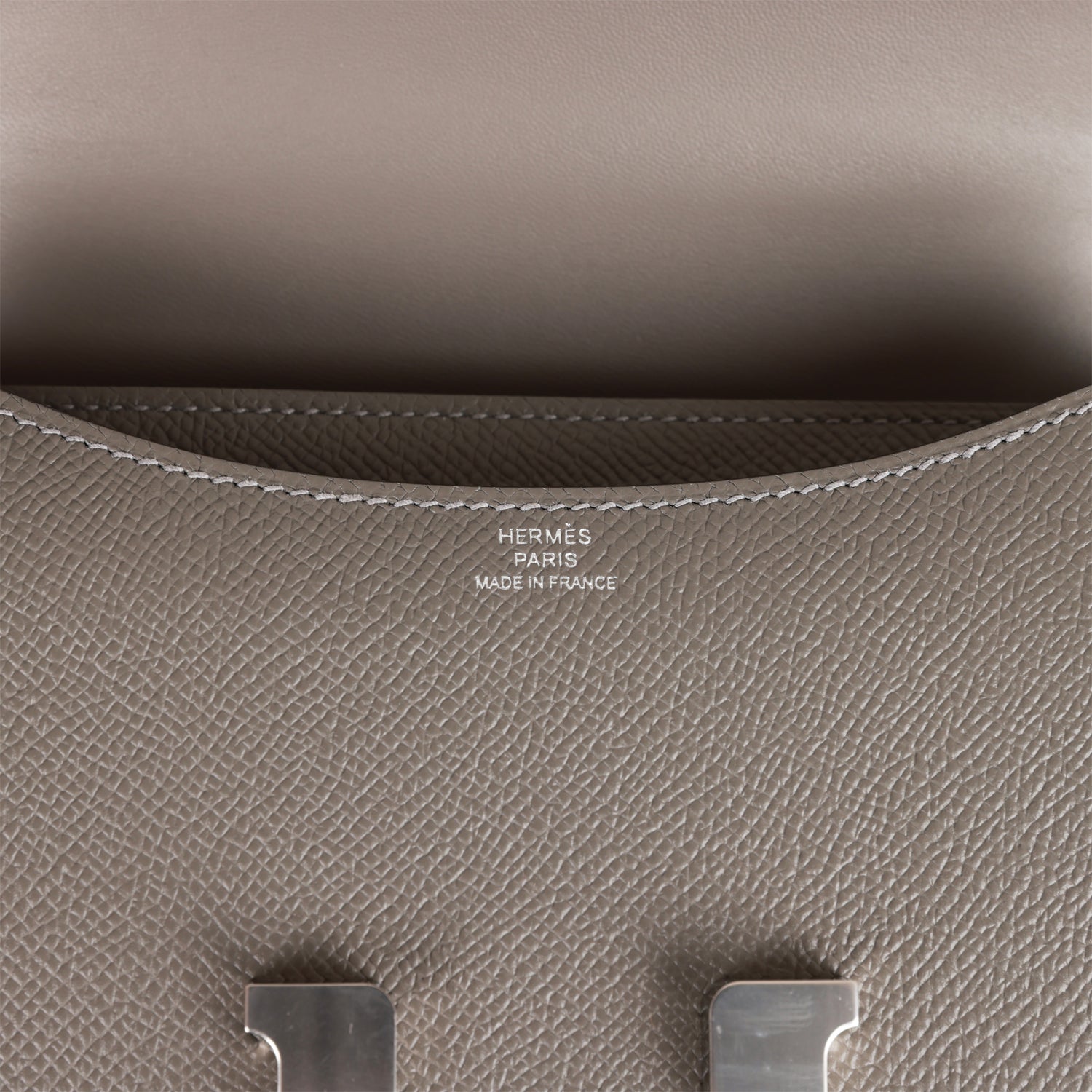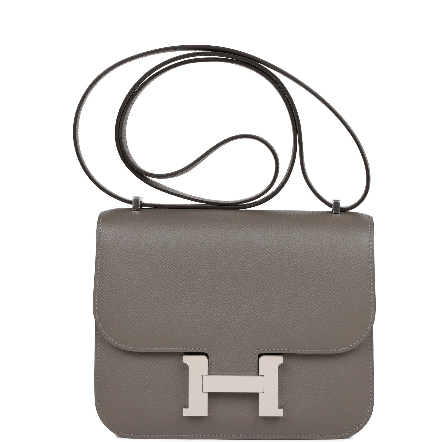 This Constance is in Gris Meyer epsom leather with palladium hardware and has tonal stitching, a metal "H" snap lock closure and adjustable shoulder strap.