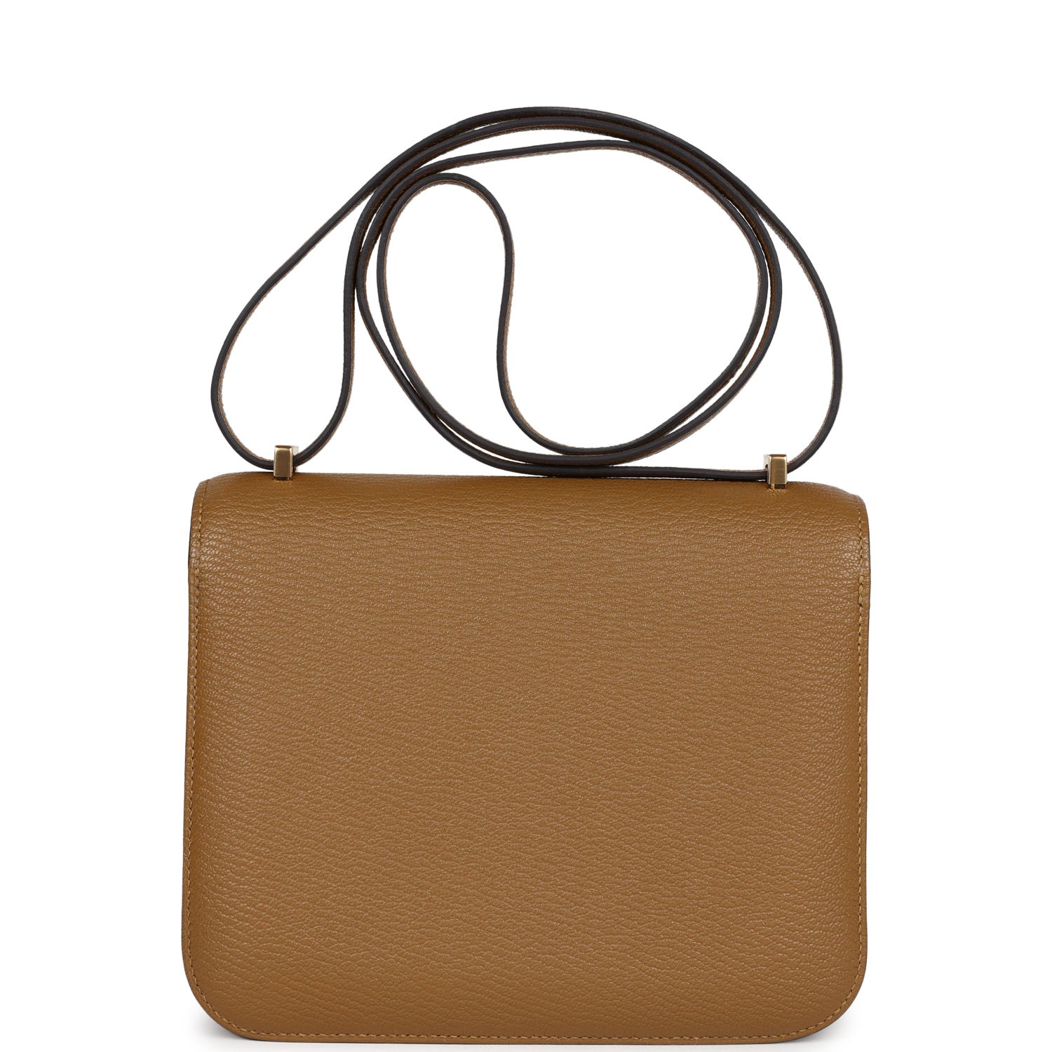 This Constance 1-18 is in Kraft chevre mysore leather with gold hardware, tonal stitching, a metal "H" snap lock closure and adjustable shoulder strap.