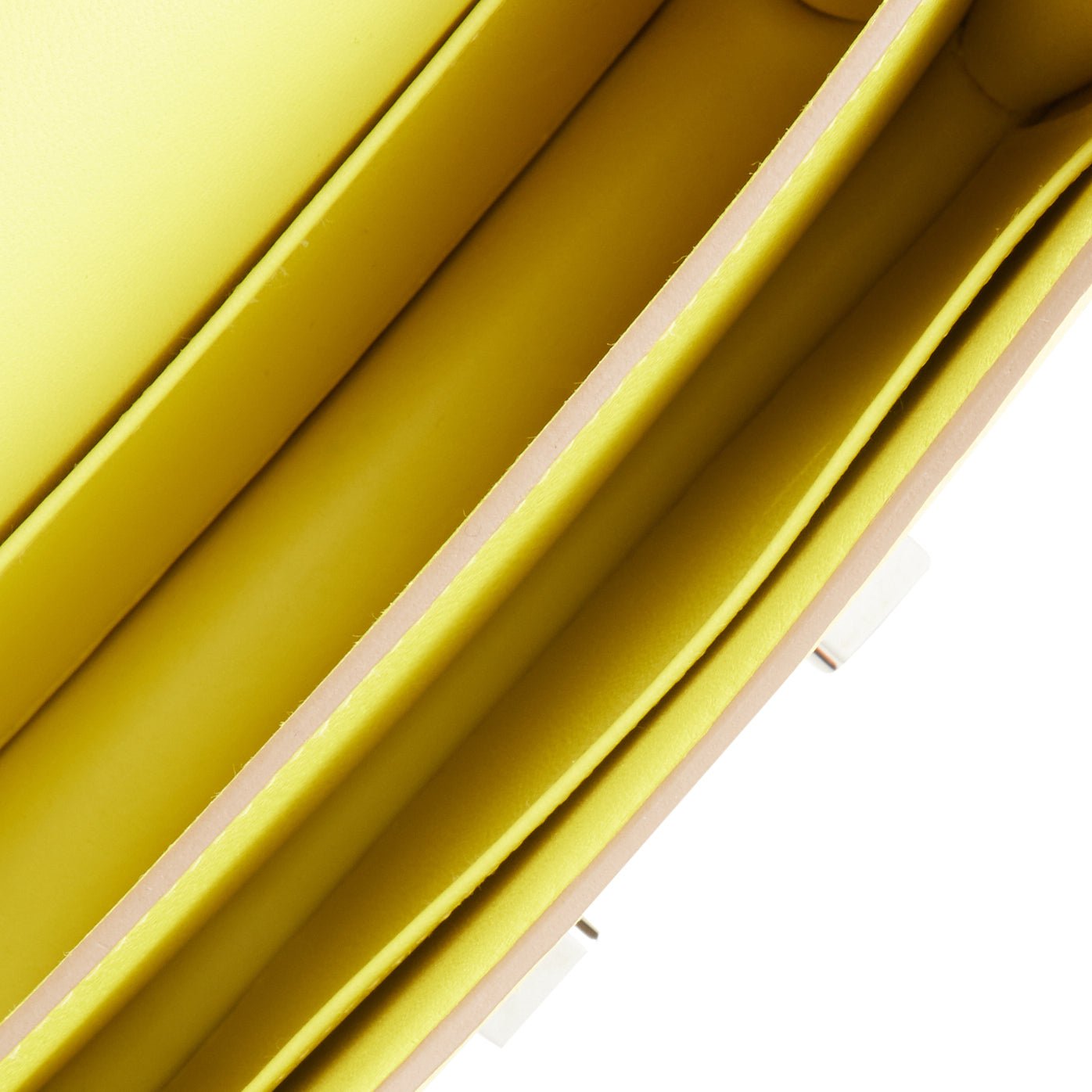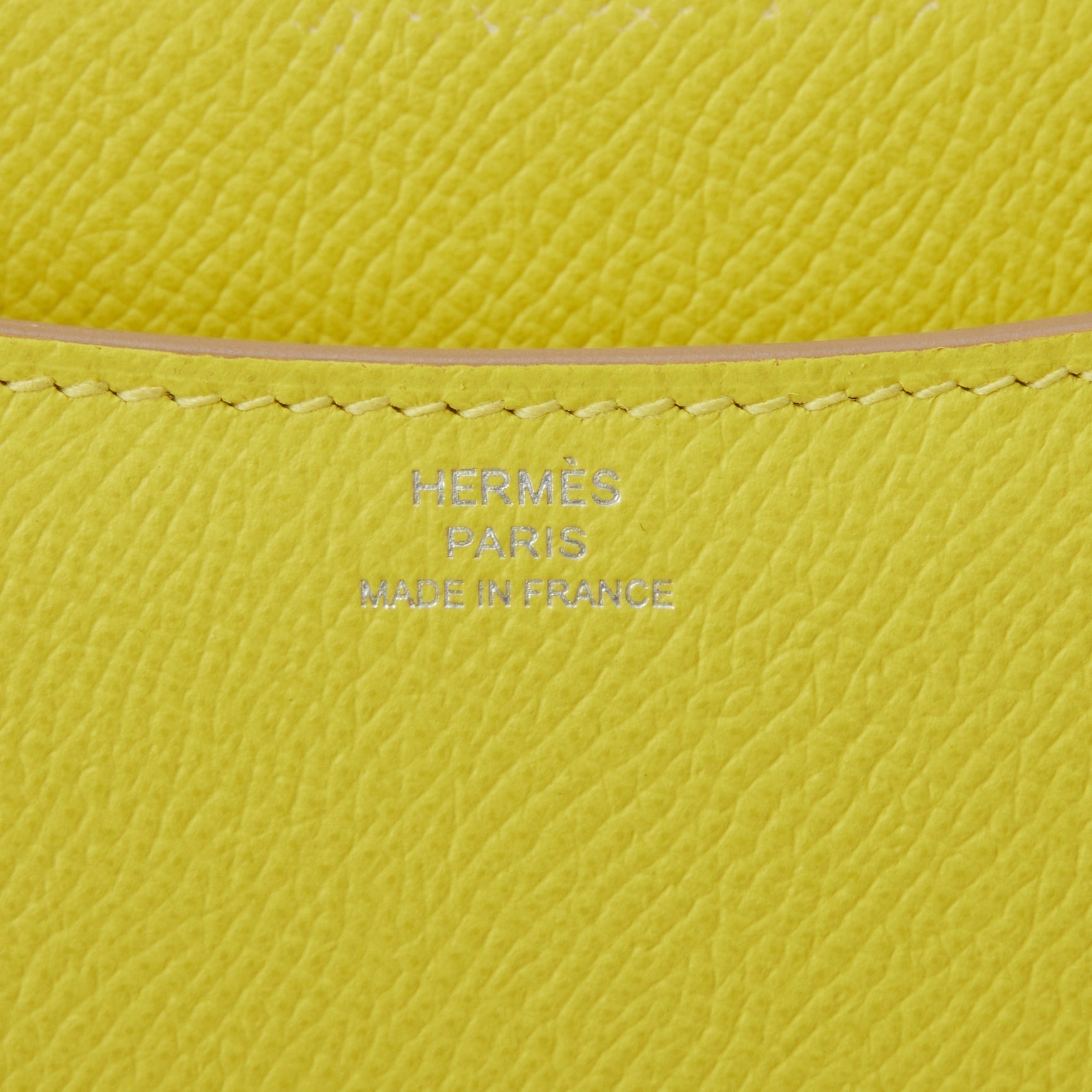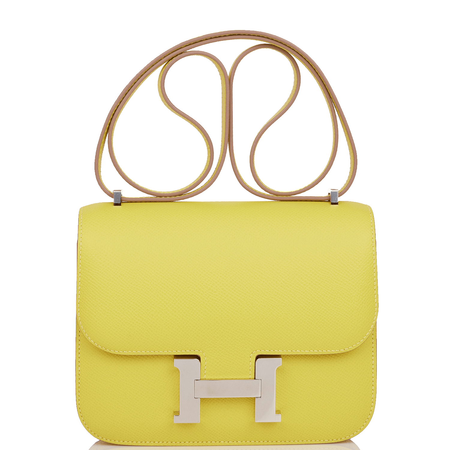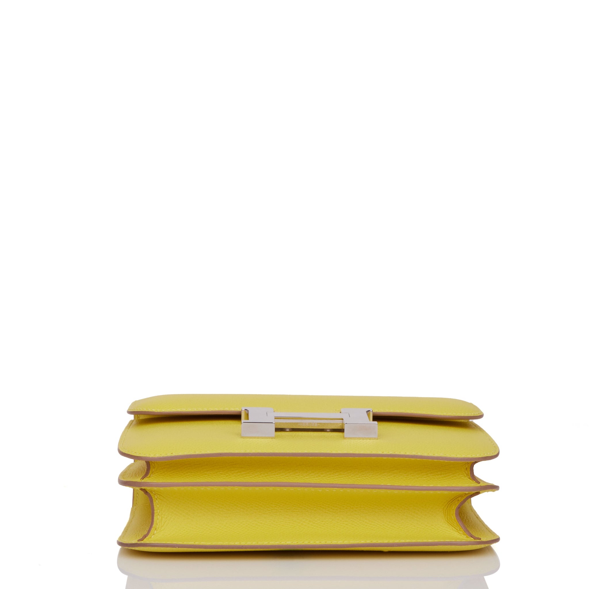 This Constance is in Lime epsom leather with palladium hardware and has tonal stitching, a metal "H" snap lock closure and adjustable shoulder strap.