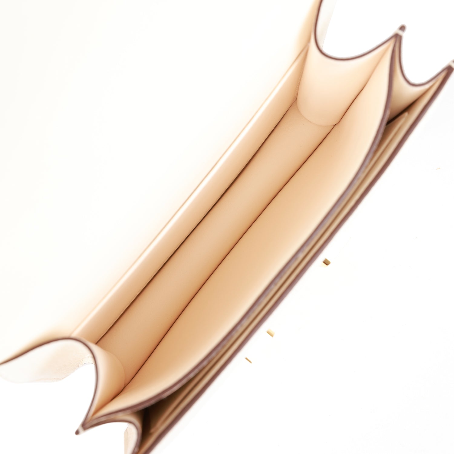The interior is lined with Nata lambskin and has an open pocket on the front wall, a center divide, and a slit pocket on the back wall.