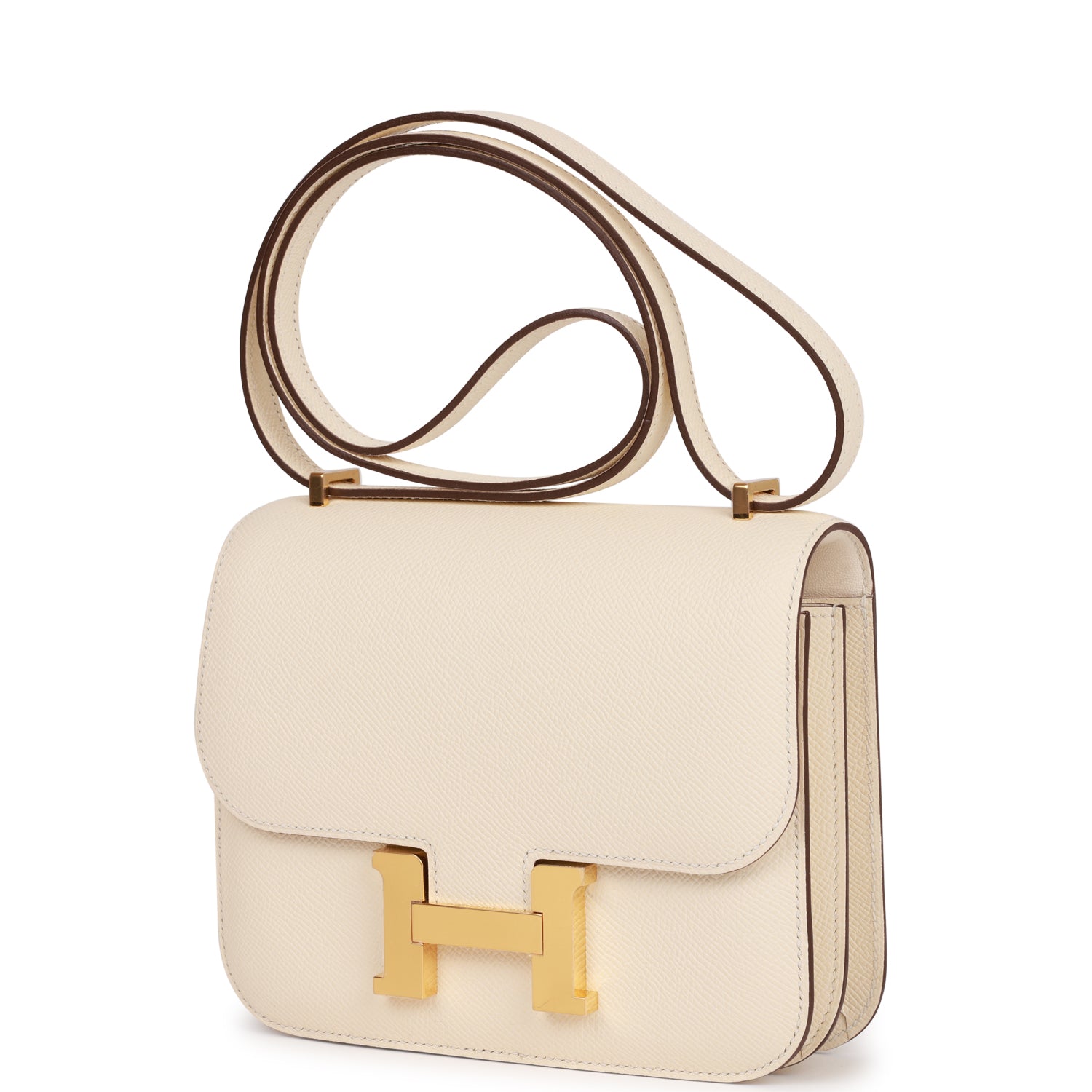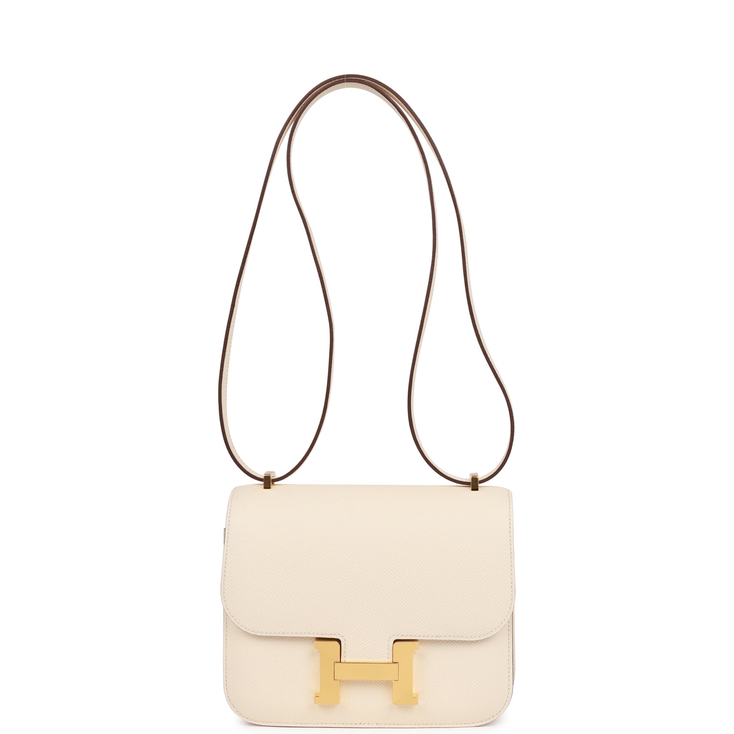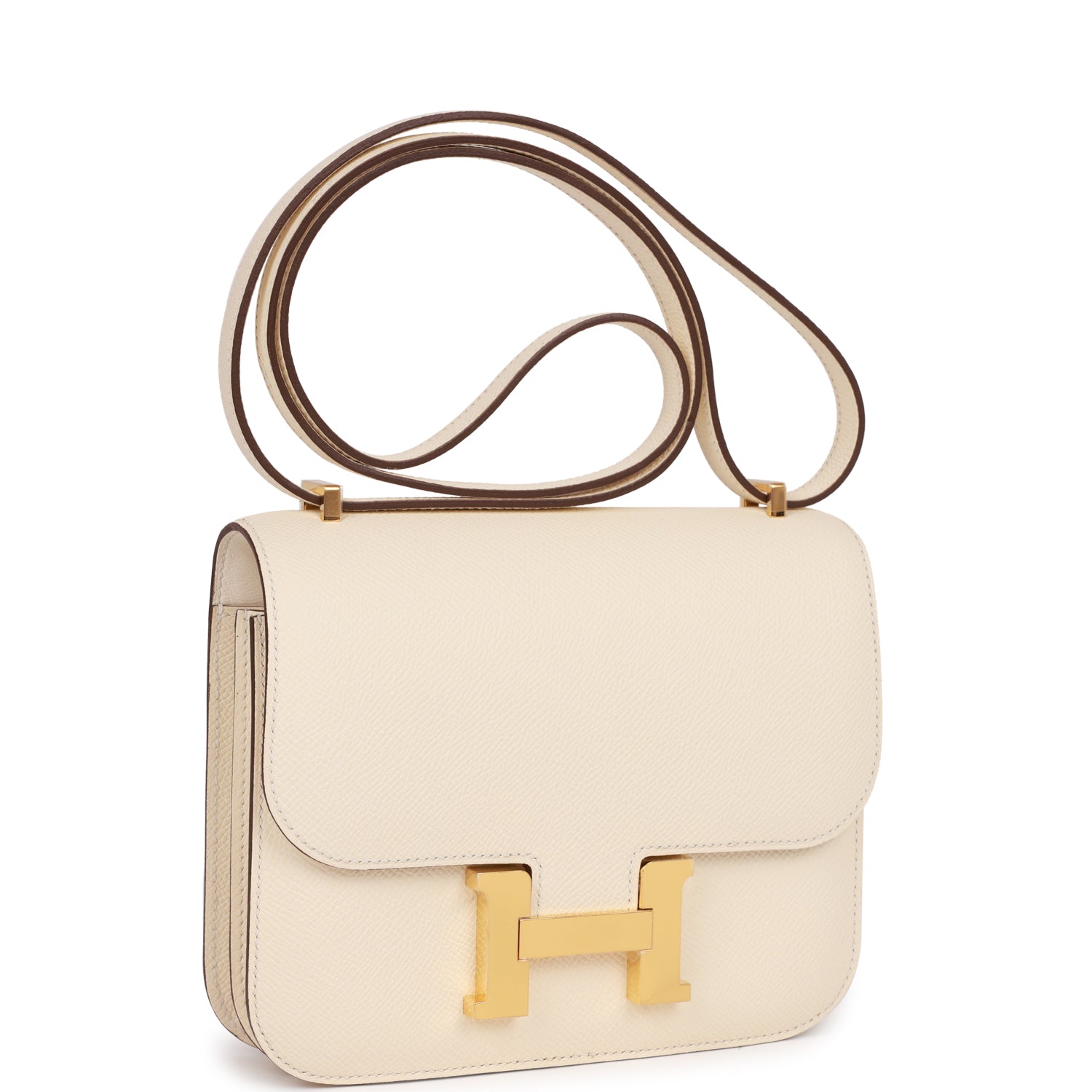 This Constance is in Nata epsom leather with gold hardware and has tonal stitching, a metal "H" snap lock closure and adjustable shoulder strap.