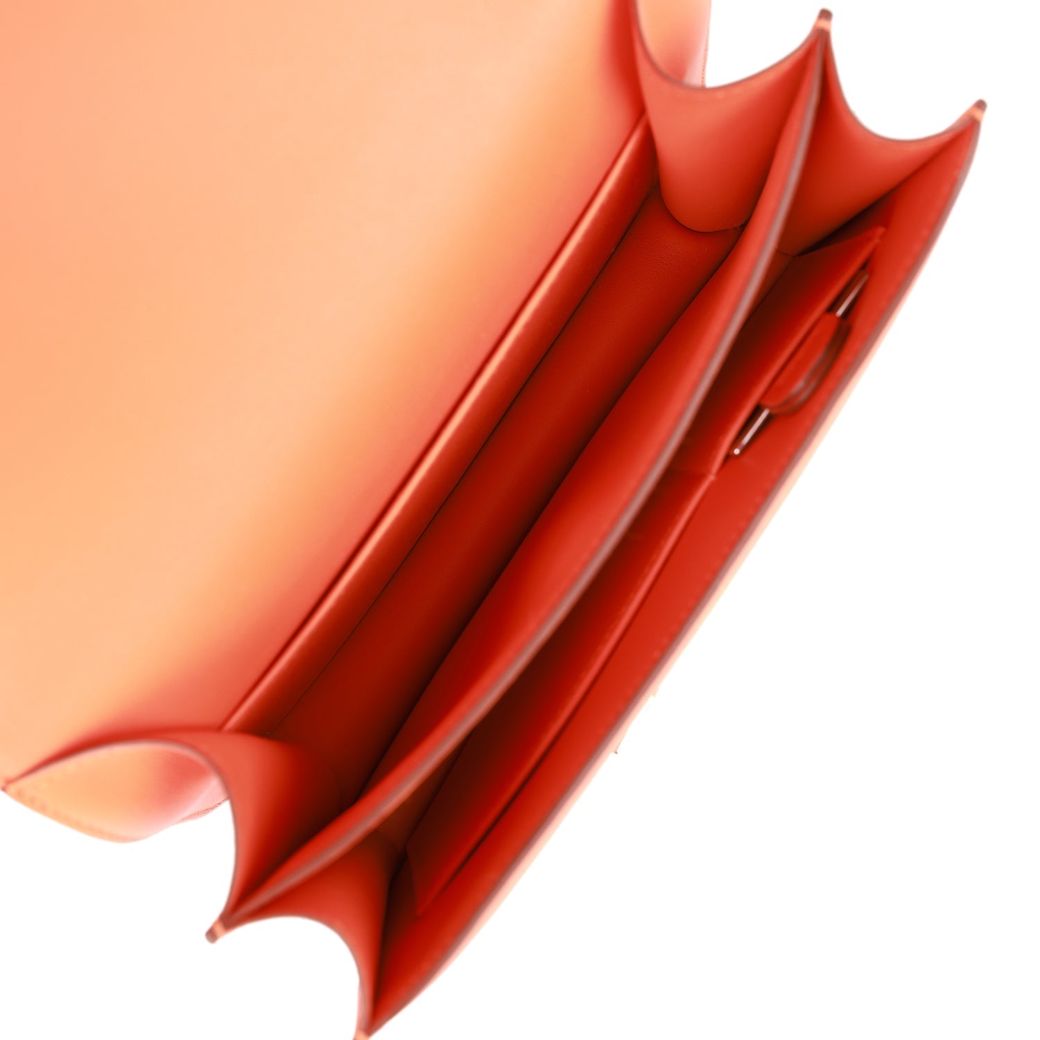 The interior is lined with Orange lambskin and has an open pocket on the front wall, a center divide, removable mirror and a slit pocket on the back wall.