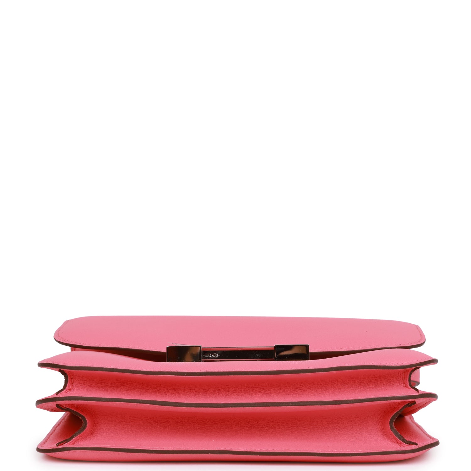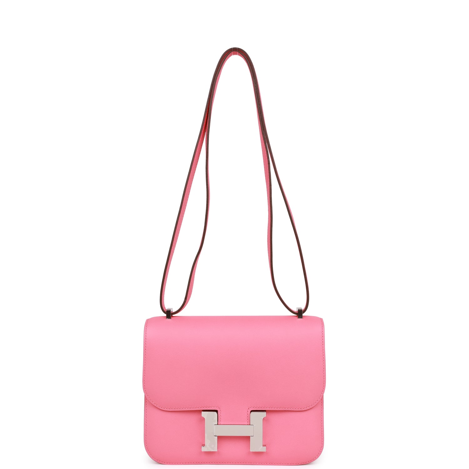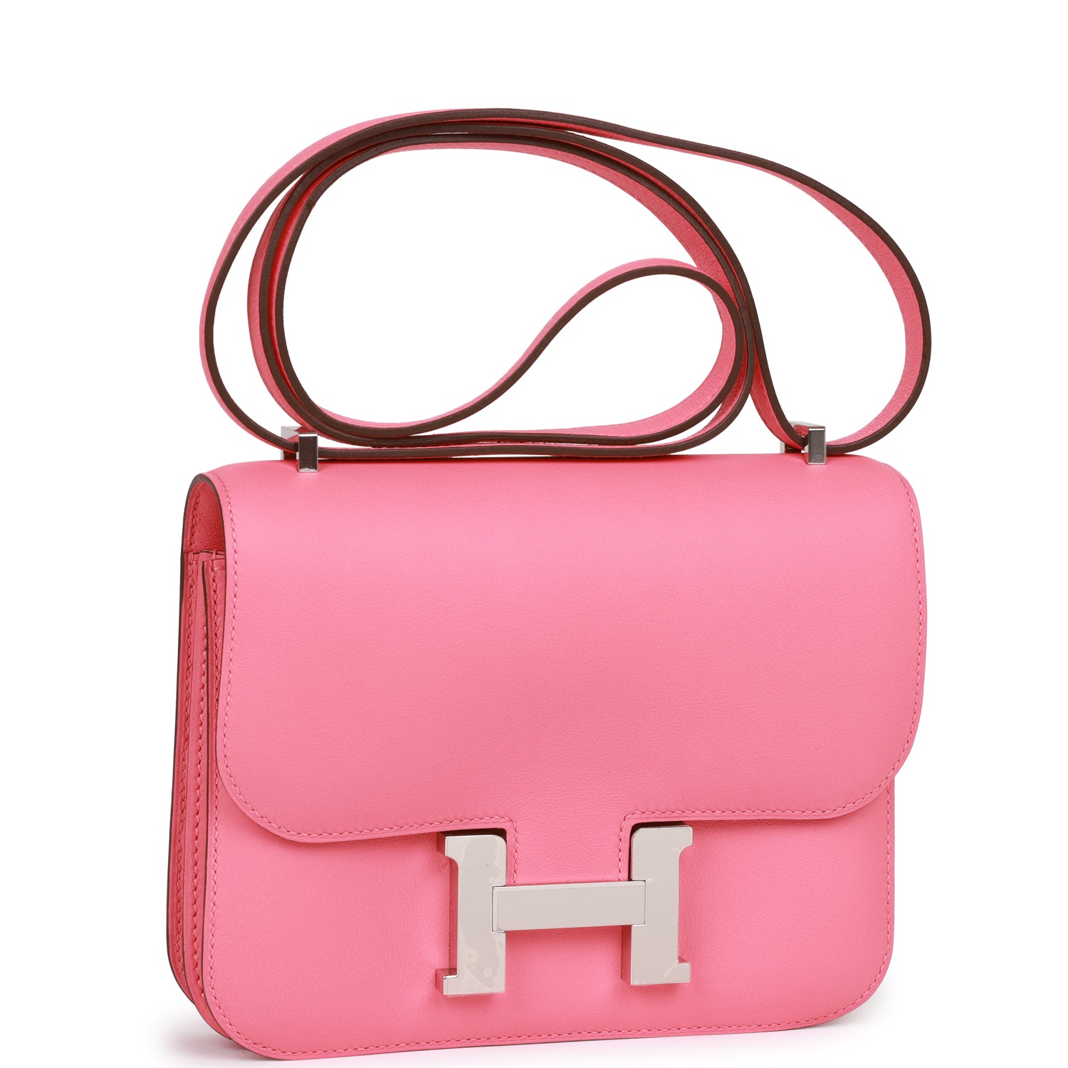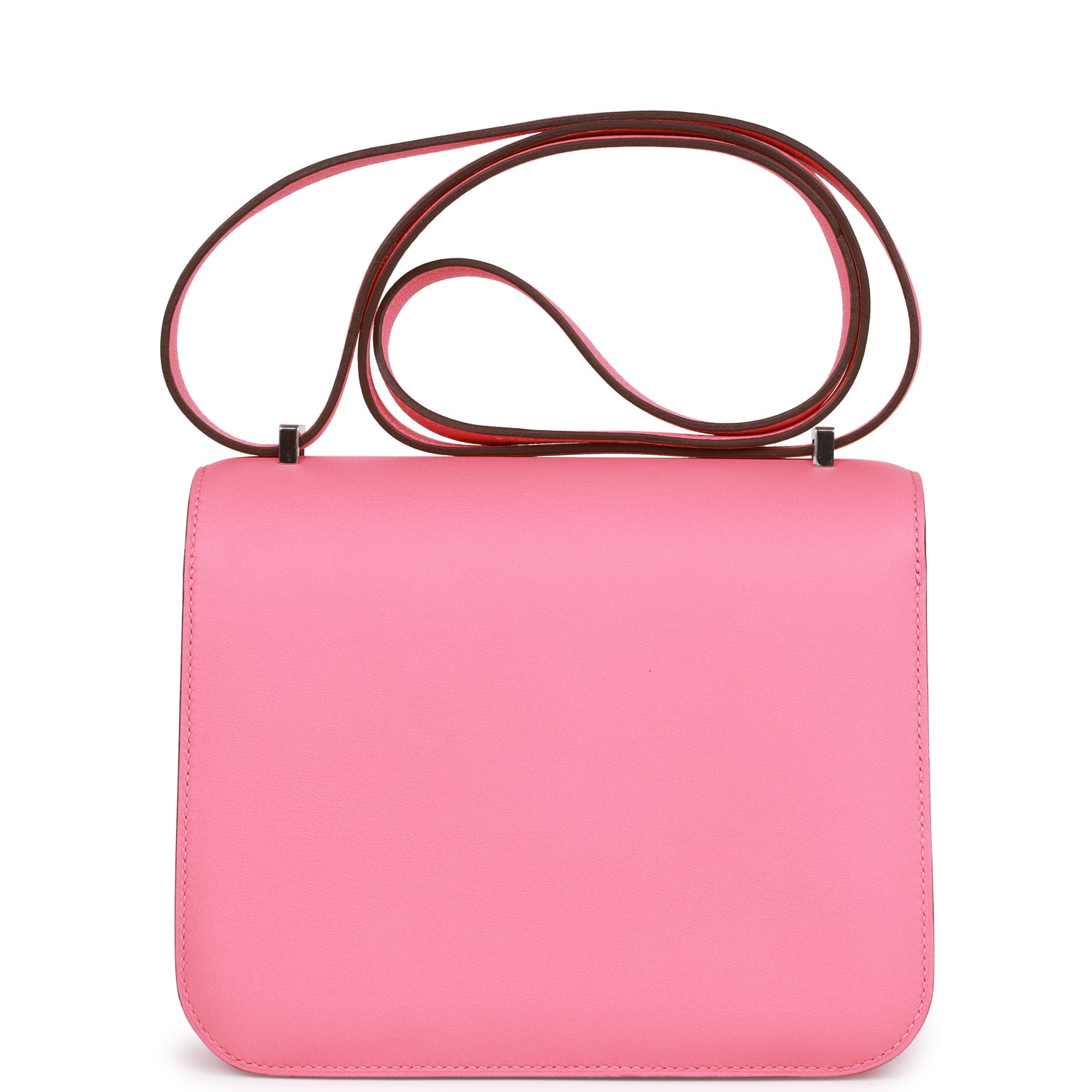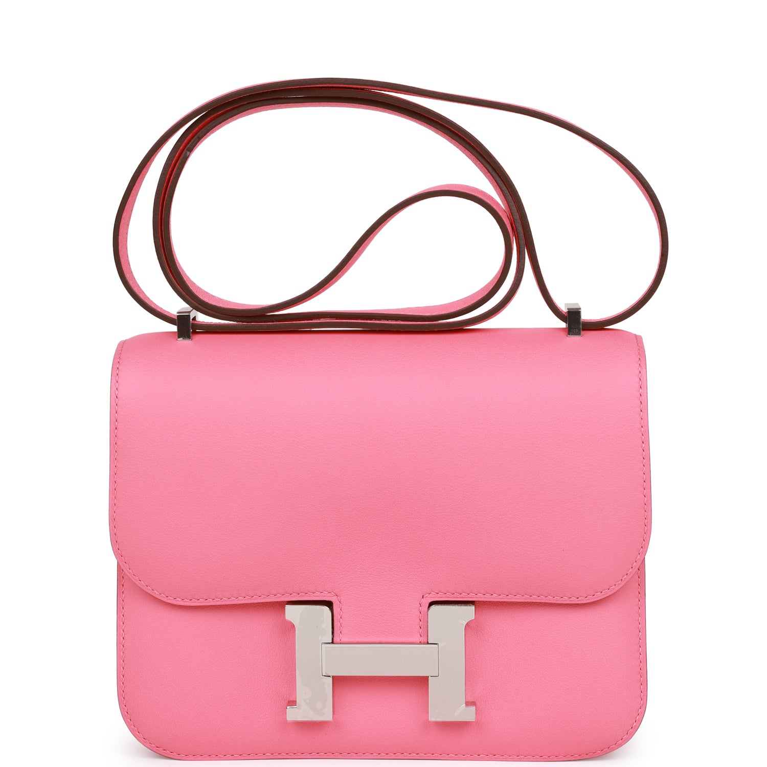 This Constance is in Rose Azalee swift leather with palladium hardware and has tonal stitching, a metal "H" snap lock closure and adjustable shoulder strap.