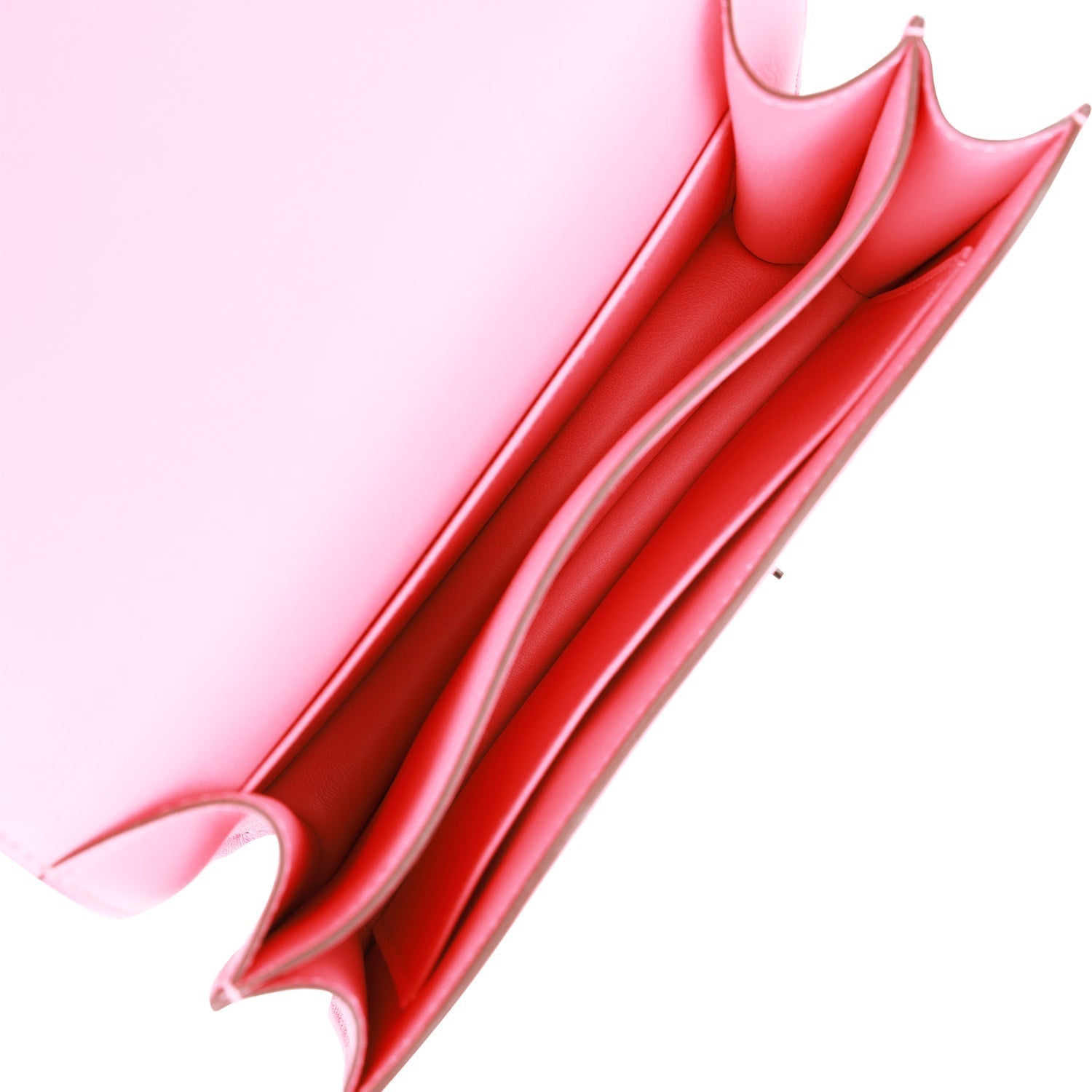 The interior is lined with Rose Azalee lambskin and has an open pocket on the front wall, a center divide, and a slit pocket on the back wall.
