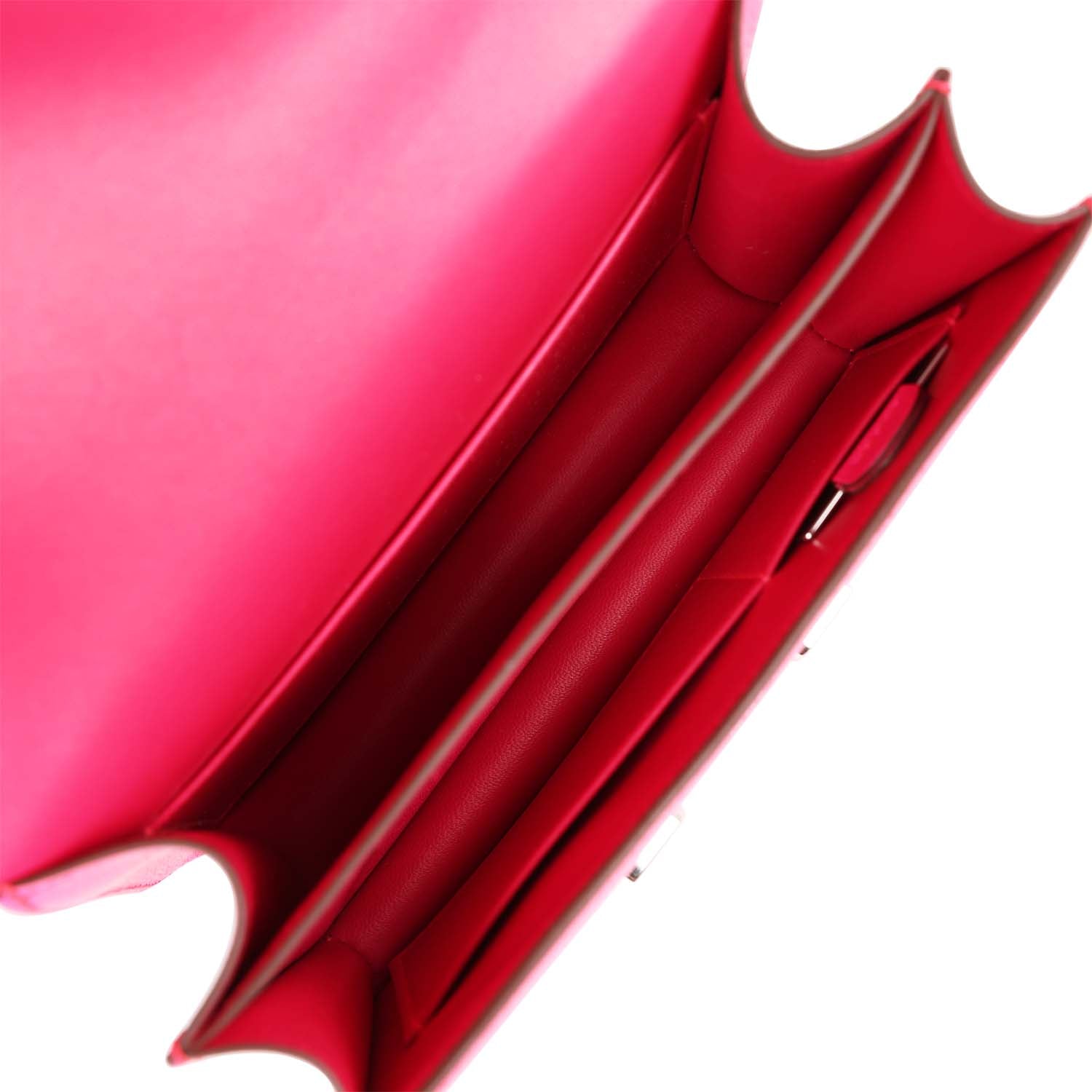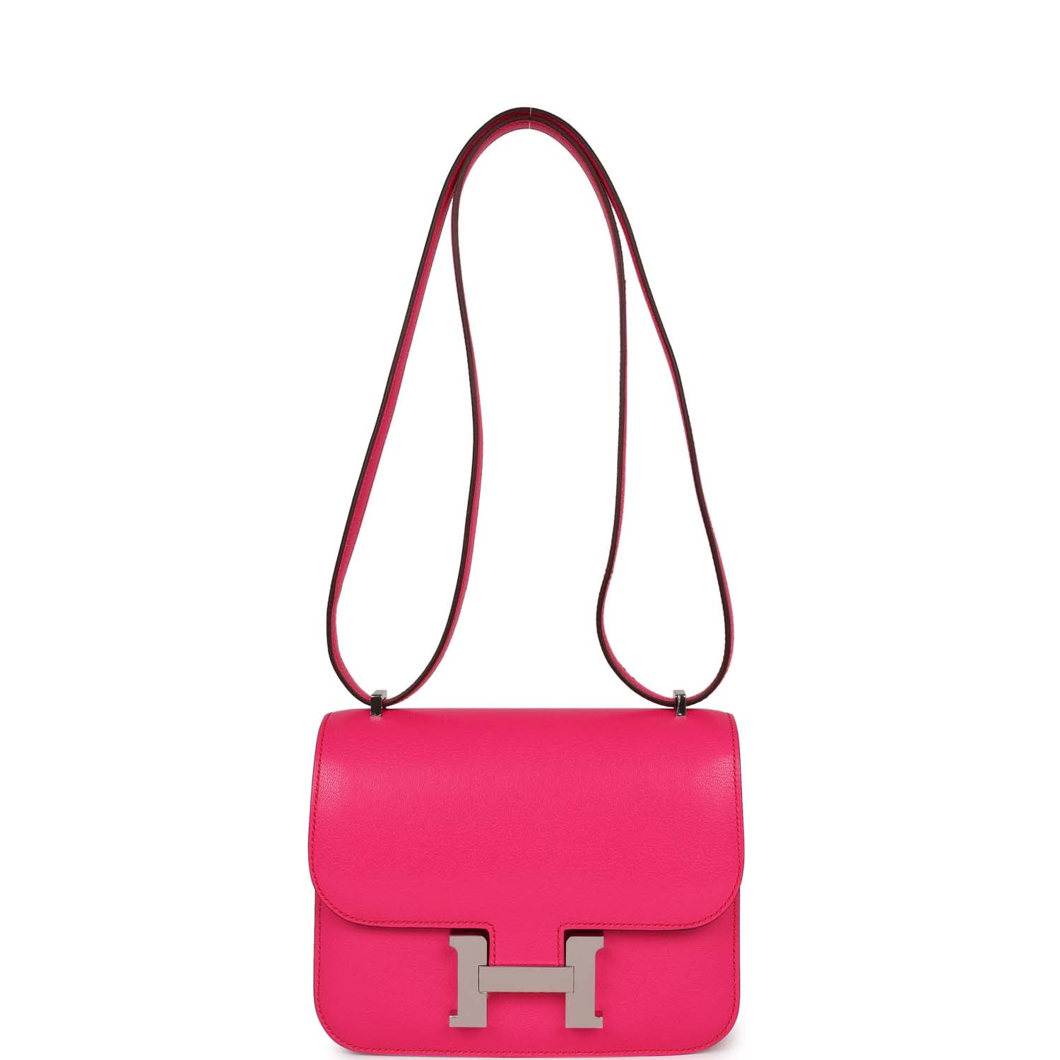 This Constance is in Rose Pop chevre chamkila leather with Palladium hardware and has tonal stitching, a metal "H" snap lock closure and adjustable shoulder strap.